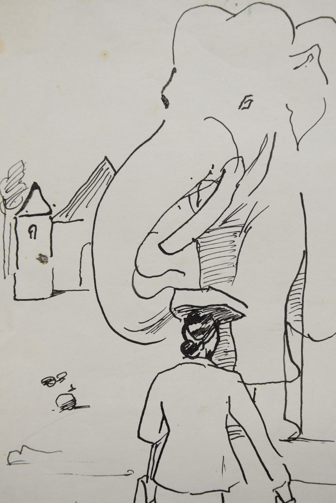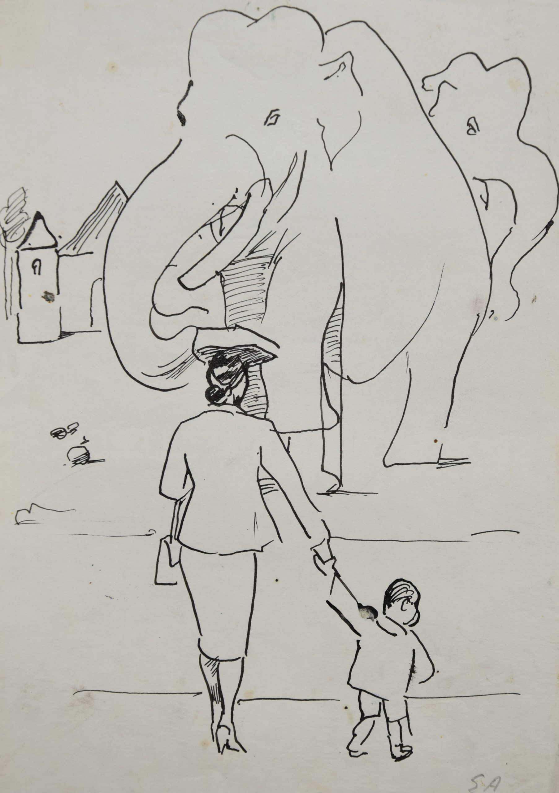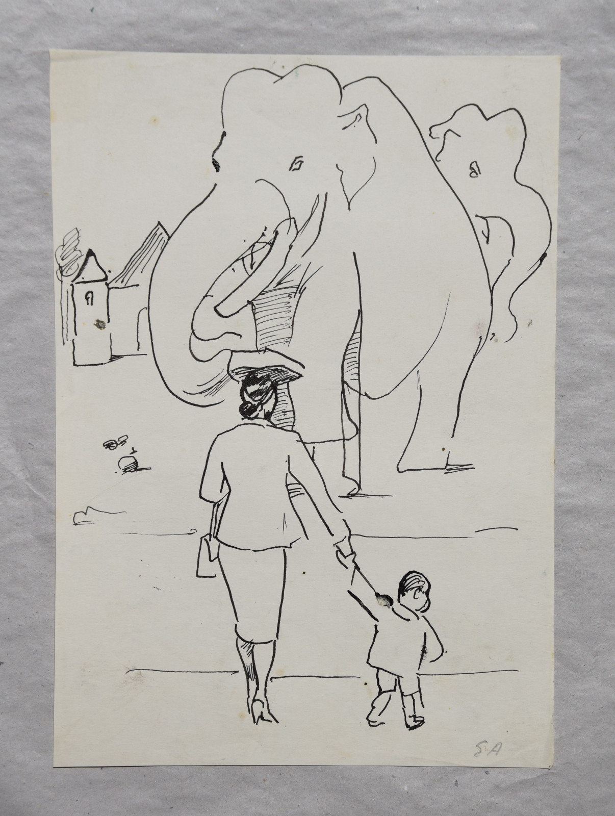 zwei Elefanten in einem Tierpark mit zwei Besuchern (Mutter und Kind) im Vordergrund (o.J.)