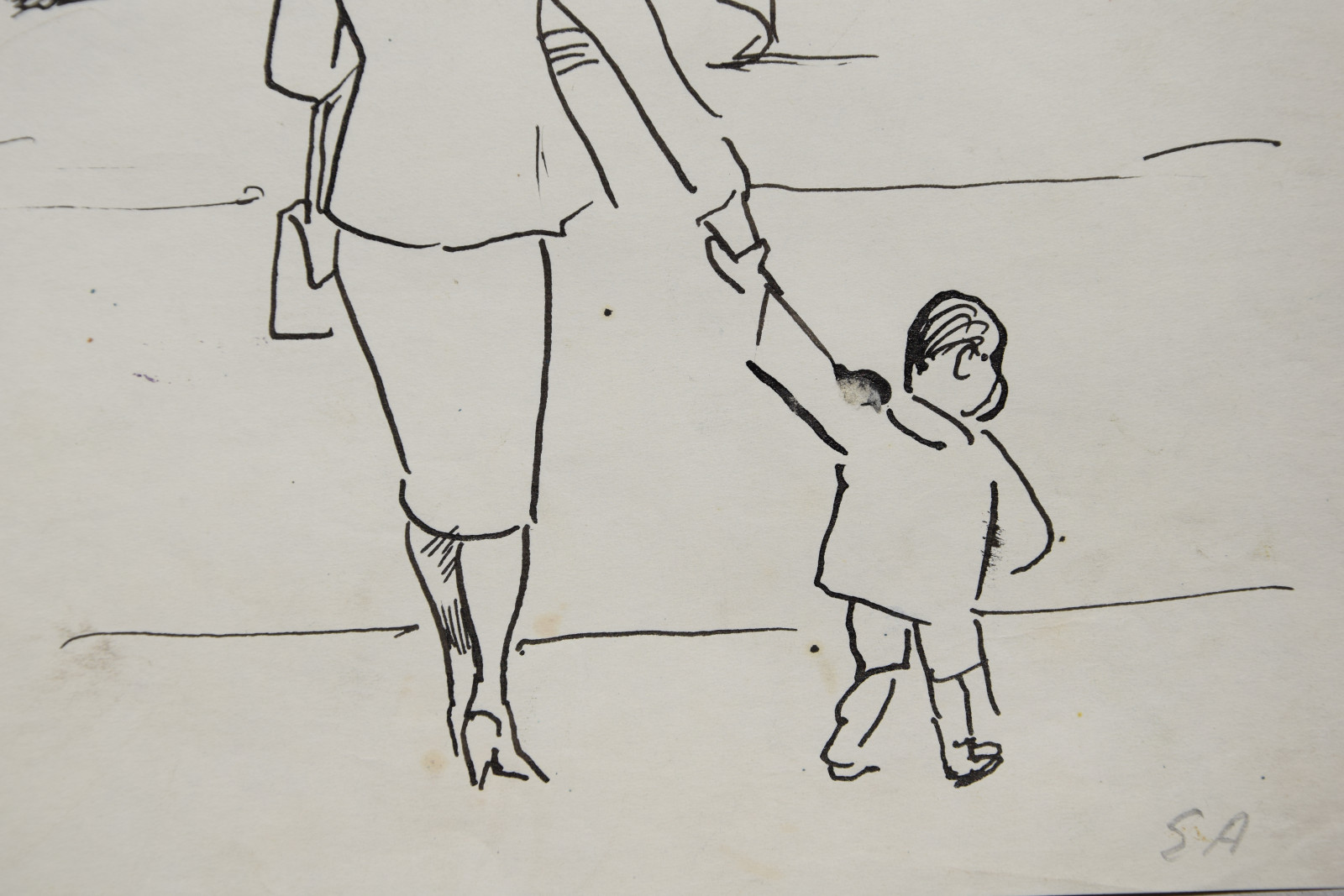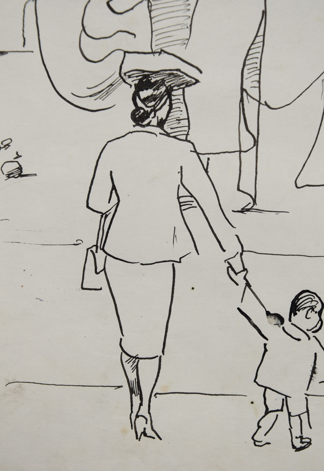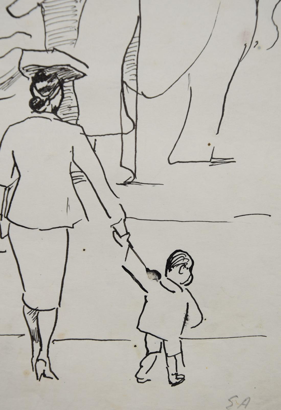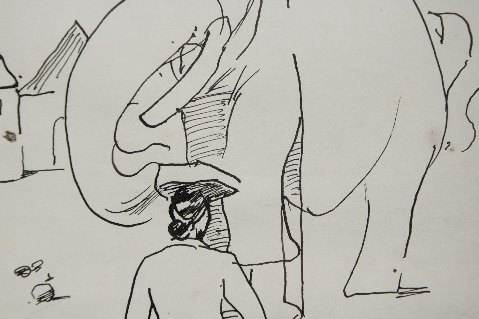 zwei Elefanten in einem Tierpark mit zwei Besuchern (Mutter und Kind) im Vordergrund (o.J.)