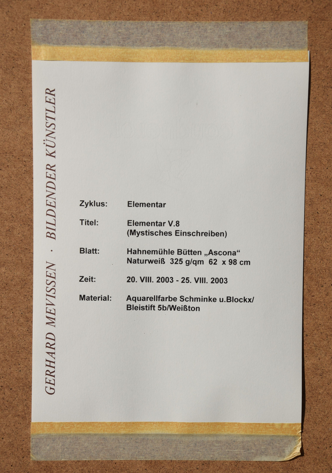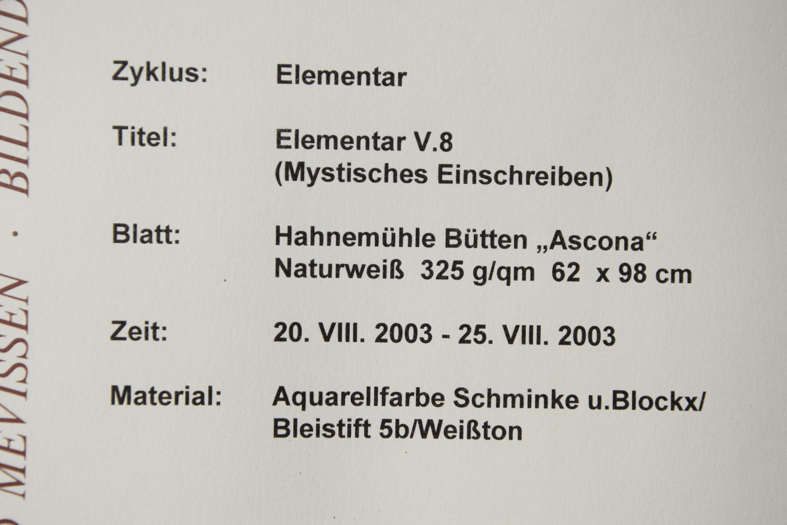 „Elementar I.5.8 (‚Mystisches Einschreiben‘)“ (aus dem Zyklus: „Elementar“) [so betitelt verso auf aufgeklebtem Künstlerzettel, sowie unten rechts in Blei bezeichnet „E. V. 8“]
