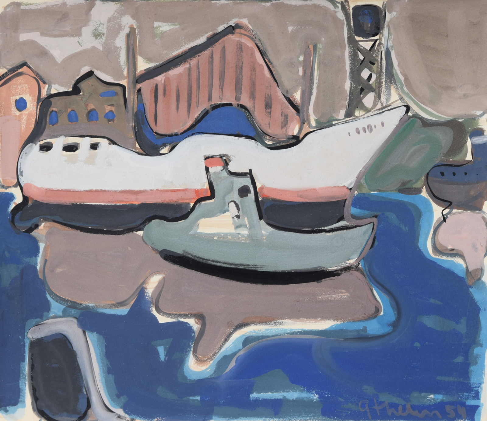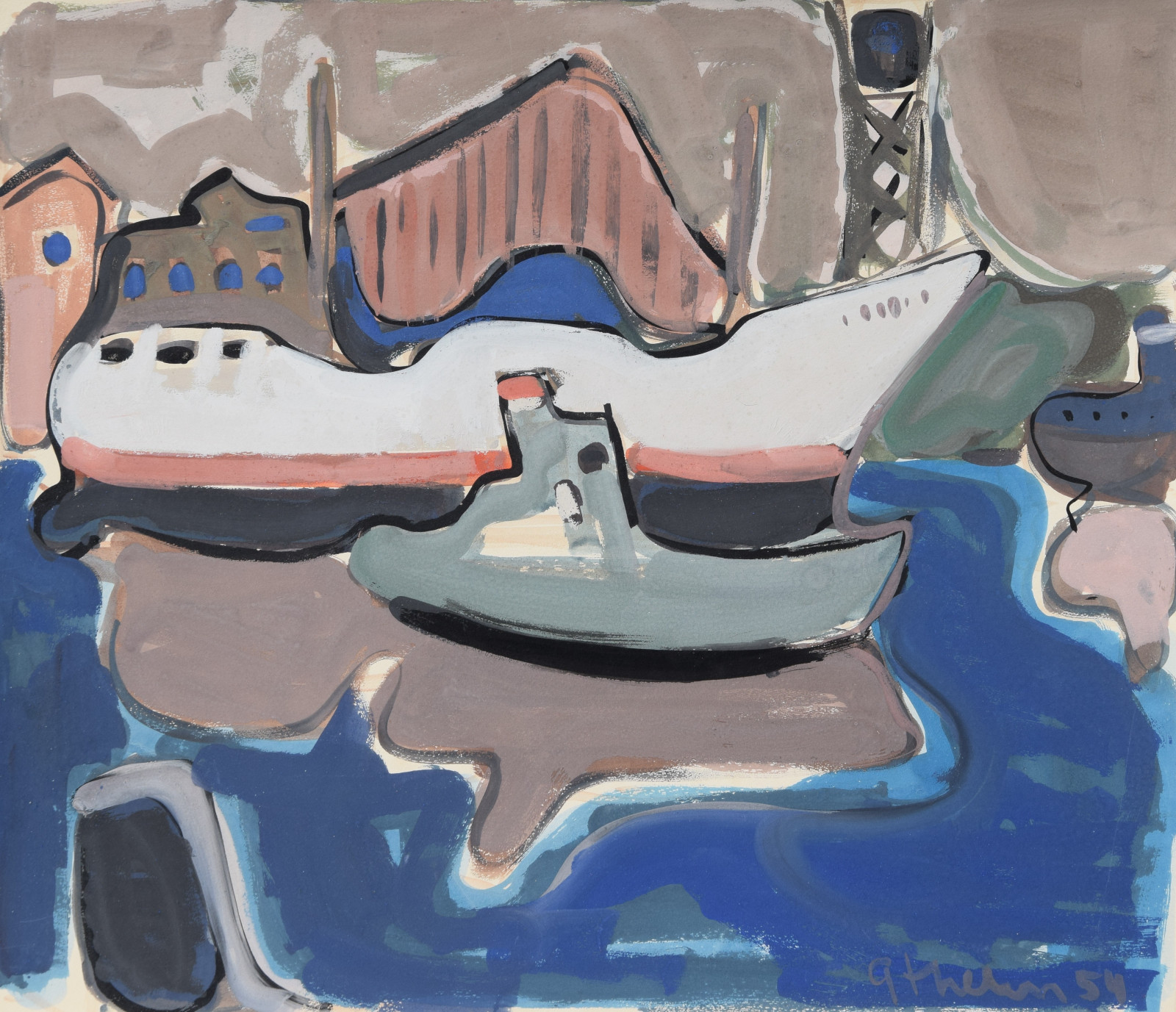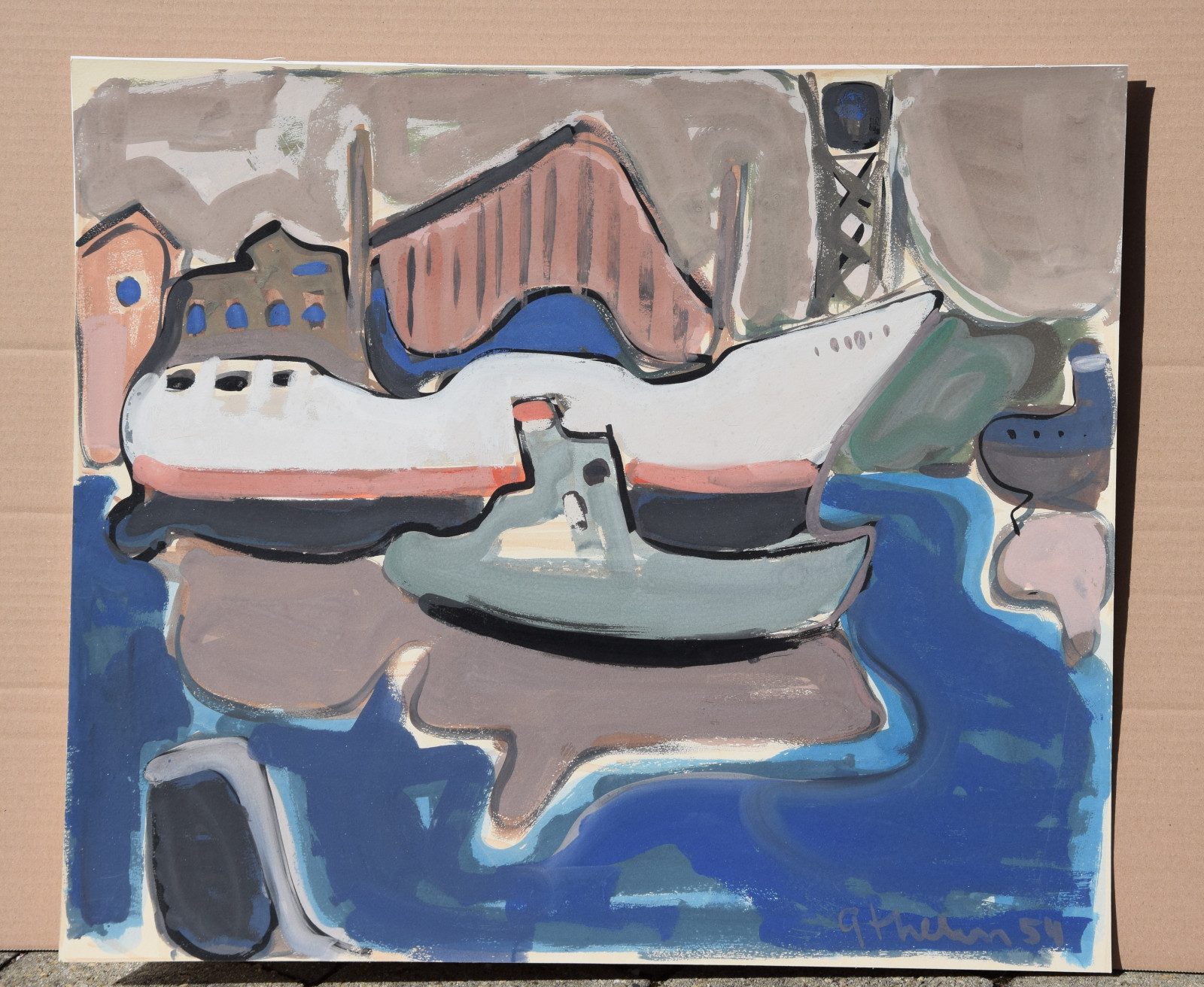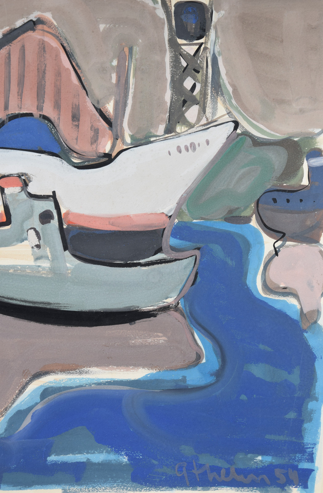 Das vorliegende Werk ist noch in die frühe Schaffensphase Gerhard Thelens einzuordnen, zeigt aber bereits die für Thelen ganz typische gedämpfte, flächige Farbigkeit mit dem markanten Dunkelblau, wie auch den geschwungenen Konturen. Das gezeigte Hafenmotiv wird nach Oldenburg zu lokalisieren sein.
