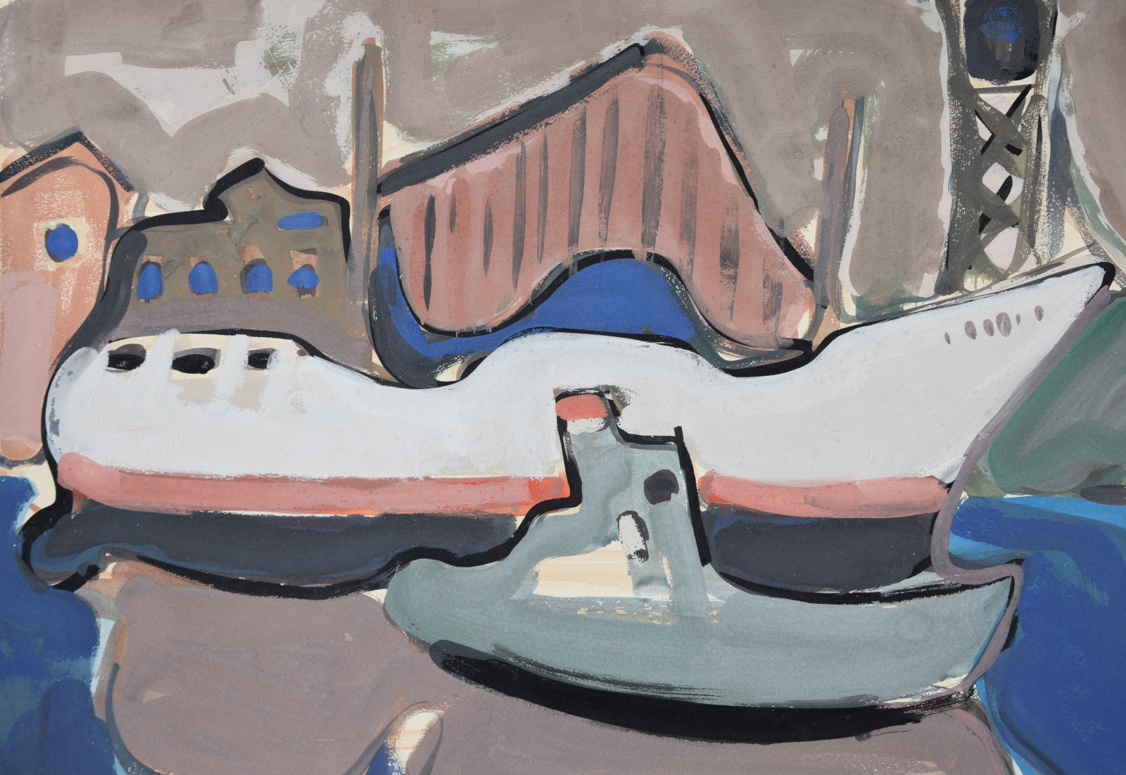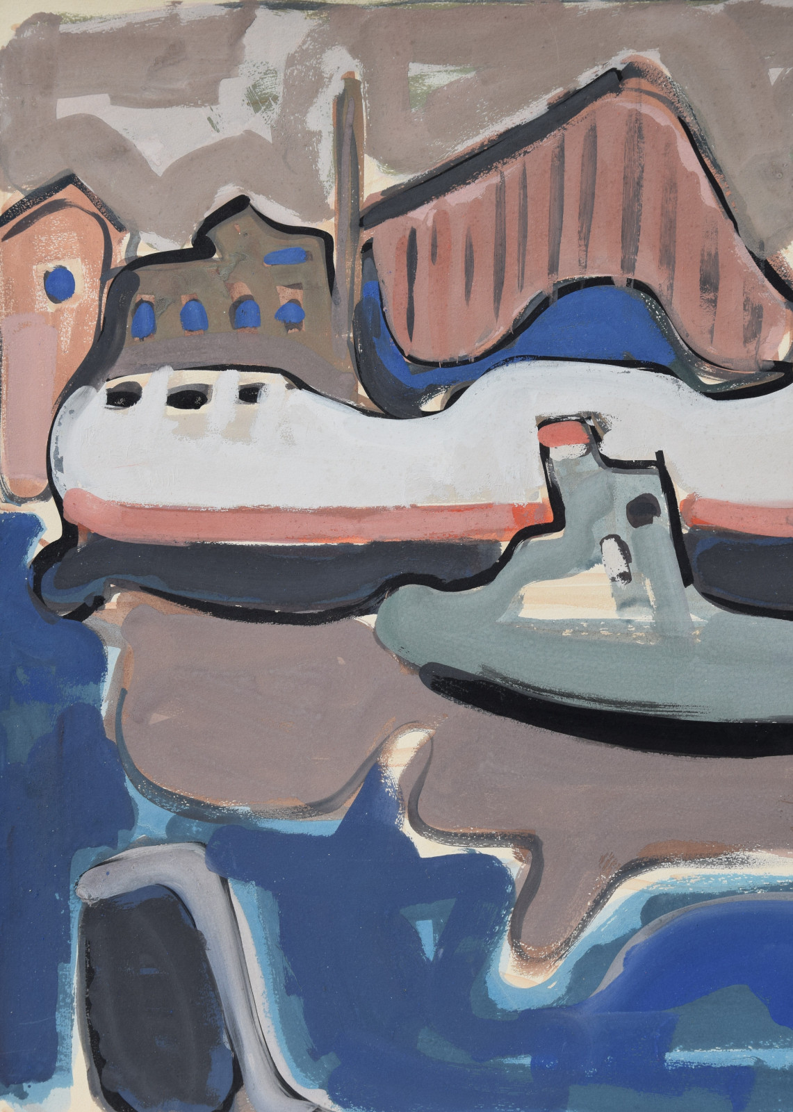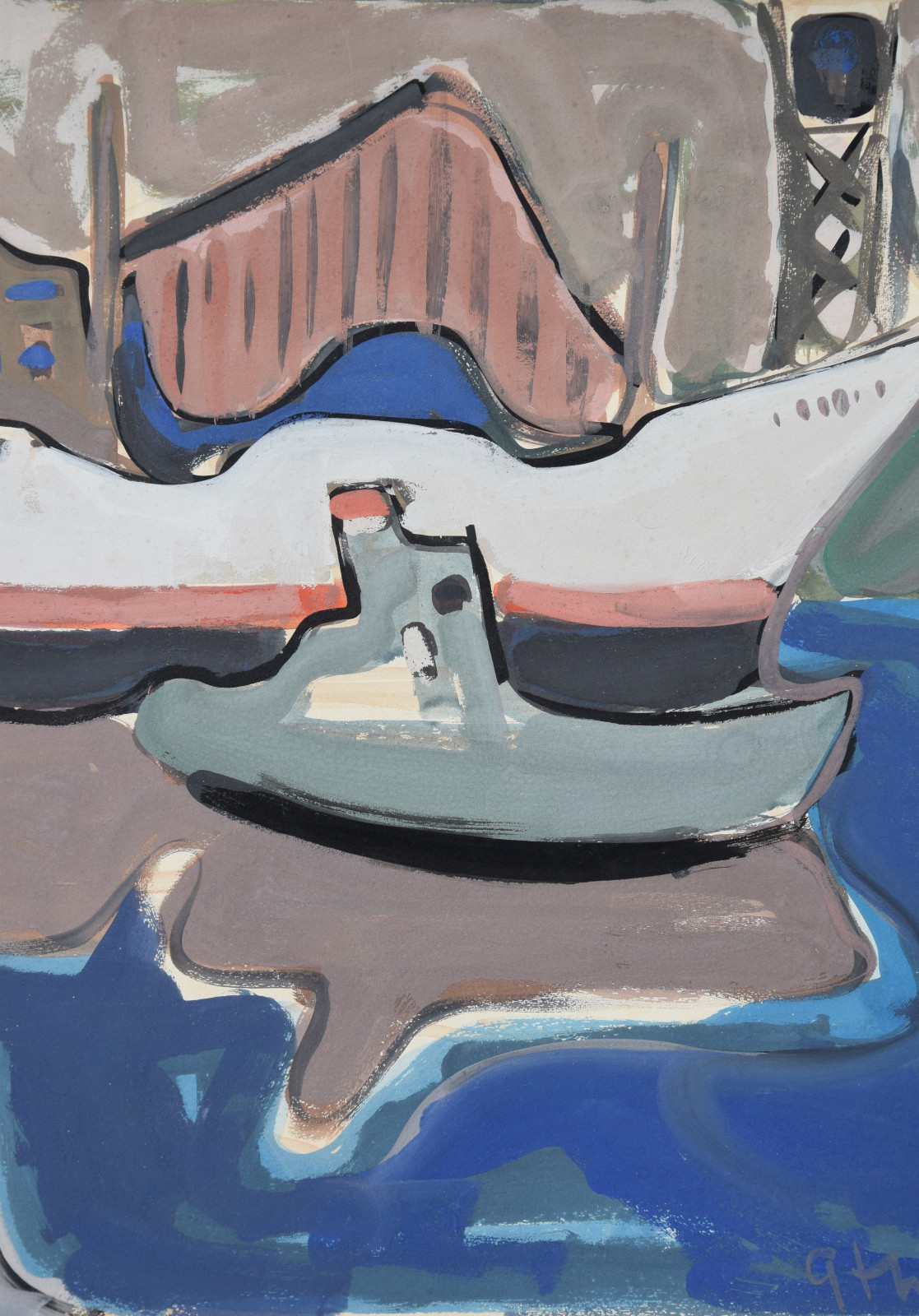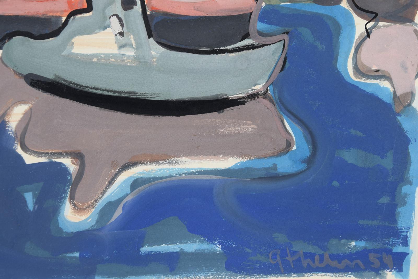 Das vorliegende Werk ist noch in die frühe Schaffensphase Gerhard Thelens einzuordnen, zeigt aber bereits die für Thelen ganz typische gedämpfte, flächige Farbigkeit mit dem markanten Dunkelblau, wie auch den geschwungenen Konturen. Das gezeigte Hafenmotiv wird nach Oldenburg zu lokalisieren sein.