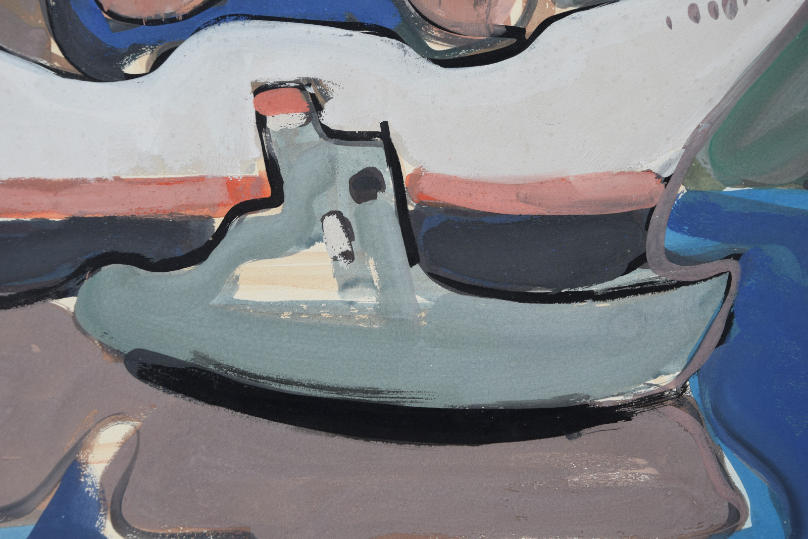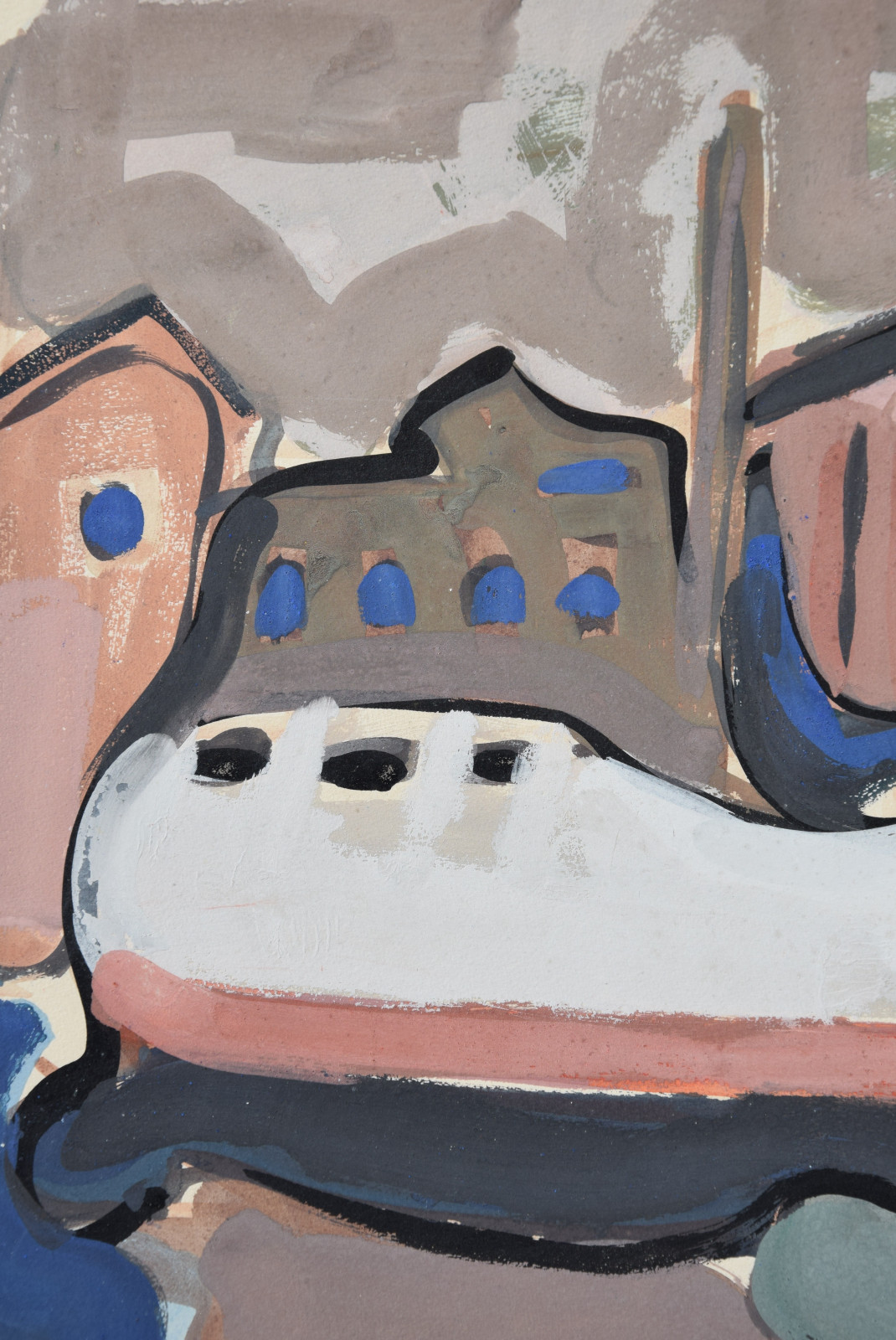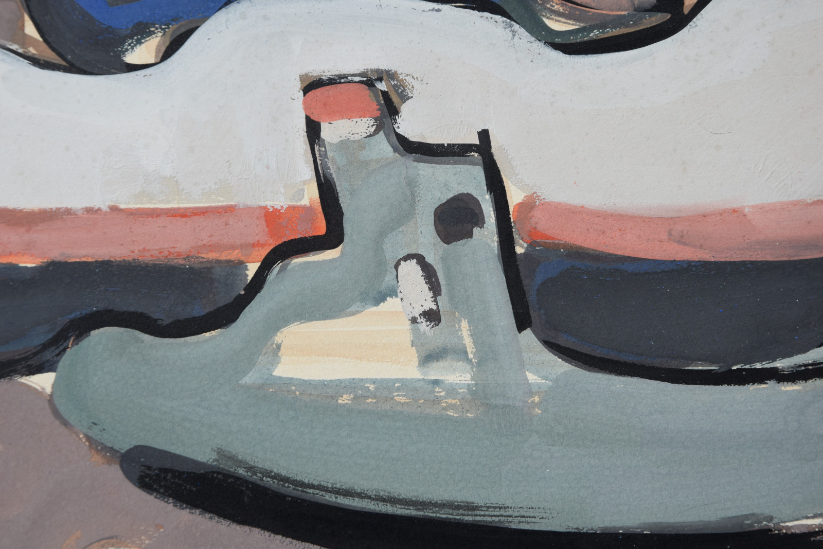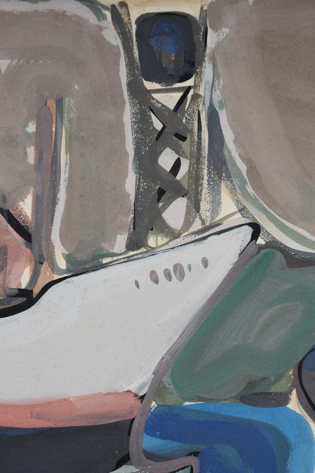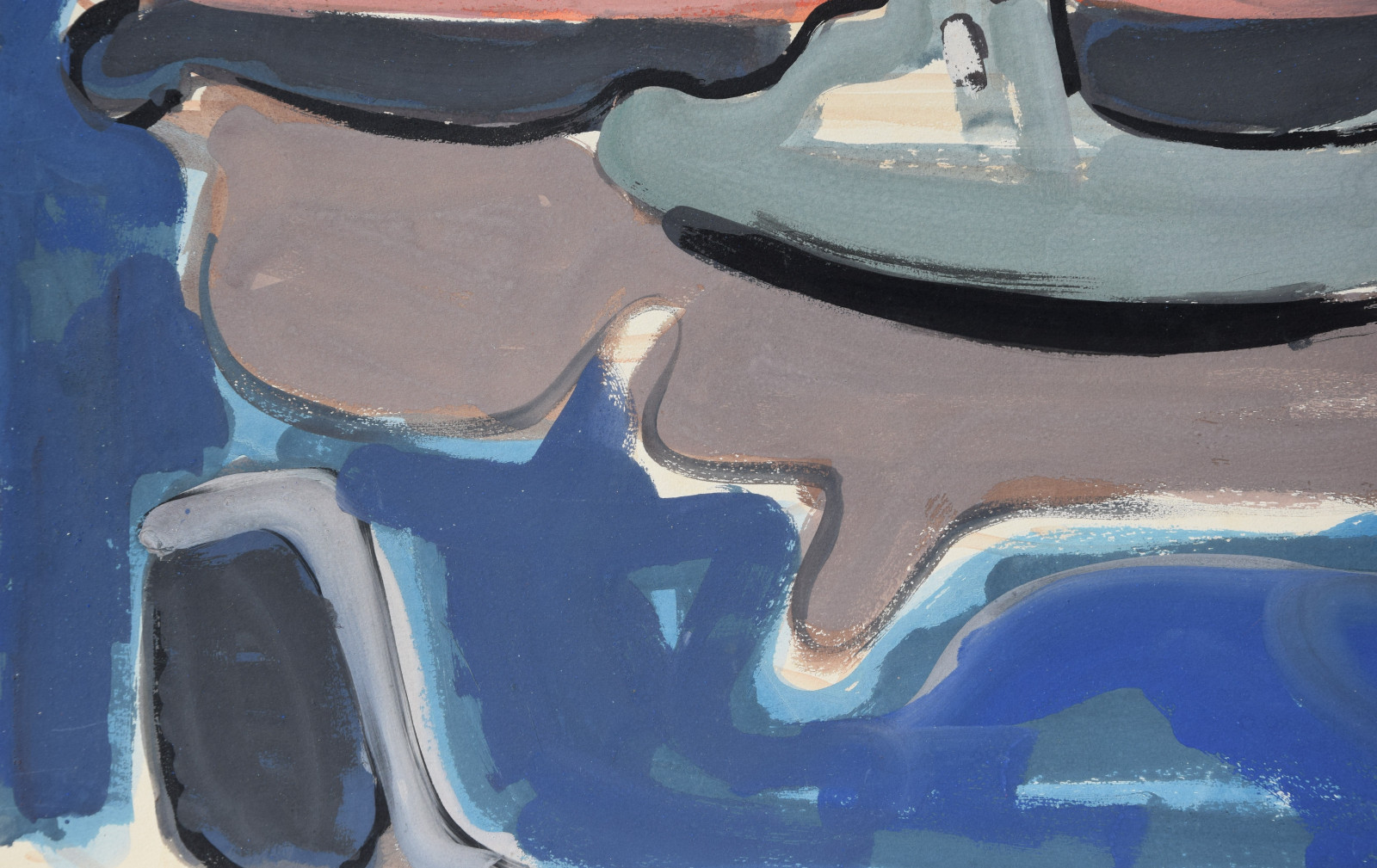 Das vorliegende Werk ist noch in die frühe Schaffensphase Gerhard Thelens einzuordnen, zeigt aber bereits die für Thelen ganz typische gedämpfte, flächige Farbigkeit mit dem markanten Dunkelblau, wie auch den geschwungenen Konturen. Das gezeigte Hafenmotiv wird nach Oldenburg zu lokalisieren sein.