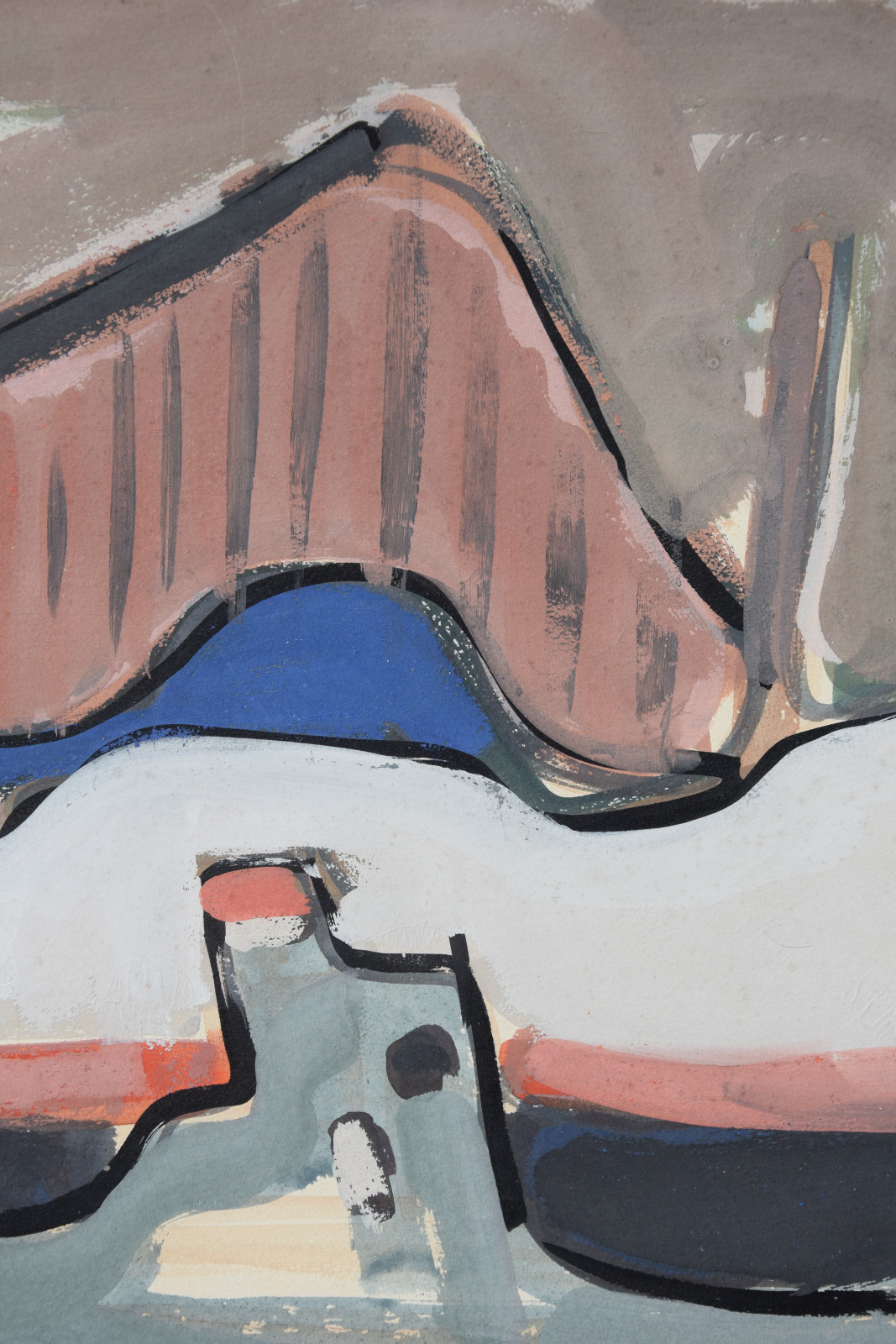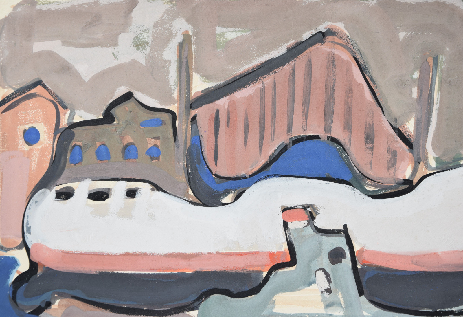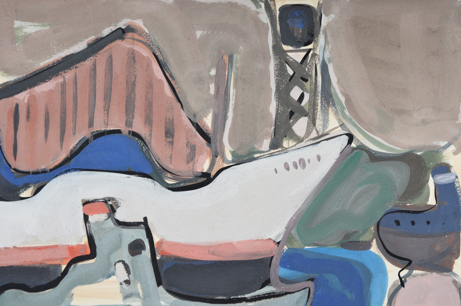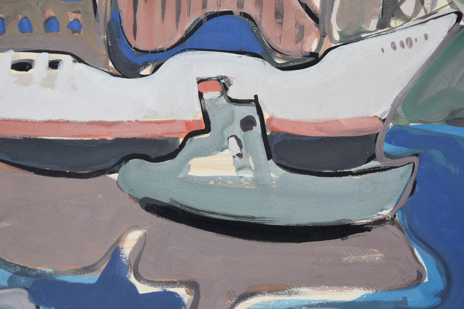 Das vorliegende Werk ist noch in die frühe Schaffensphase Gerhard Thelens einzuordnen, zeigt aber bereits die für Thelen ganz typische gedämpfte, flächige Farbigkeit mit dem markanten Dunkelblau, wie auch den geschwungenen Konturen. Das gezeigte Hafenmotiv wird nach Oldenburg zu lokalisieren sein.