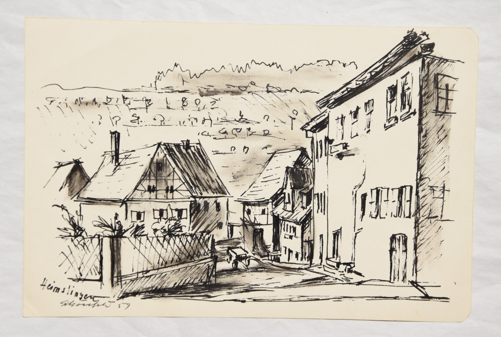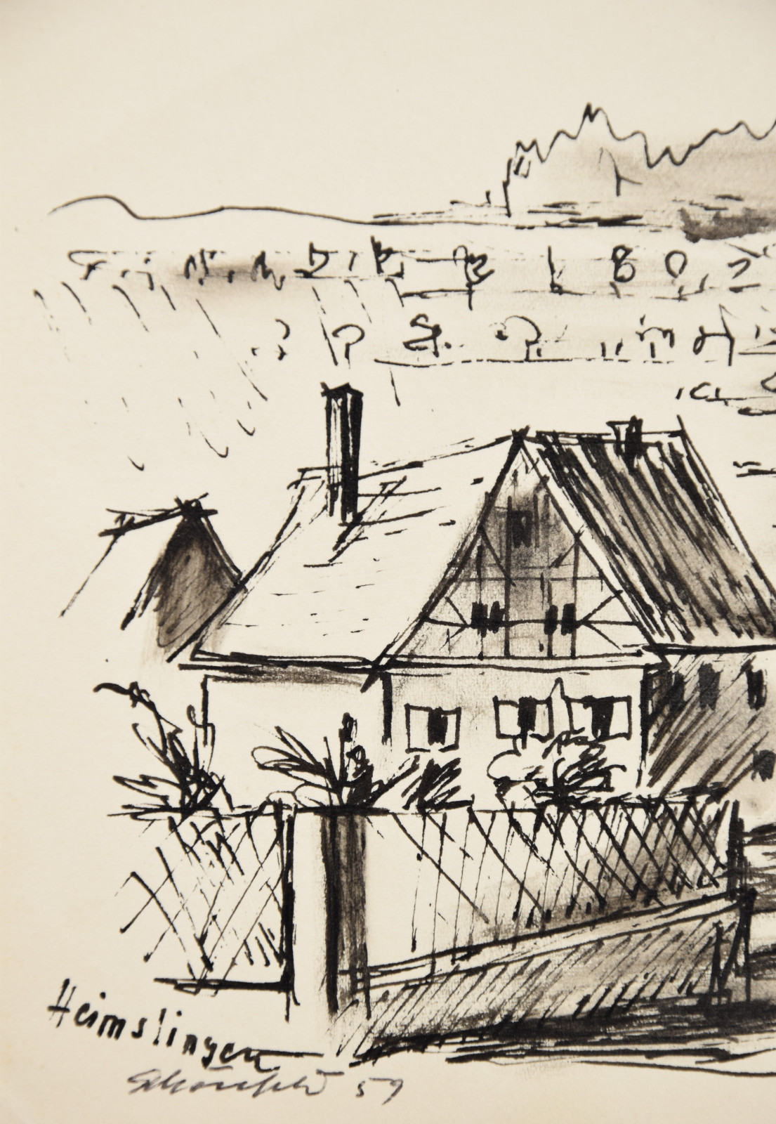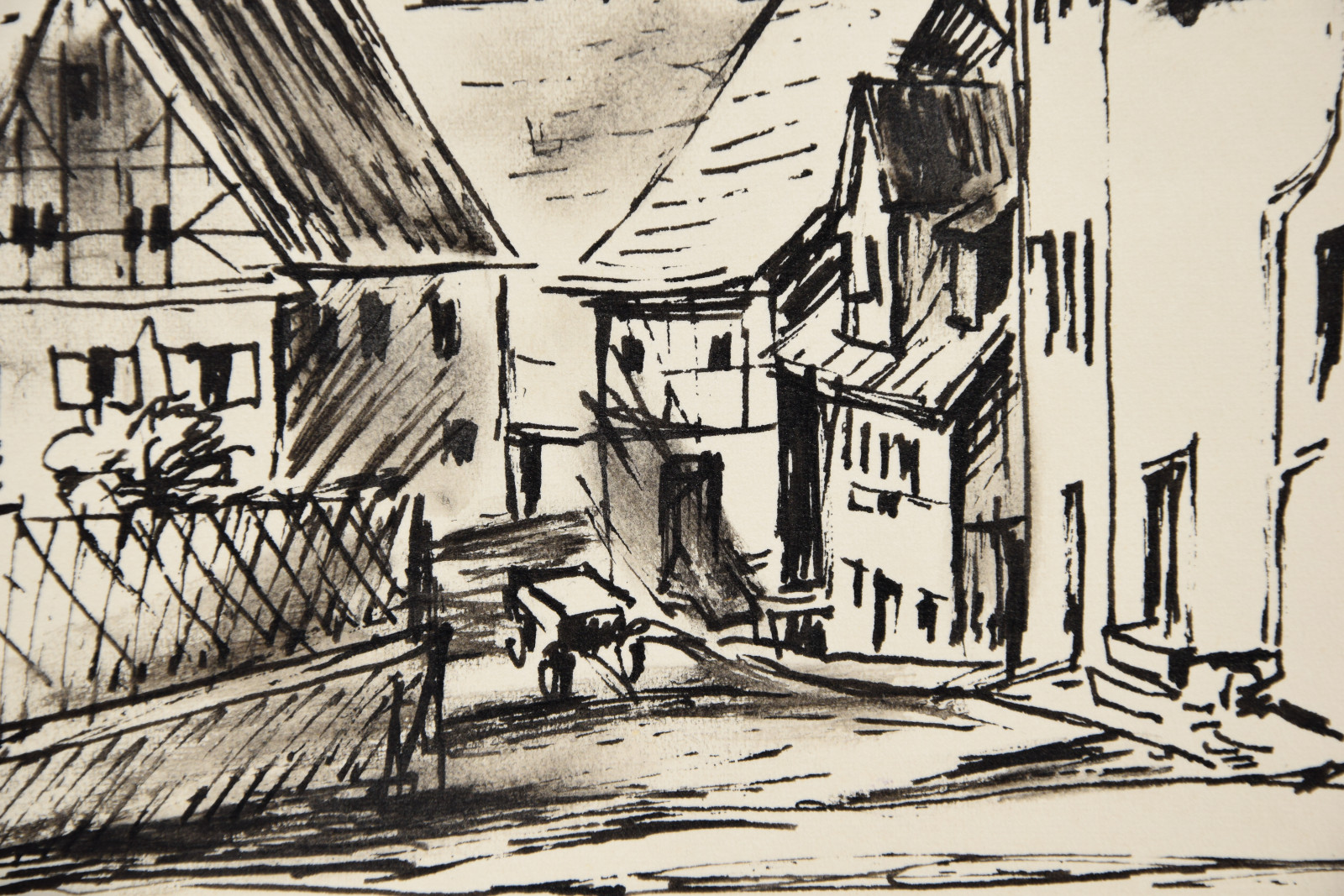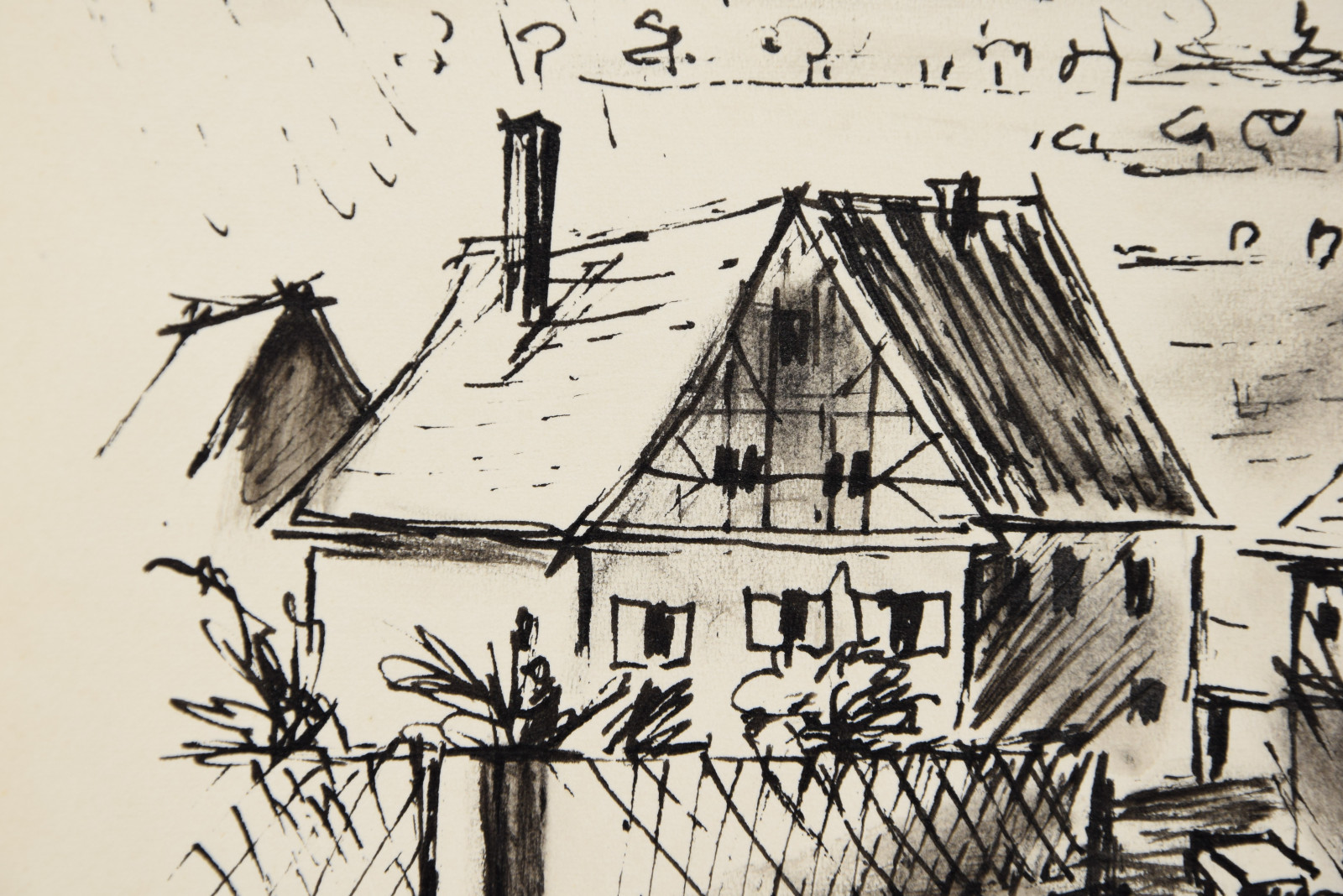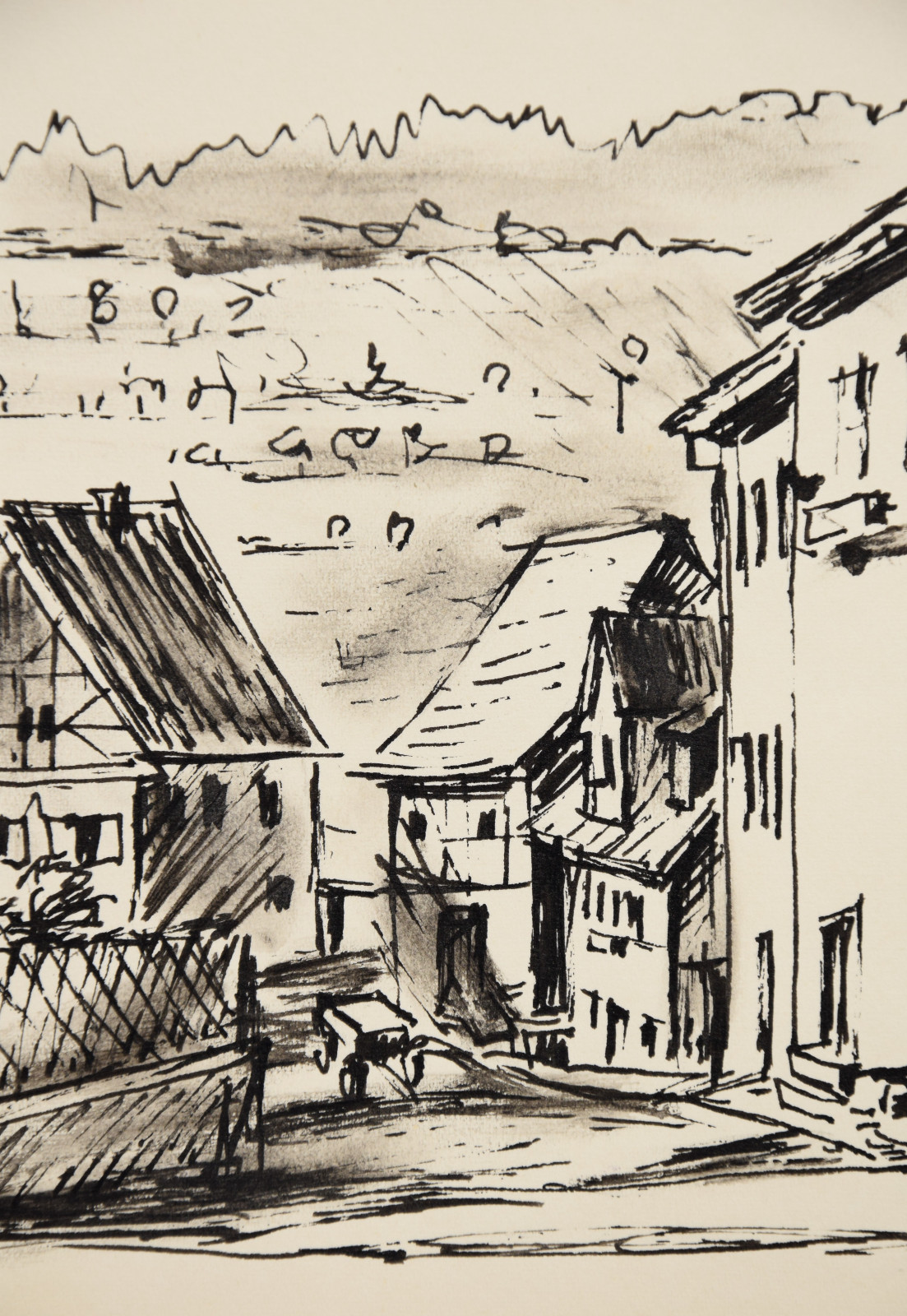 Tuschfeder (teilweise grau laviert) auf festerem Zeichenpapier