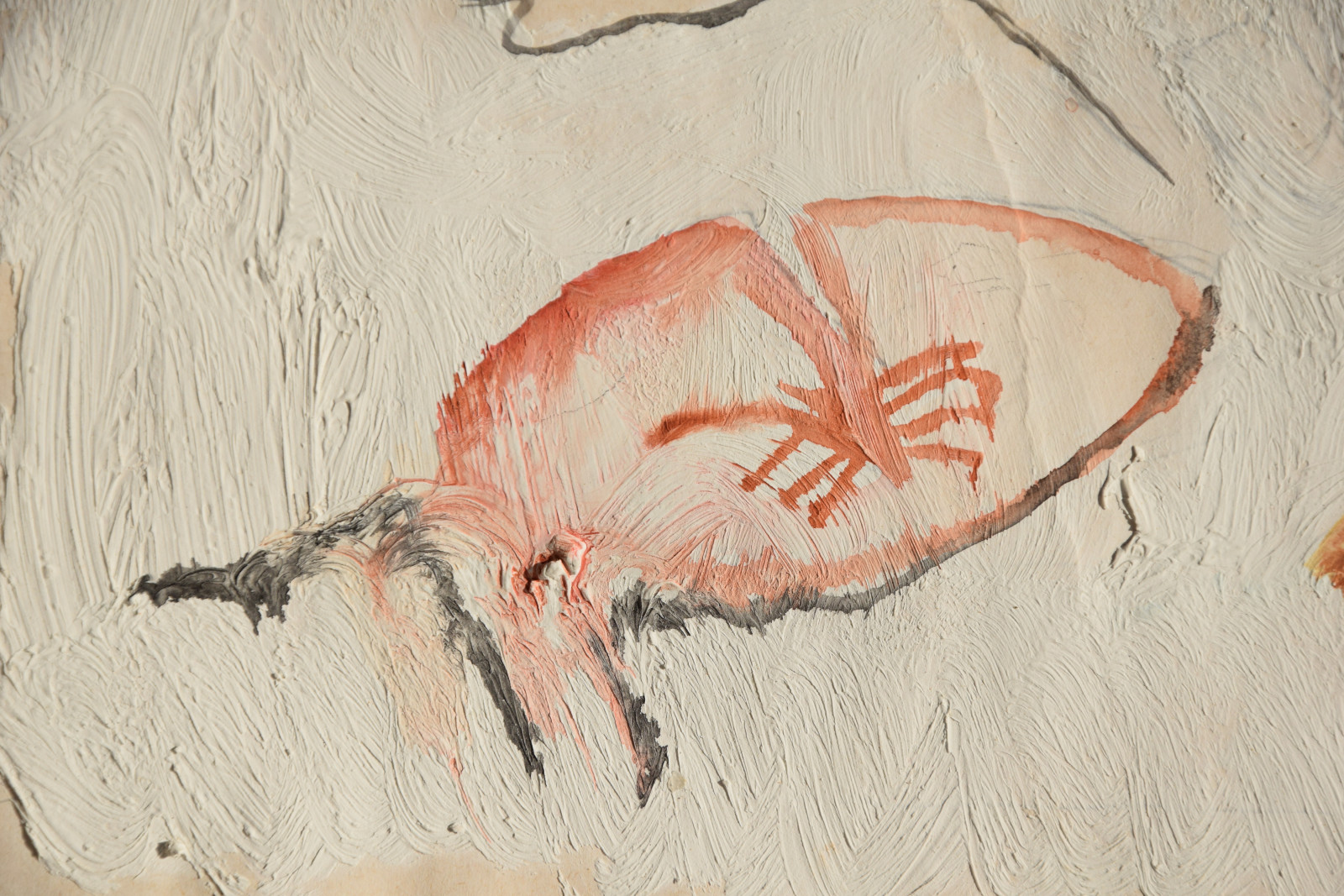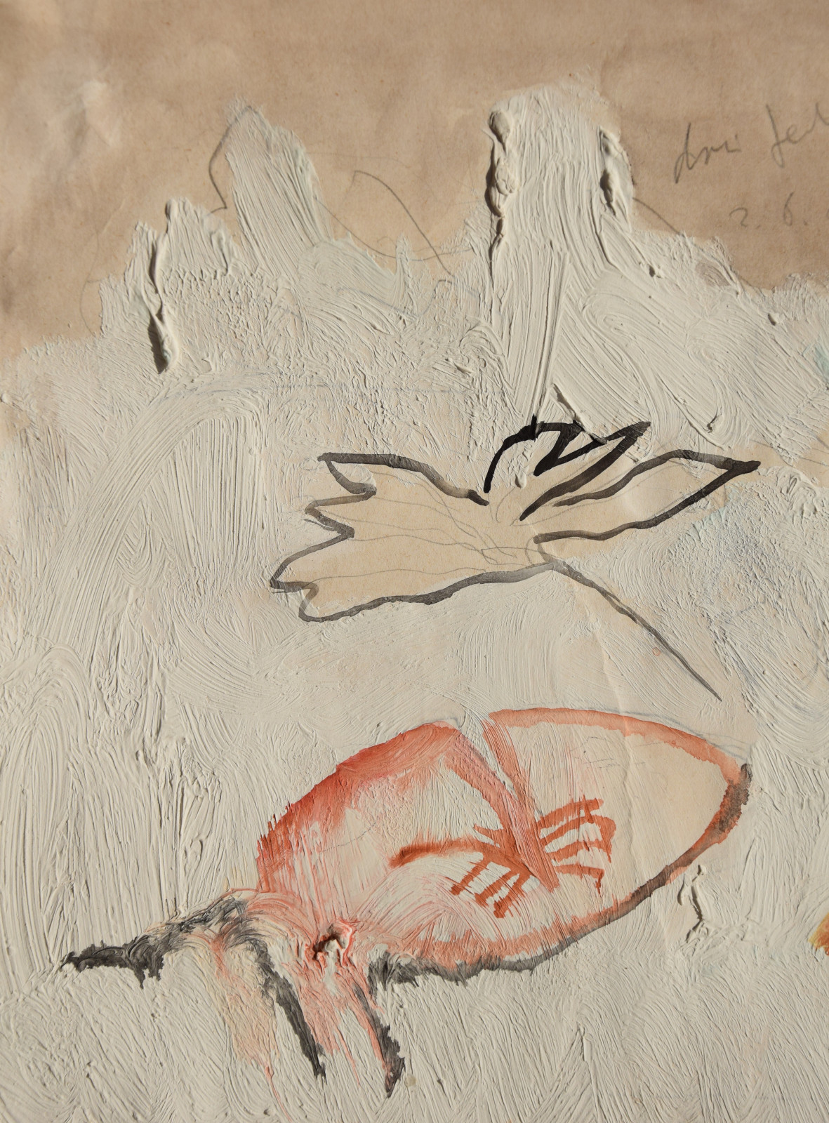 Diese Ausführungen von Irene Ferchl passen trefflich zu dem vorliegenden frühen Werk, welches der Künstler direkt im Bild, scheinbar ganz beiläufig mit „drei Falter“ betitelte. Unweigerlich läuft damit im Betrachter eine Kategorisierung des Gesehenen statt. – die drei farblich exponierten Formen werden als Falter vor weißem Hintergrund assoziiert, doch ist dies rundum stimmig? Lässt man das Werk weiter auf sich wirken und versucht dabei den Titel etwas beiseite zu schieben, so wirken die drei Strukturen in ihrer dünnen Farbigkeit locker, luftig und schwebend. Gerade die obere Form scheint zu fliegen, während die beiden unteren eher ruhig und statisch sind.