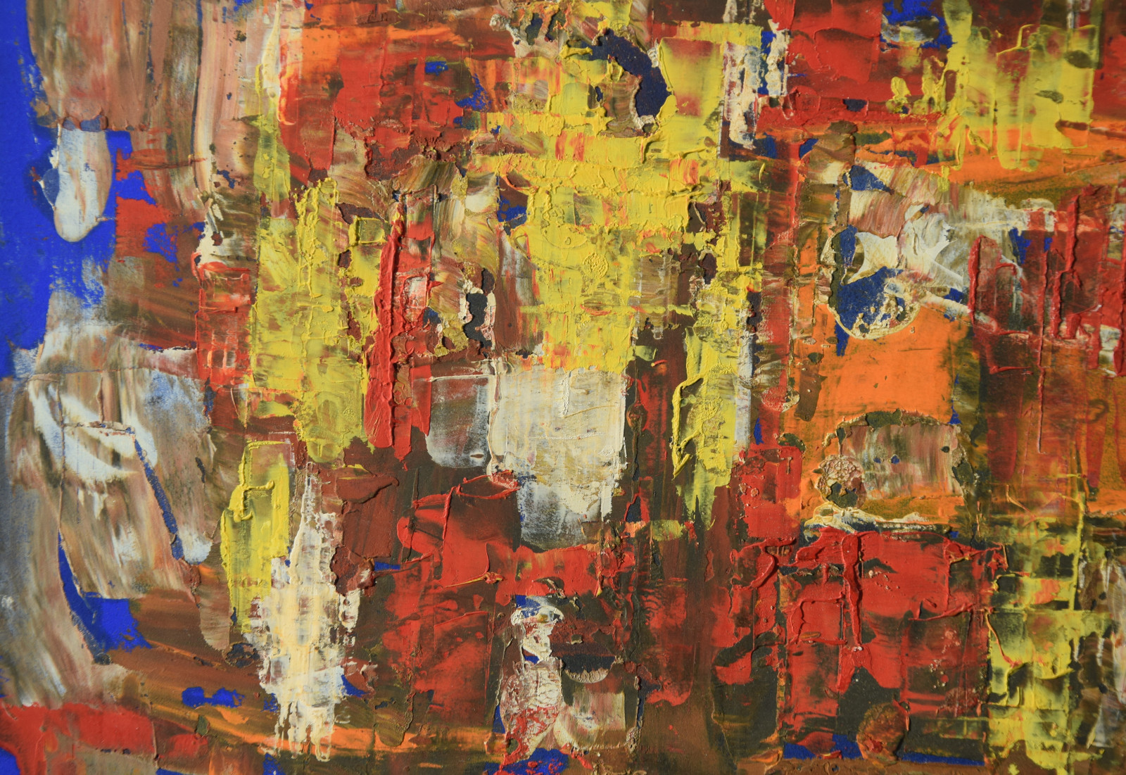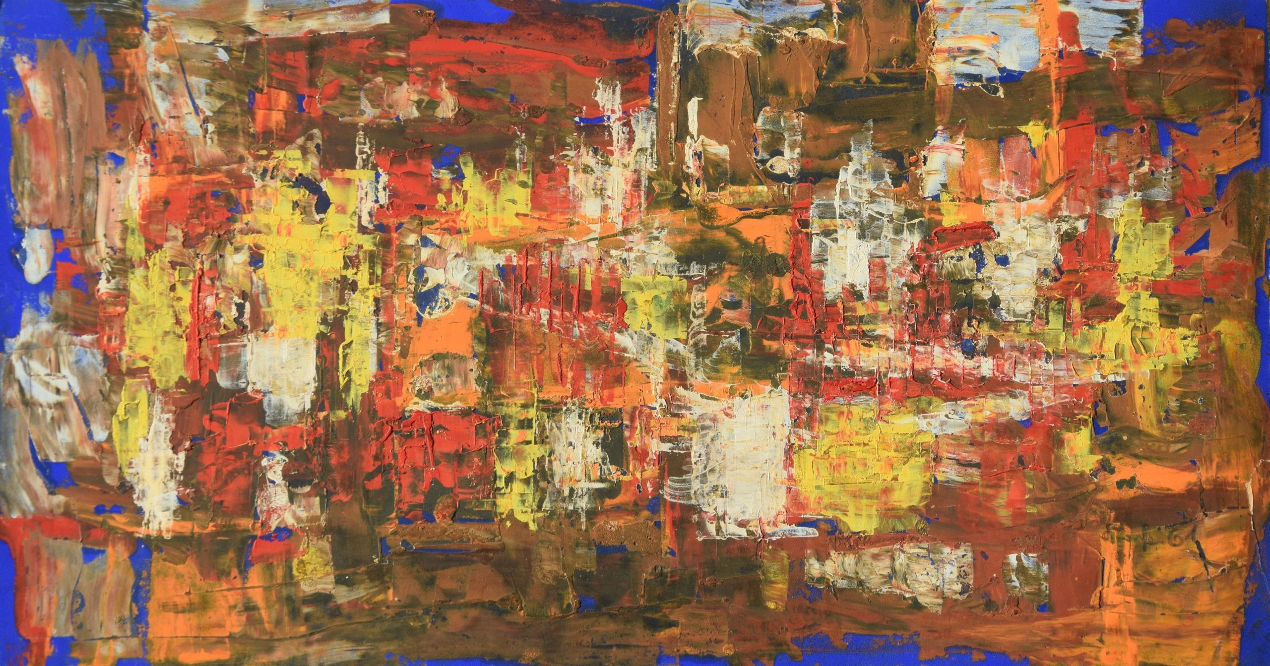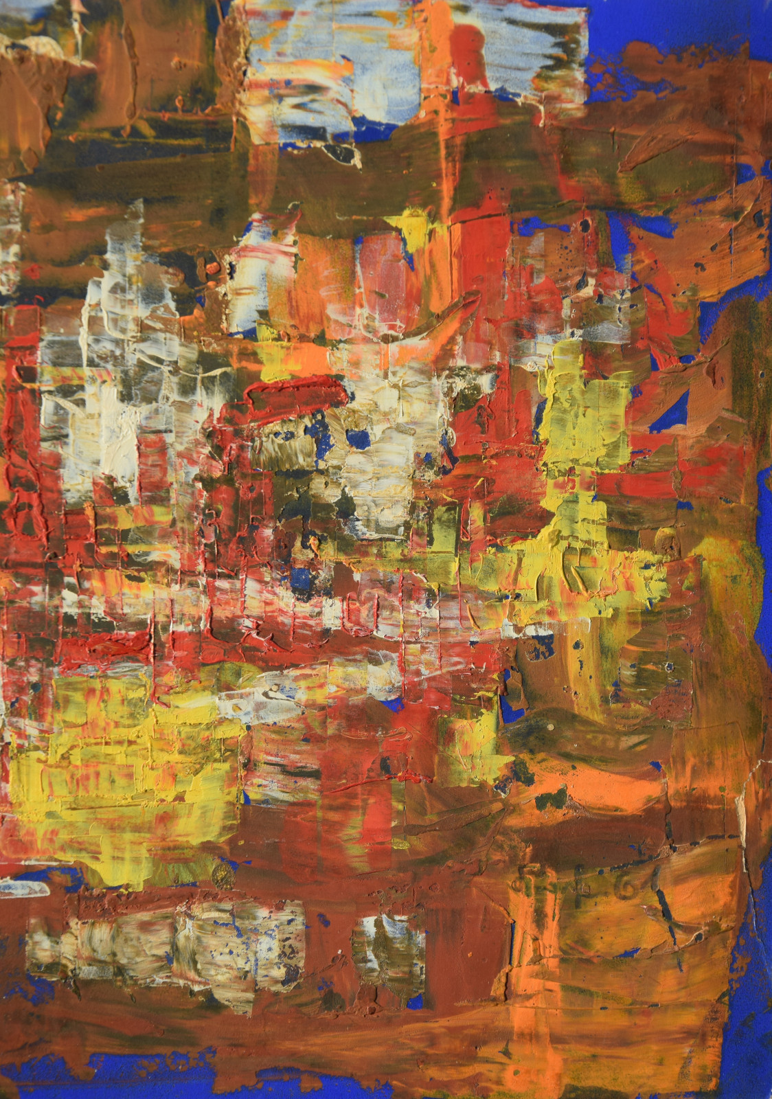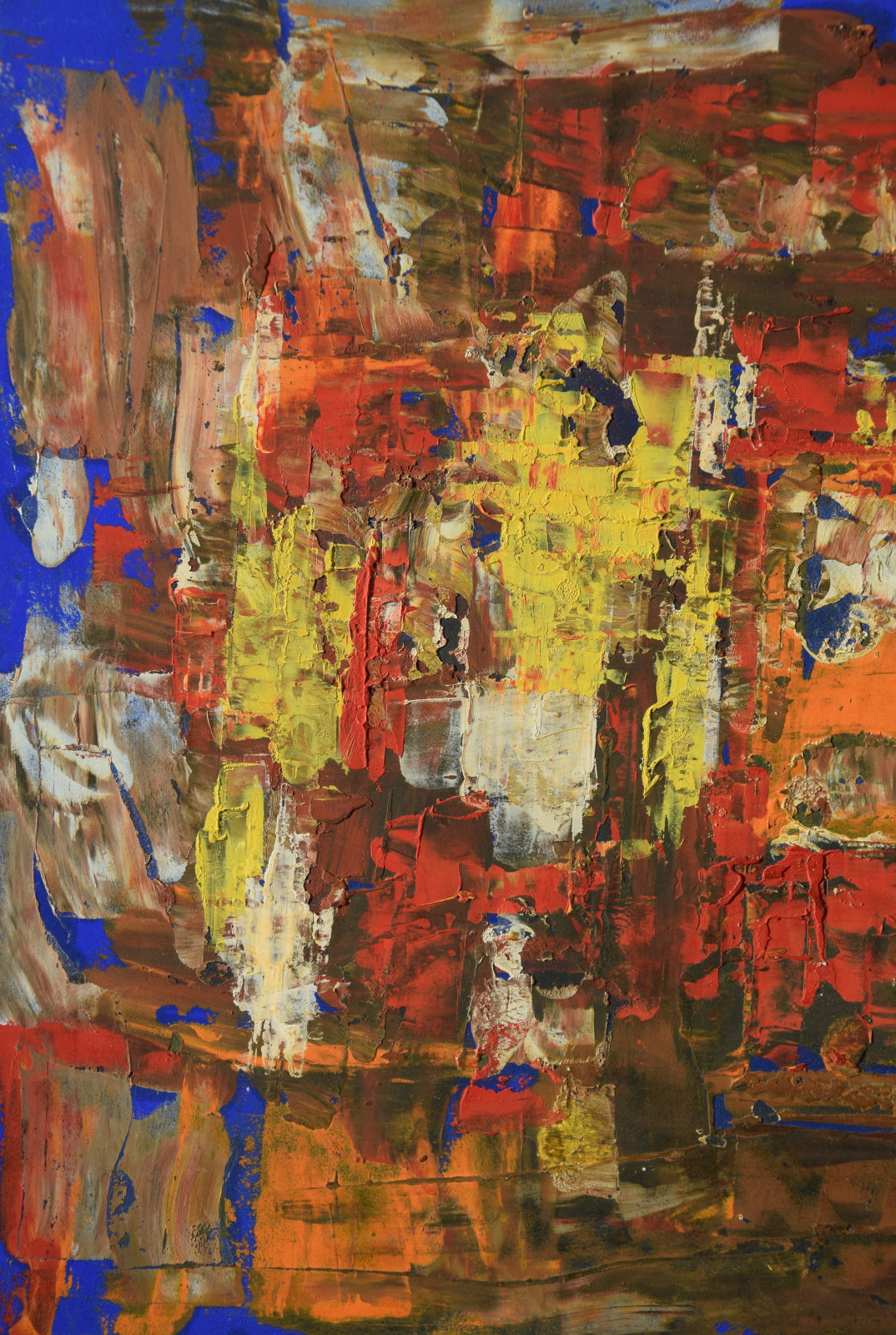 ohne Titel [Abstraktion in Gelb, Rot, Braun und Weiß vor Blau]