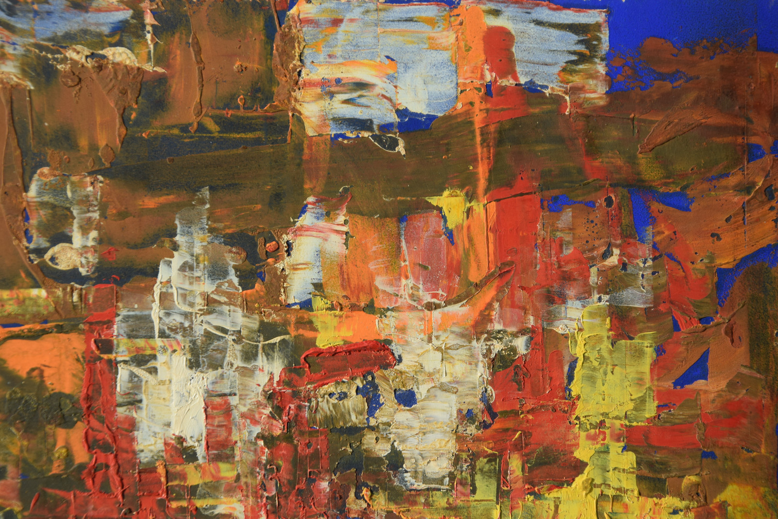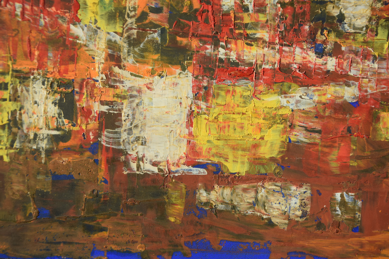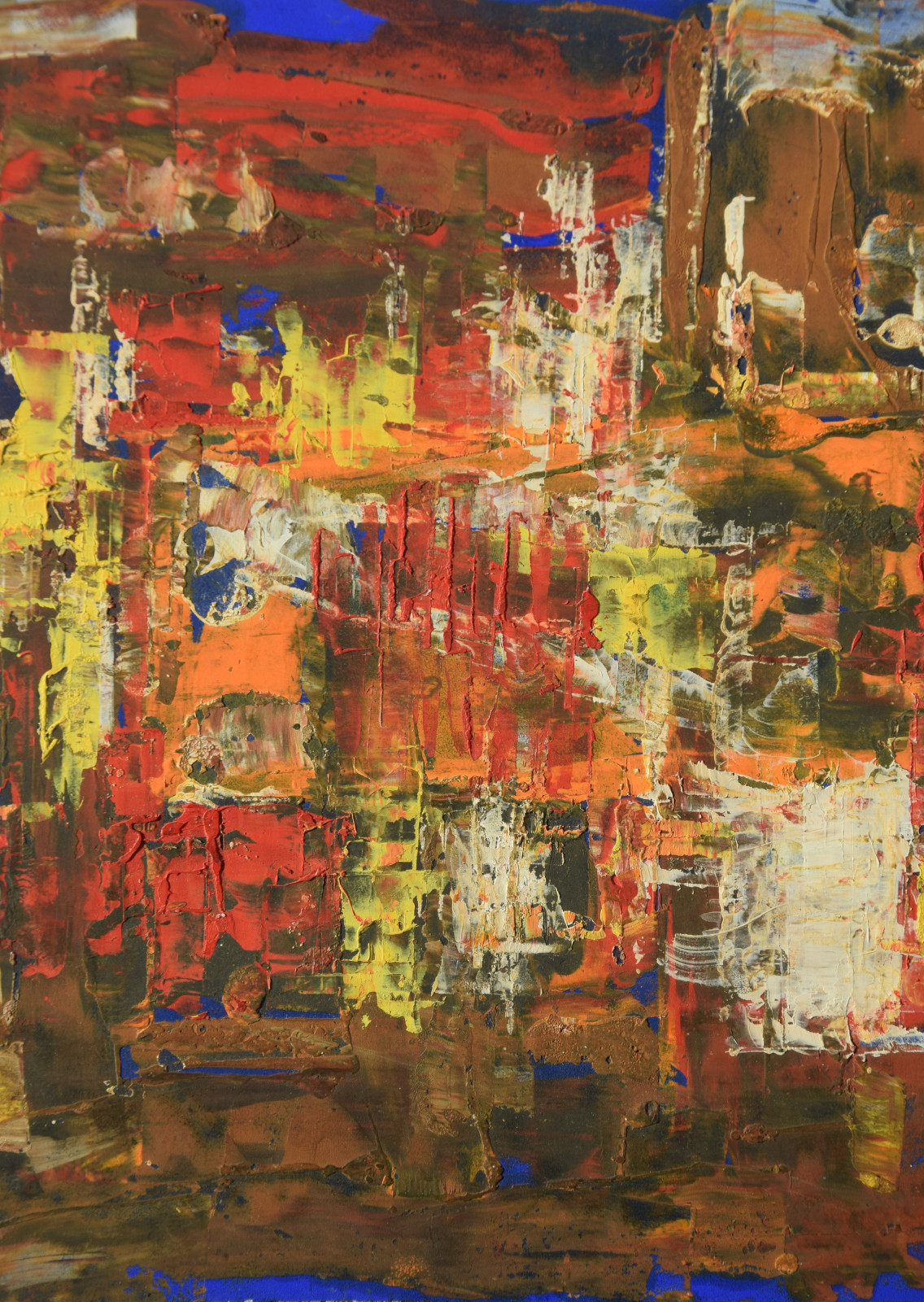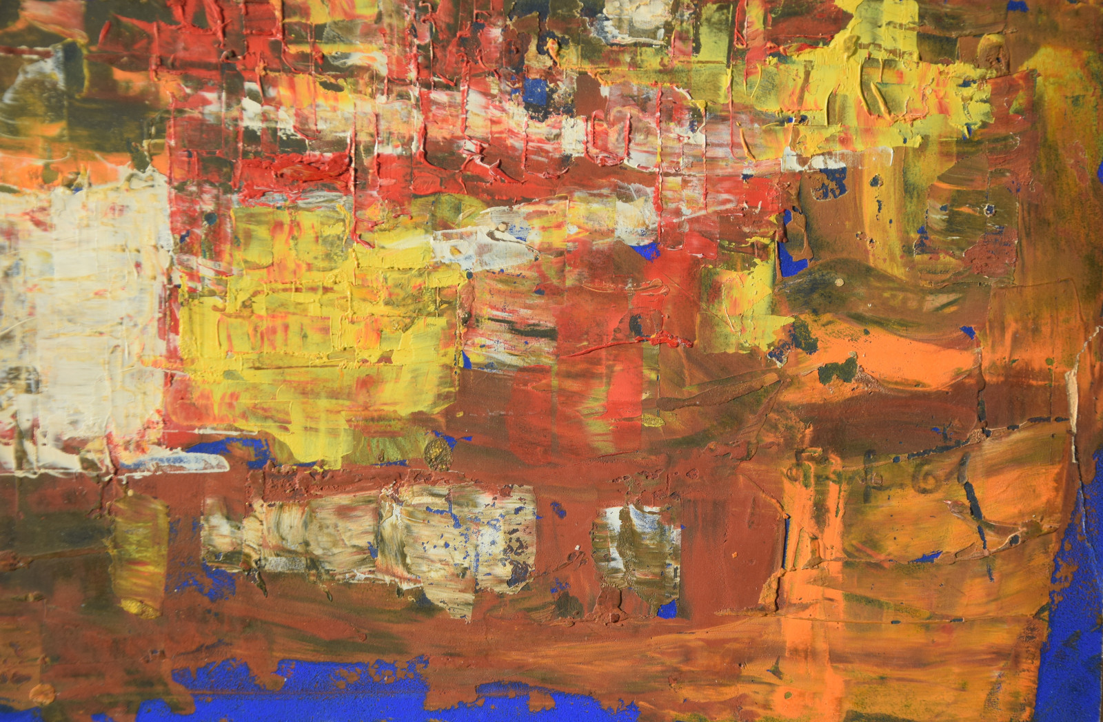 ohne Titel [Abstraktion in Gelb, Rot, Braun und Weiß vor Blau]