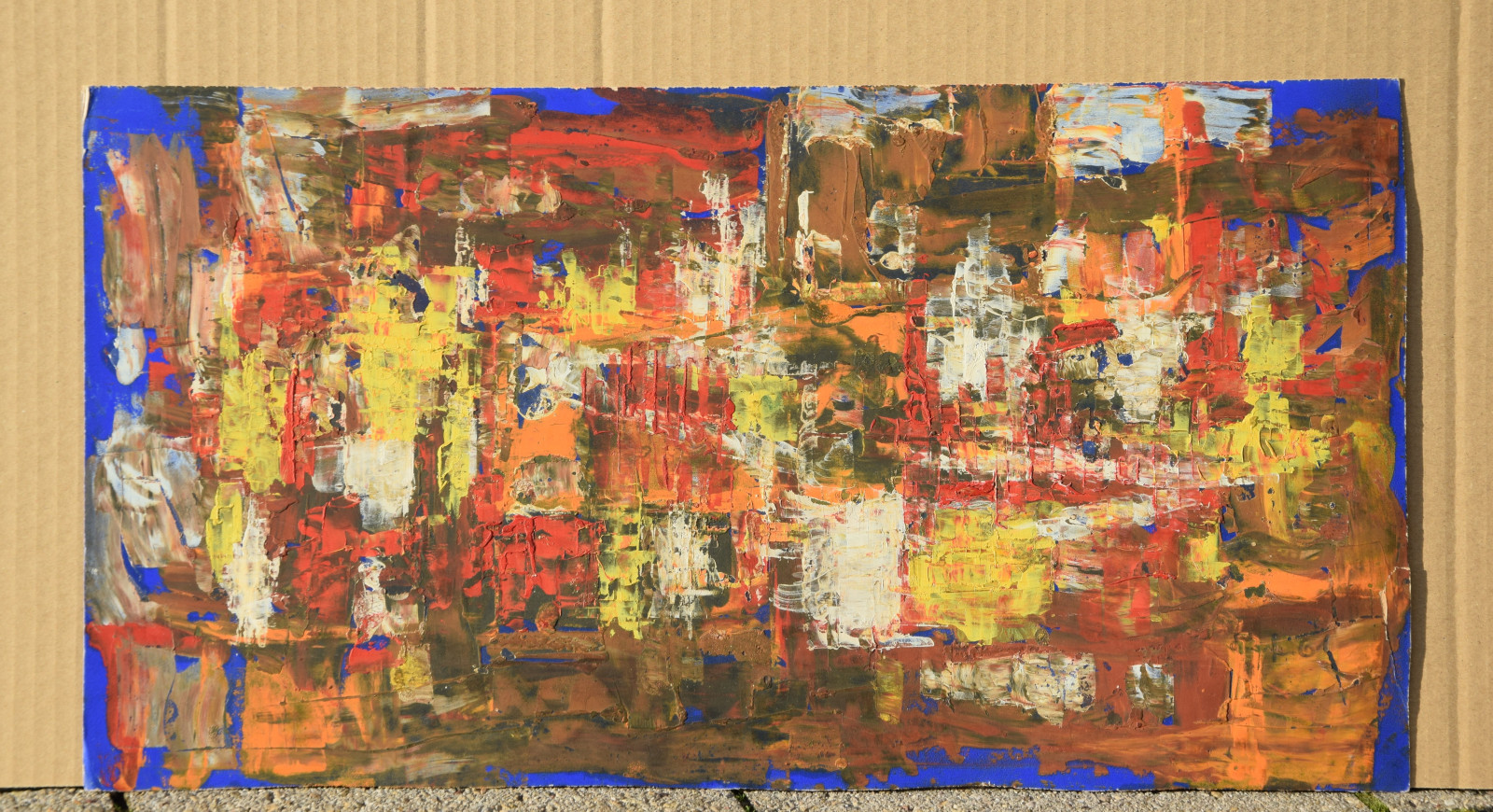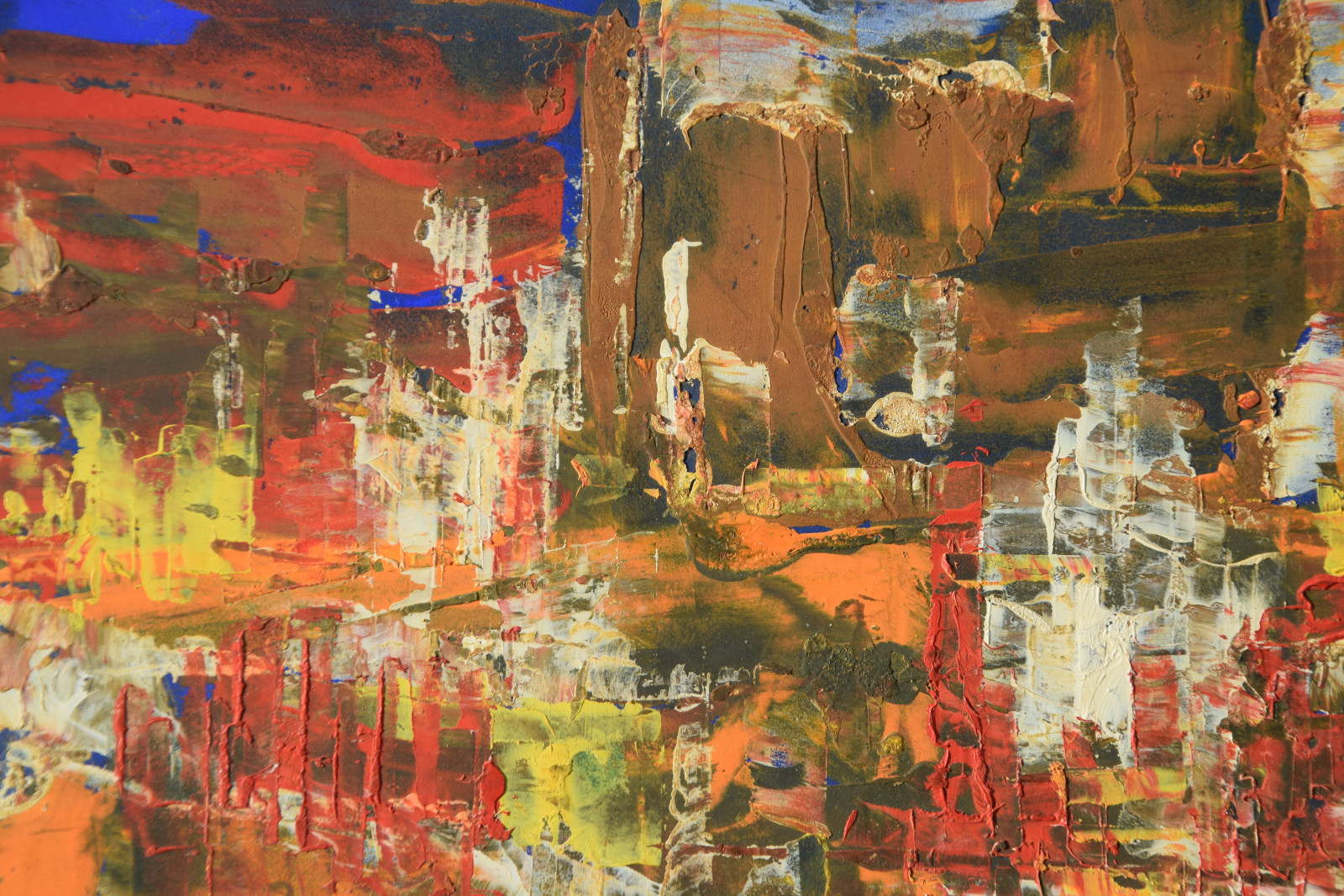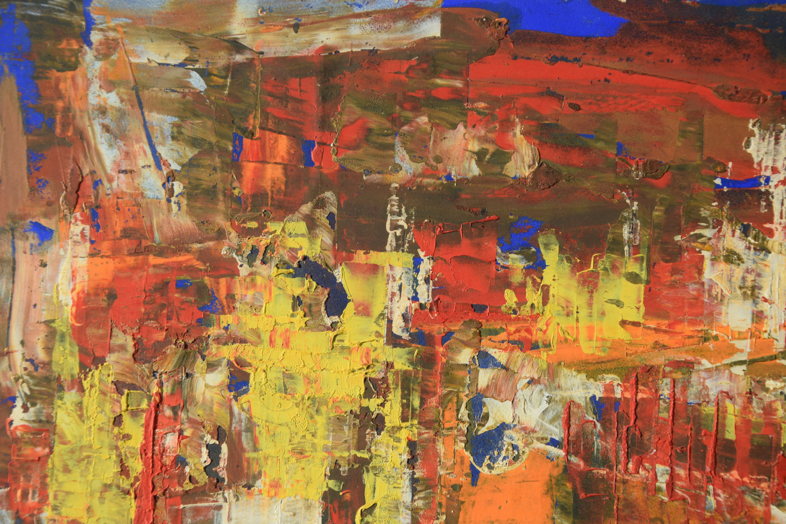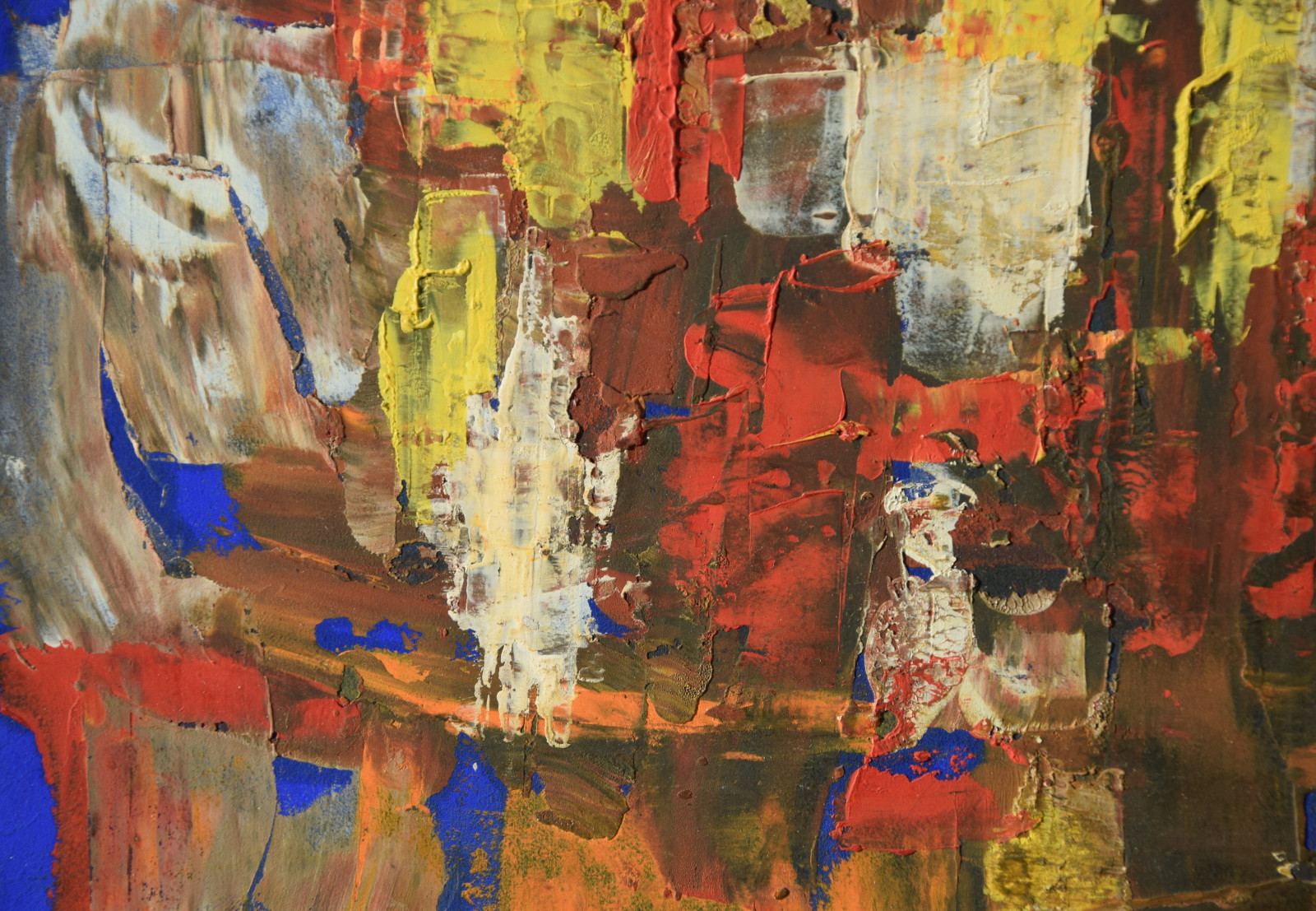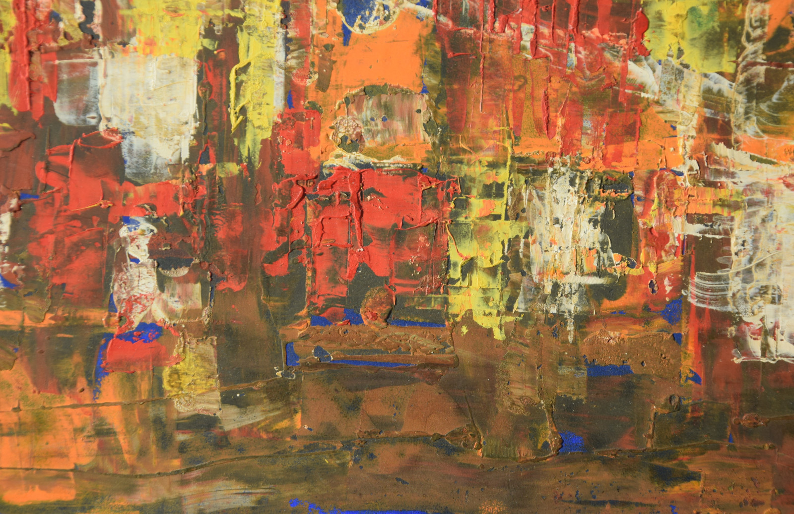 ohne Titel [Abstraktion in Gelb, Rot, Braun und Weiß vor Blau]