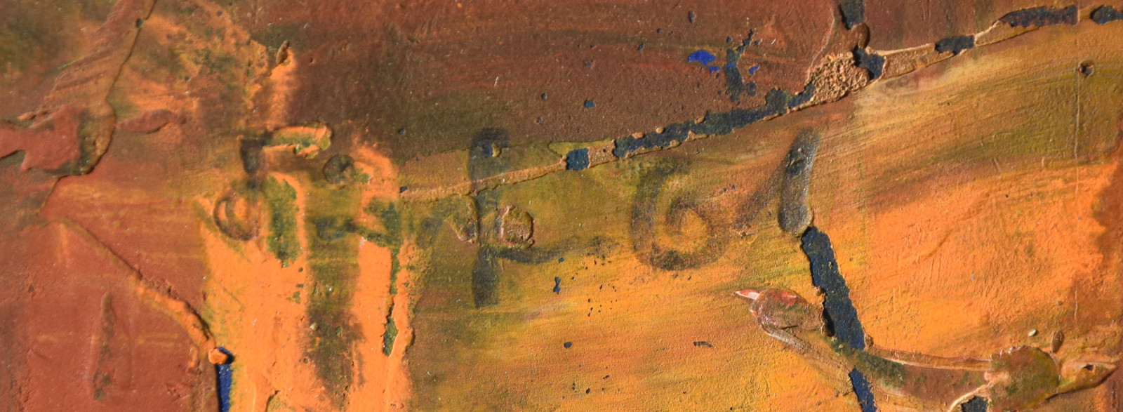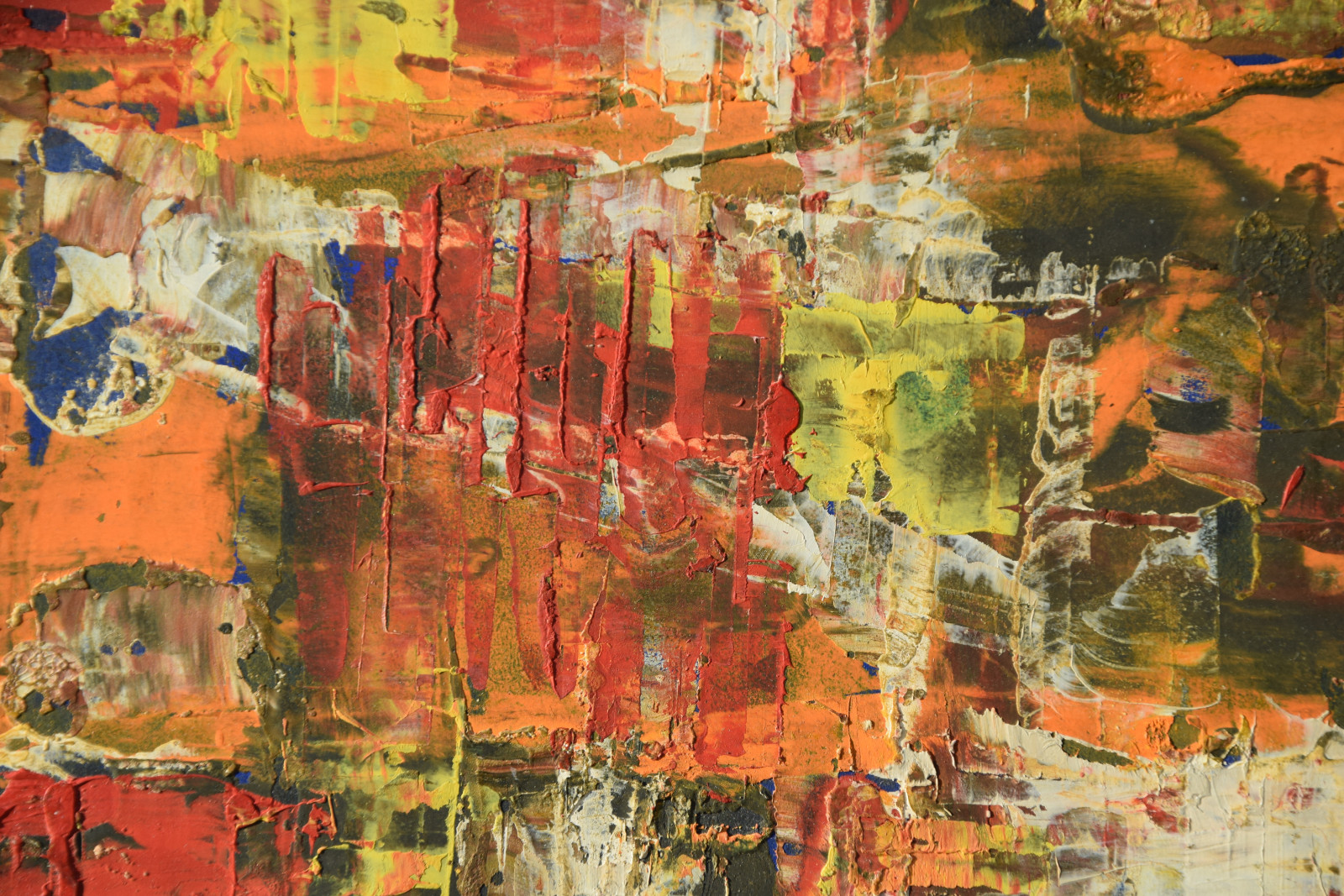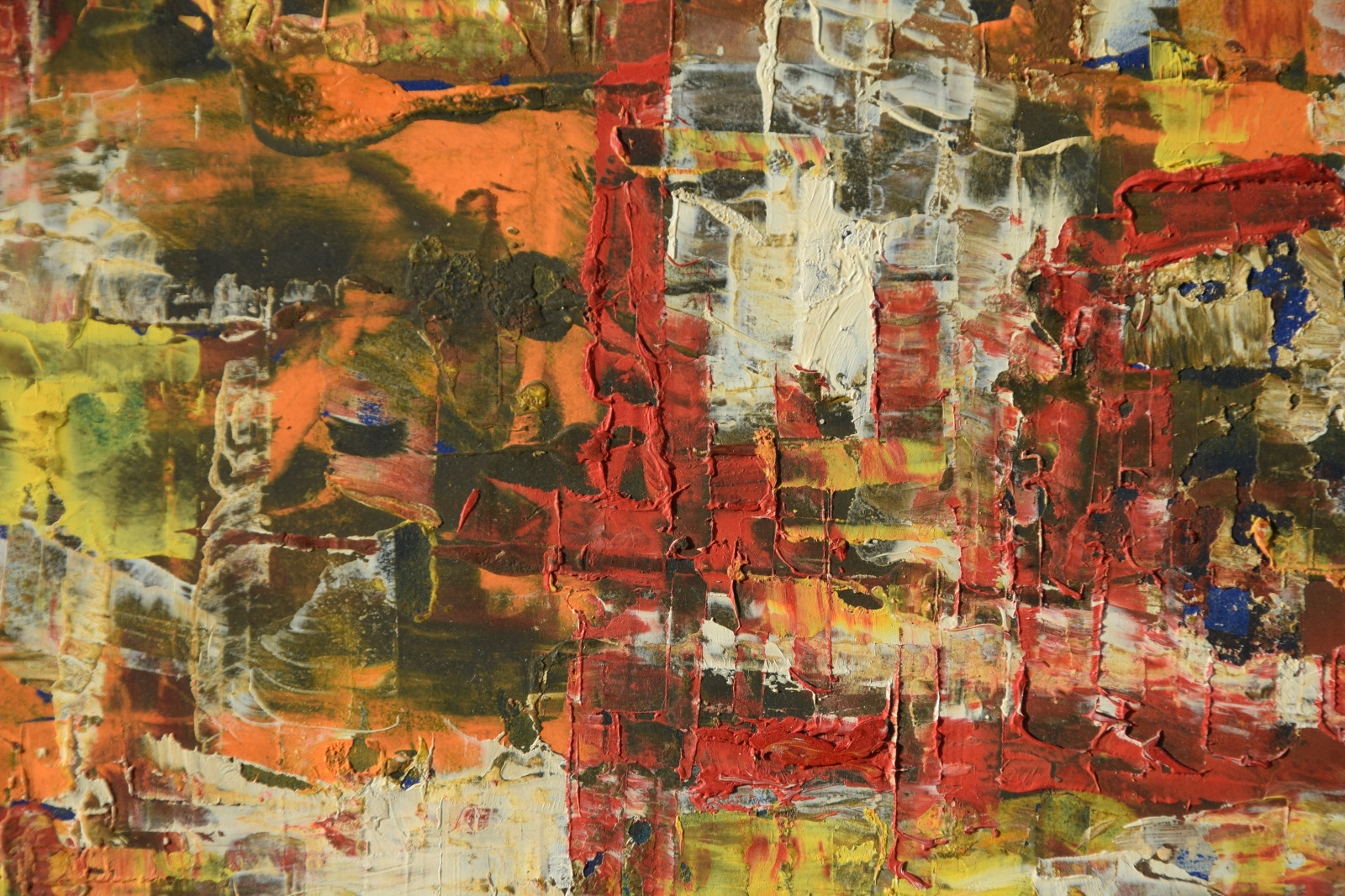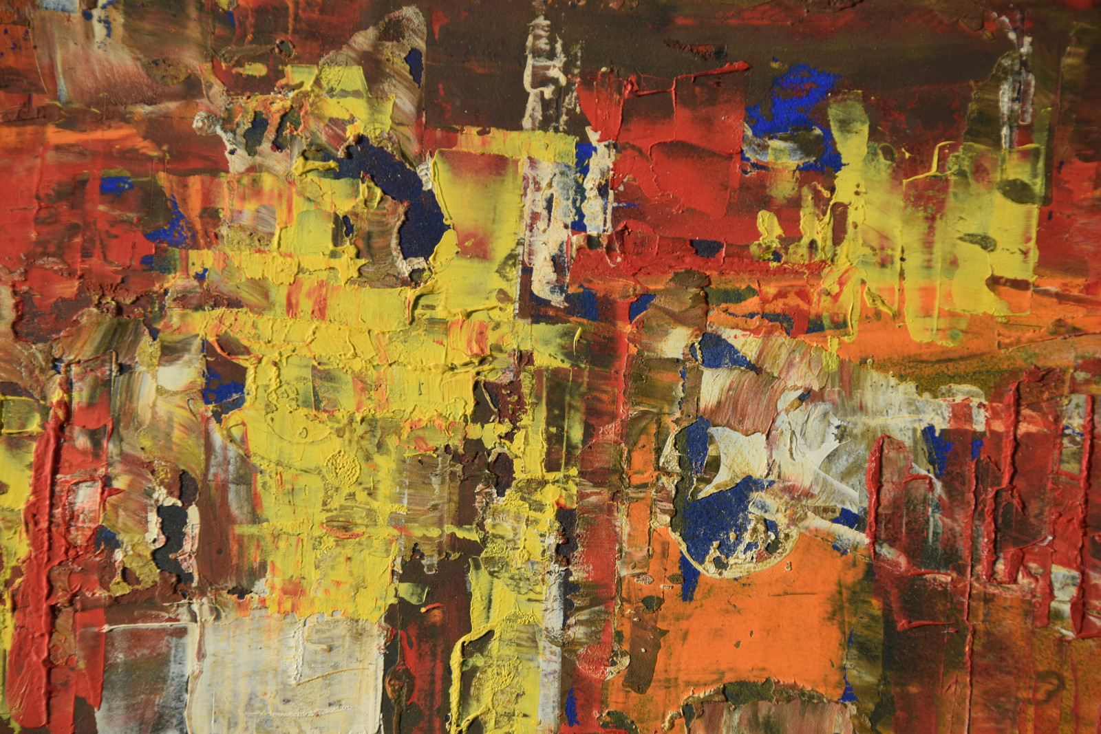 ohne Titel [Abstraktion in Gelb, Rot, Braun und Weiß vor Blau]