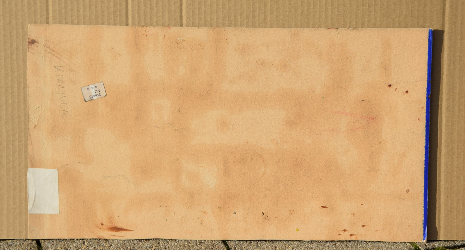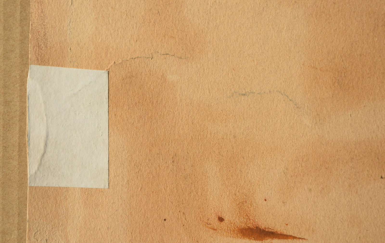 unterer und rechter Rand etwas uneben zugeschnitten; Ecken etwas bestoßen; am rechten Rand unten Einriss (dieser verso mit Klebeband hinterlegt); im Bereich oben links horizontal verlaufende Quetschung; verso gebräunt / nachgedunkelt, sowie etwas farbfleckig; verso rechts mit Etikett und handschriftlicher Bezeichnung