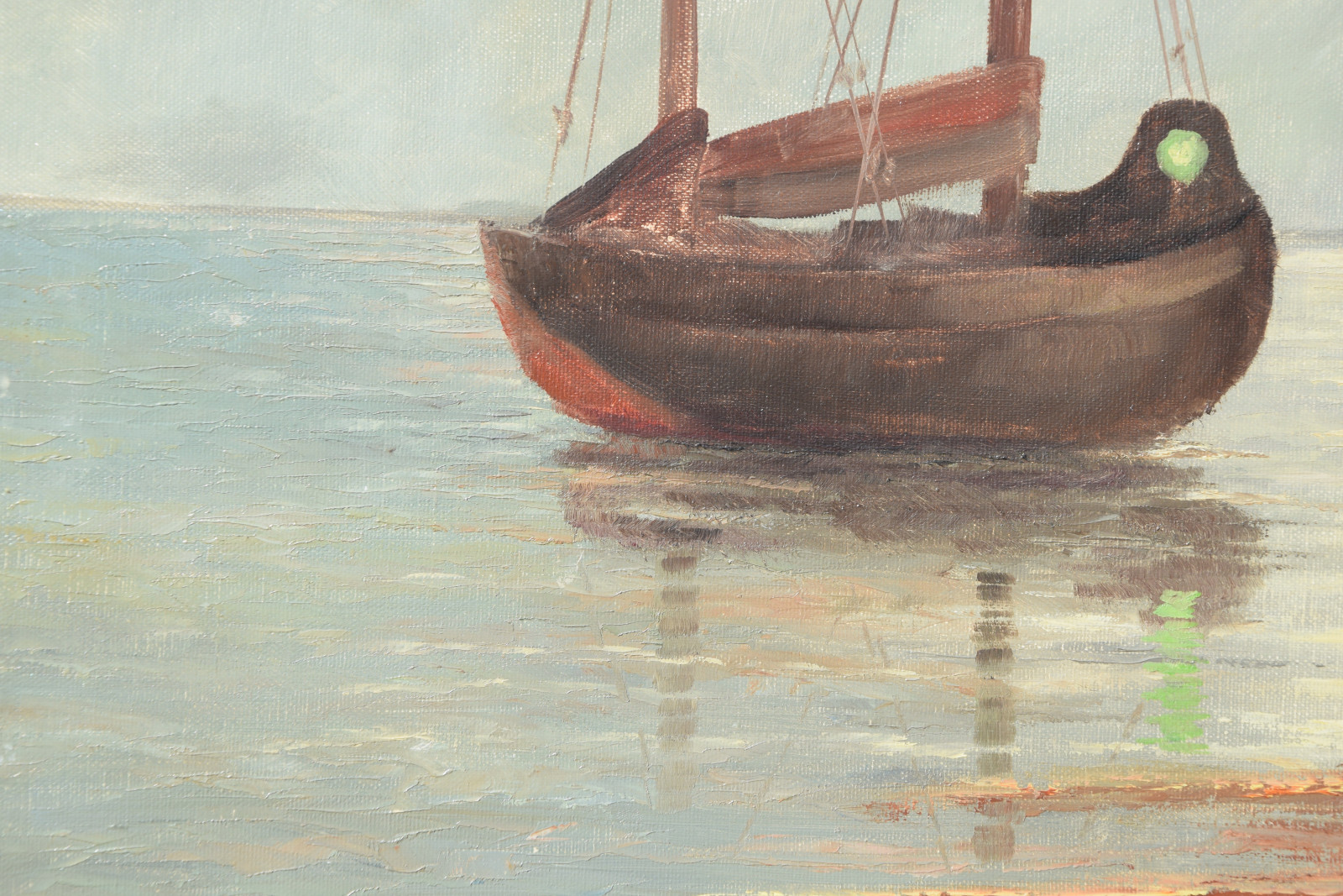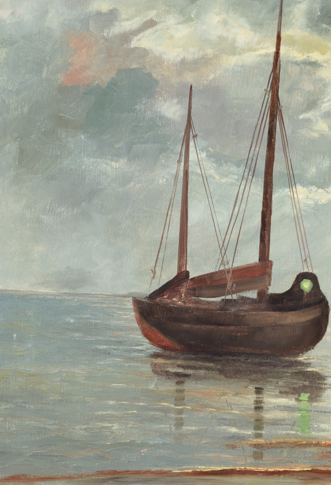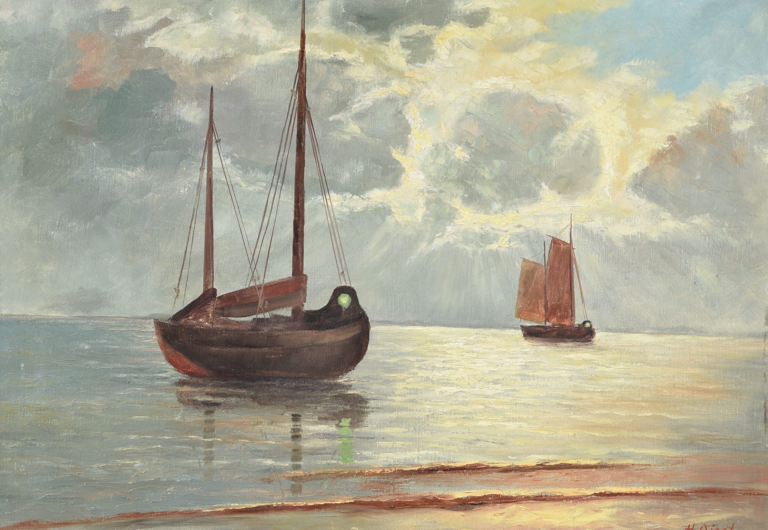 ohne Titel [zwei Fischerboote an der Küste im Morgenlicht, gemalt nach einer Vorlage]