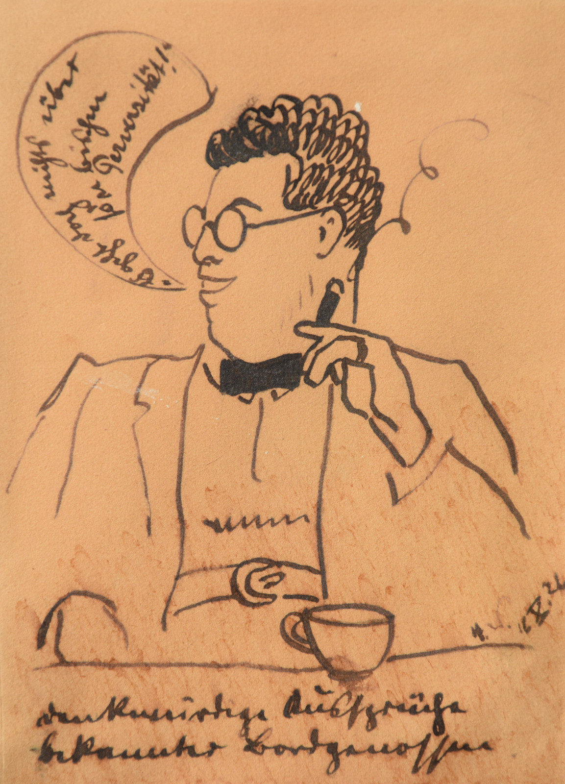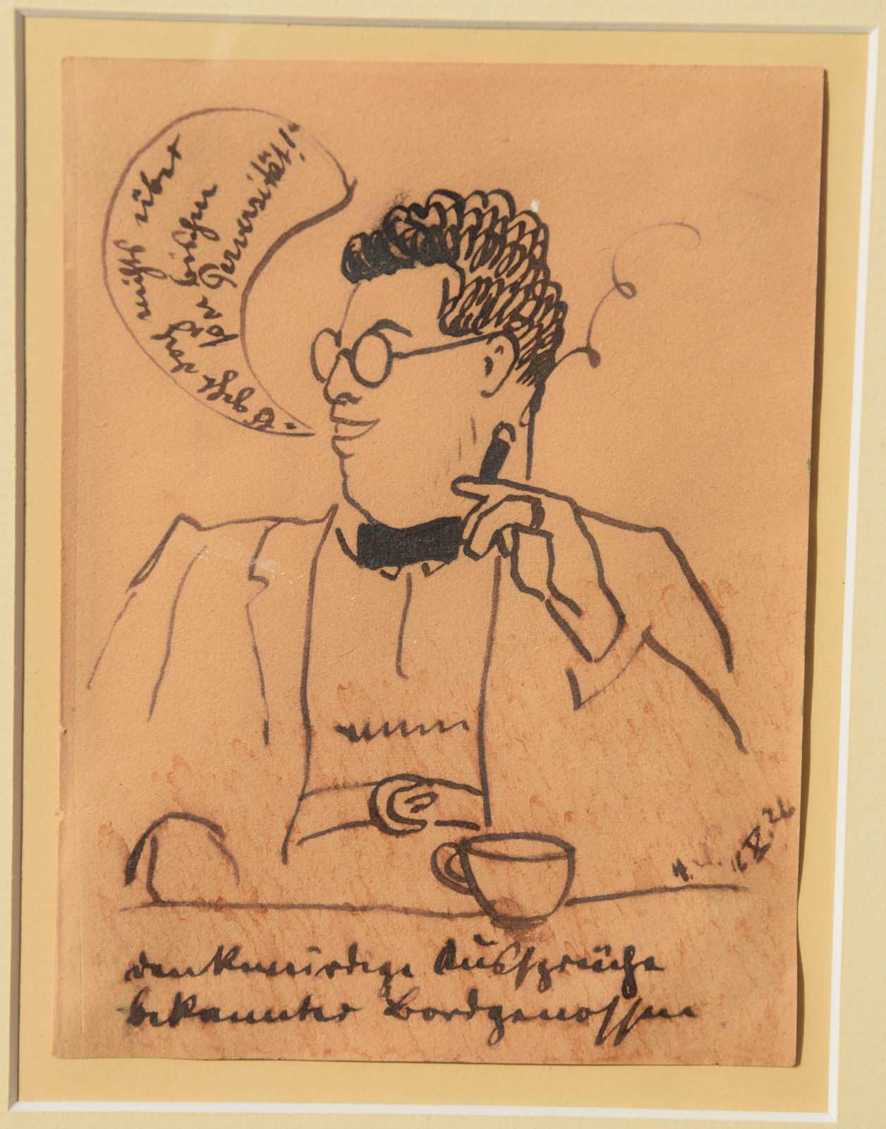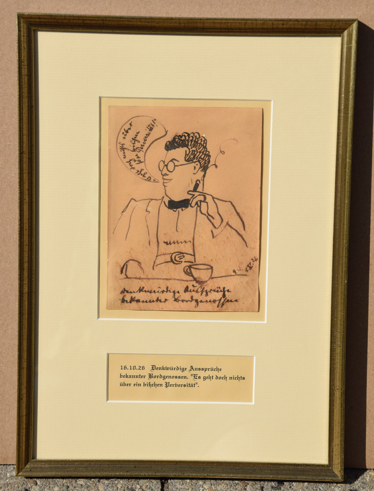 Diese vorliegende Zeichnung datiert exakt auf den 16. Oktober 1926 und ist exakt in die Zeit dieser Reise einzuordnen. Heinz Wever zeigt hier das humorvolle, ins kraikaturhafte gehende Bildnis eines Mannes mit lockigen Haaren und Rundbrille. Dieser sitzt dem Betrachter gegenüber, hält in seiner linken eine Zigarre und blickt nach links. In dieser legeren Haltung und mit einem leichten Schmunzeln tätigt er nun diesen Satz, den Wever in seine Reihe „Denkwürdige Aussprüche bekannter Bordgenossen“ einfügte: „Es get doch nichts über ein bißchen Perversität!“