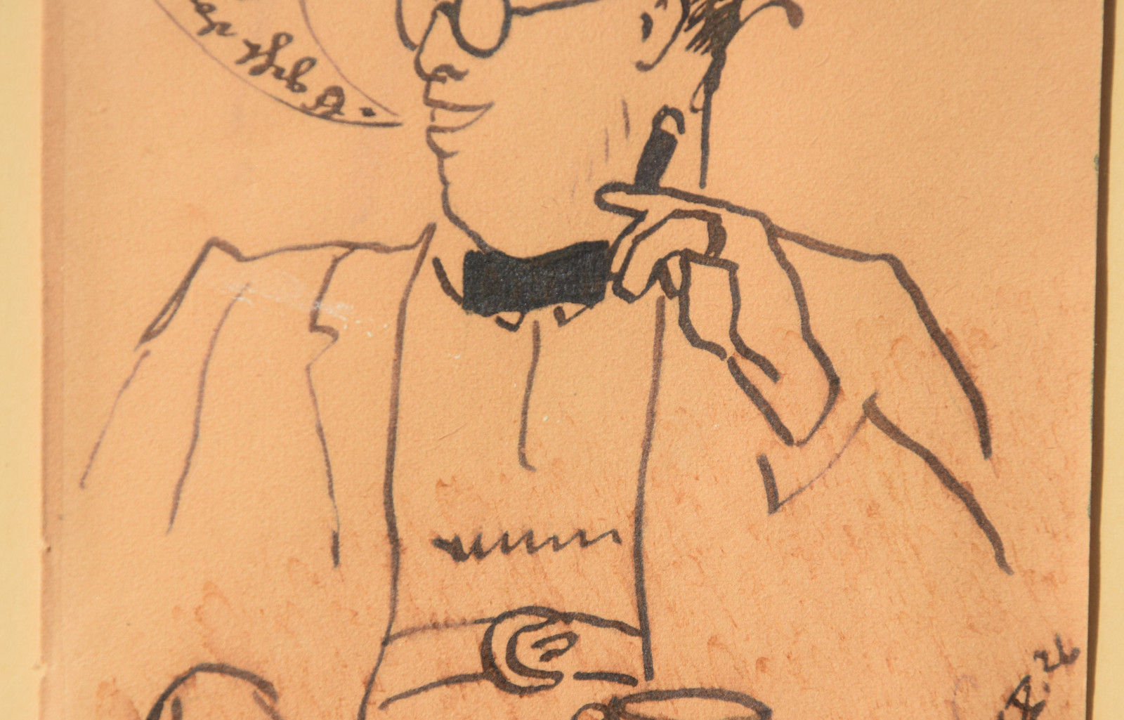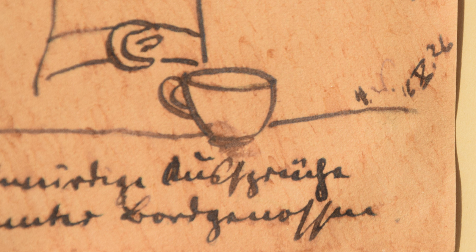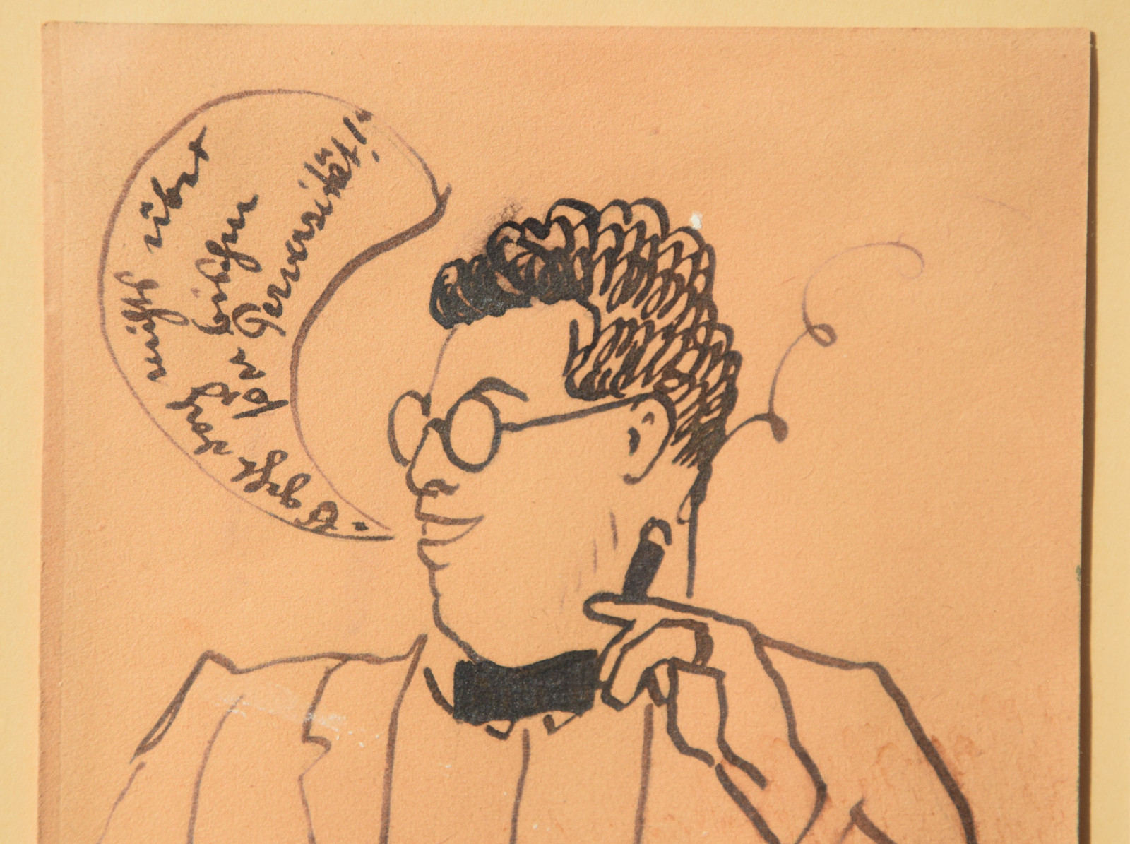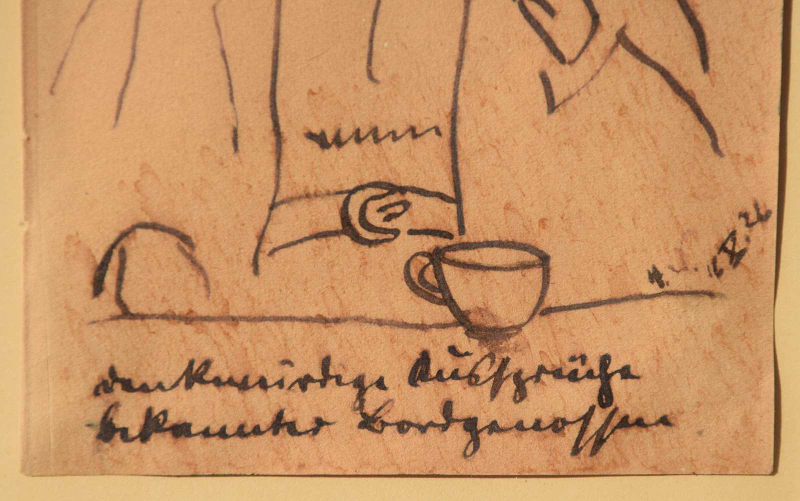Diese vorliegende Zeichnung datiert exakt auf den 16. Oktober 1926 und ist exakt in die Zeit dieser Reise einzuordnen. Heinz Wever zeigt hier das humorvolle, ins kraikaturhafte gehende Bildnis eines Mannes mit lockigen Haaren und Rundbrille. Dieser sitzt dem Betrachter gegenüber, hält in seiner linken eine Zigarre und blickt nach links. In dieser legeren Haltung und mit einem leichten Schmunzeln tätigt er nun diesen Satz, den Wever in seine Reihe „Denkwürdige Aussprüche bekannter Bordgenossen“ einfügte: „Es get doch nichts über ein bißchen Perversität!“