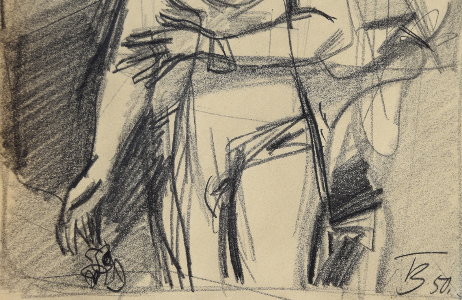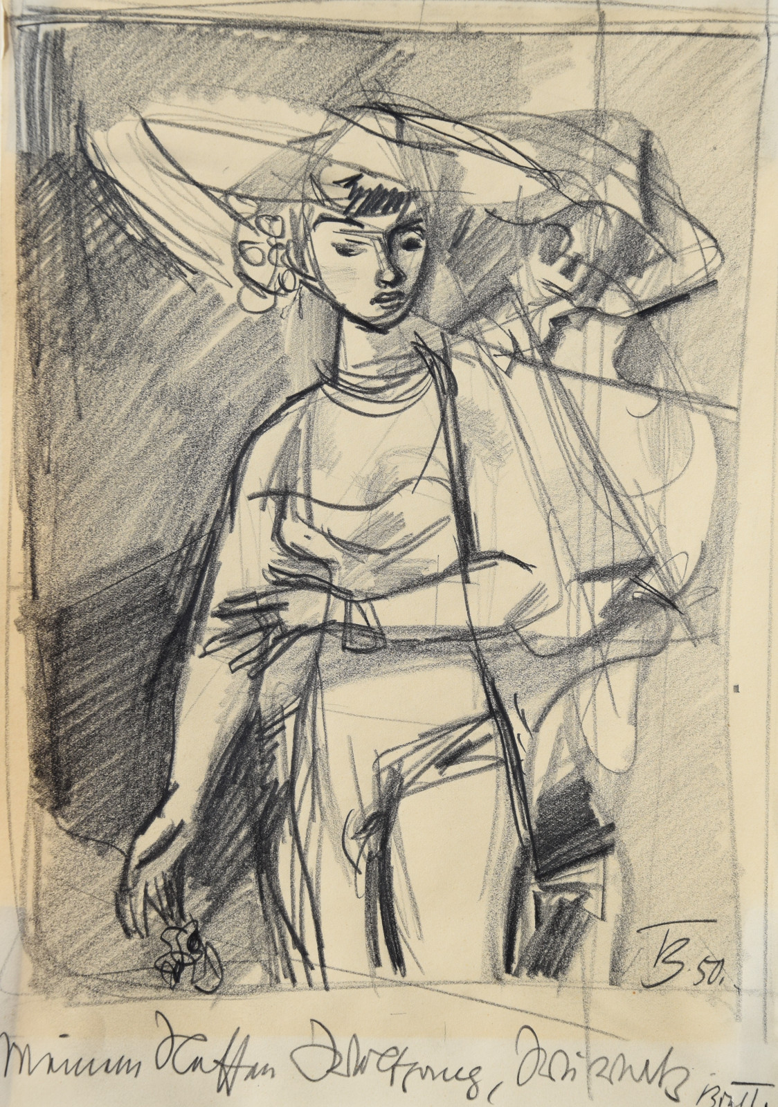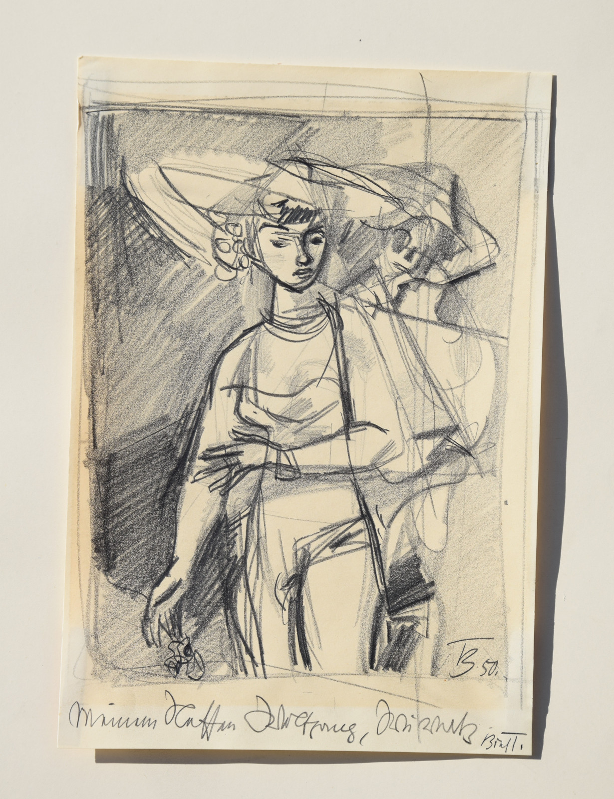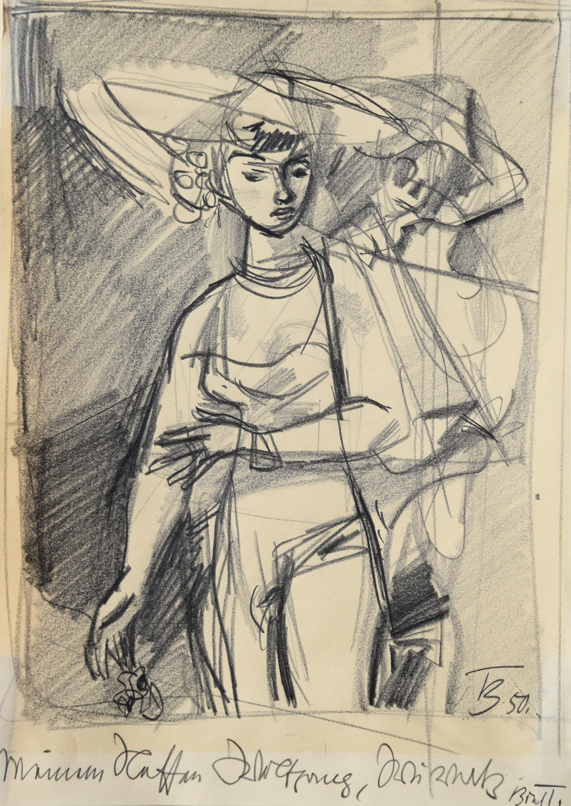 Diese hier vorliegende Zeichnung entstand der Datierung nach in der Anfangsphase seiner Münchner Schaffenszeit. Brust wendet sich nun langsam immer mehr der Ungegenständlichkeit zu, ist hier jedoch noch ganz im Figürlichen. In sehr markanter Zeichenmanier mit verschiedenen Grauabstufungen zeigt sich dem Betrachter das Bildnis einer Frau in einem sonst eher diffusen, unbekannt bleibenden Umfeld. Ihr linker Arm ist erhoben, der rechte Arm hängt herab und sie scheint gerade etwas fallen zu lassen (eine Blume?).