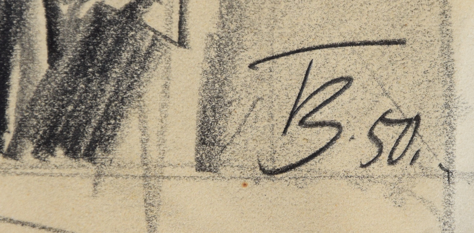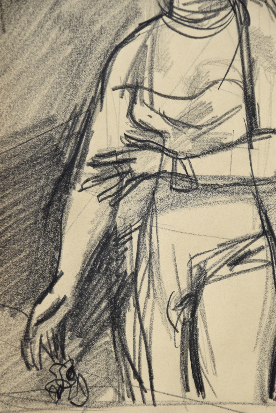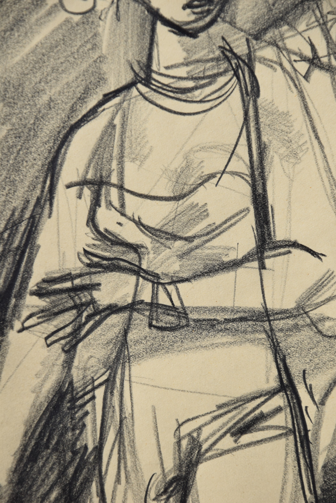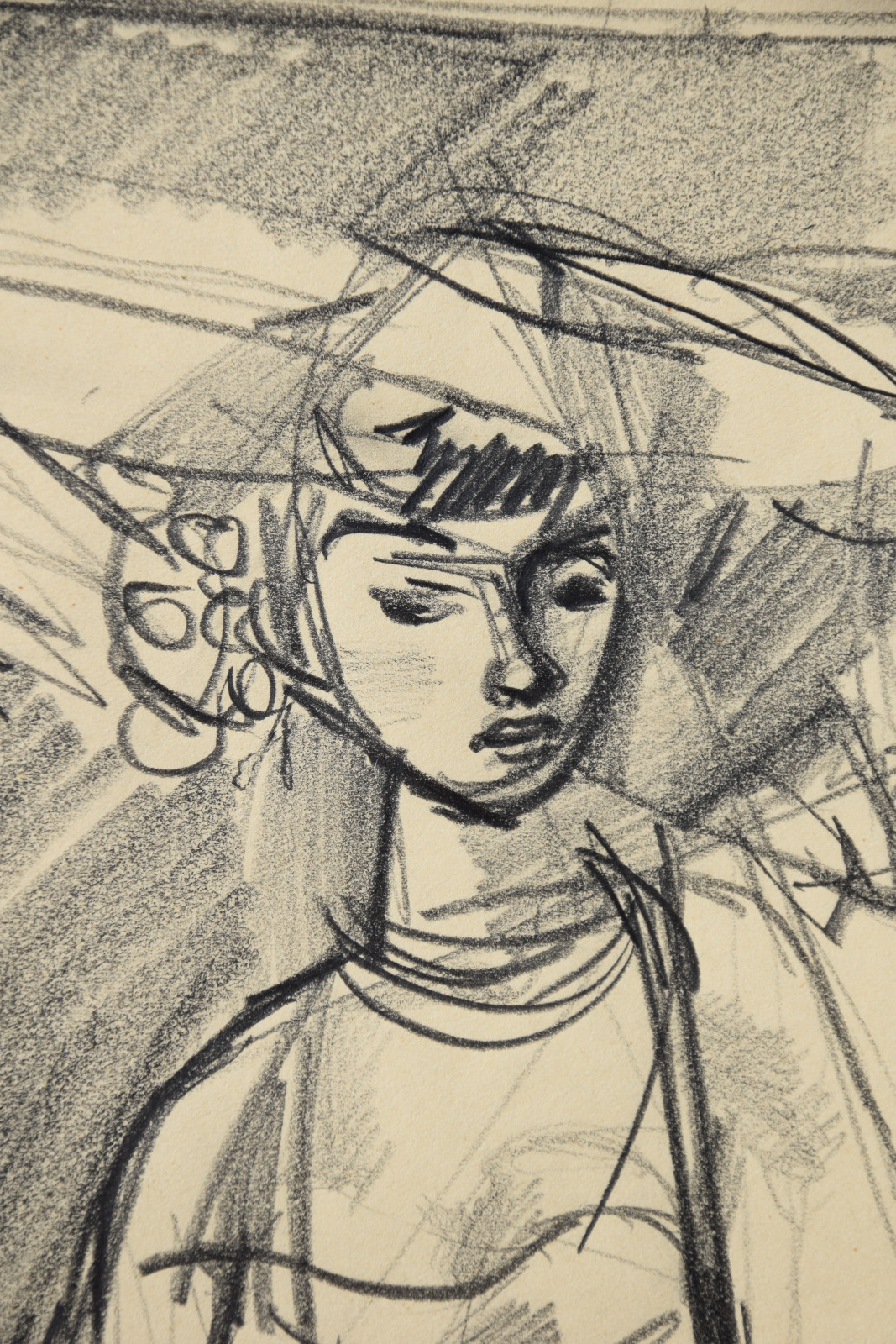 Diese hier vorliegende Zeichnung entstand der Datierung nach in der Anfangsphase seiner Münchner Schaffenszeit. Brust wendet sich nun langsam immer mehr der Ungegenständlichkeit zu, ist hier jedoch noch ganz im Figürlichen. In sehr markanter Zeichenmanier mit verschiedenen Grauabstufungen zeigt sich dem Betrachter das Bildnis einer Frau in einem sonst eher diffusen, unbekannt bleibenden Umfeld. Ihr linker Arm ist erhoben, der rechte Arm hängt herab und sie scheint gerade etwas fallen zu lassen (eine Blume?).