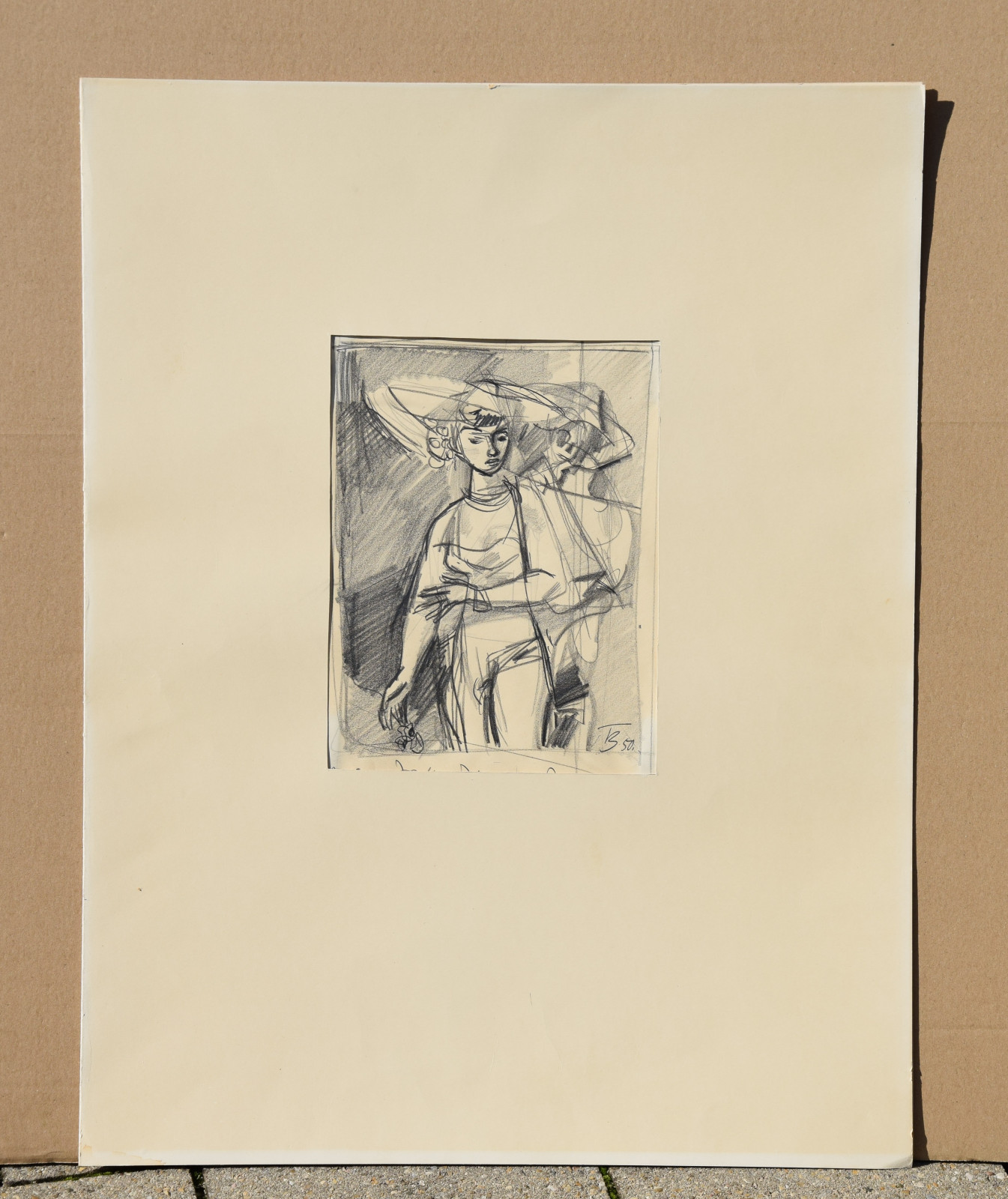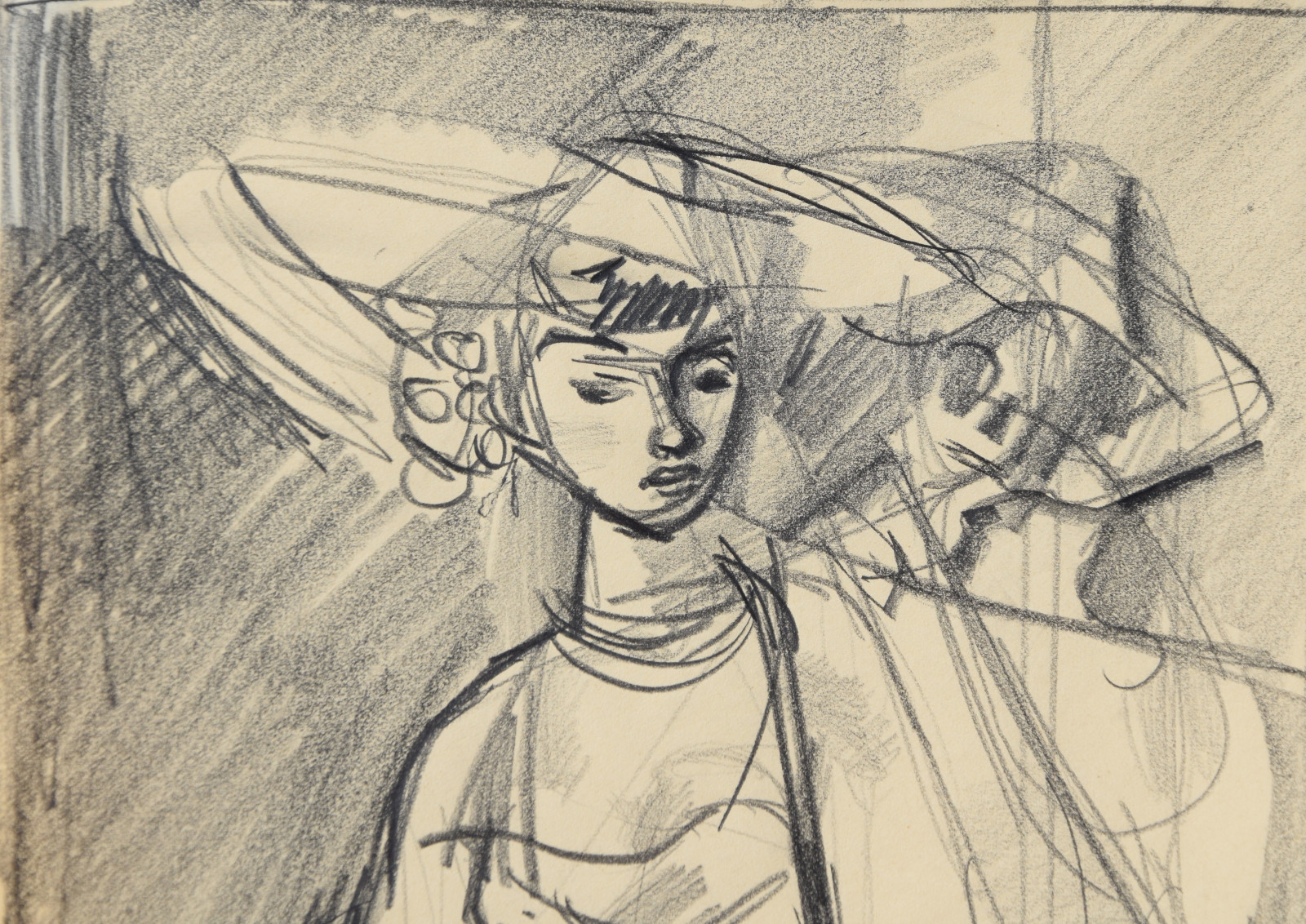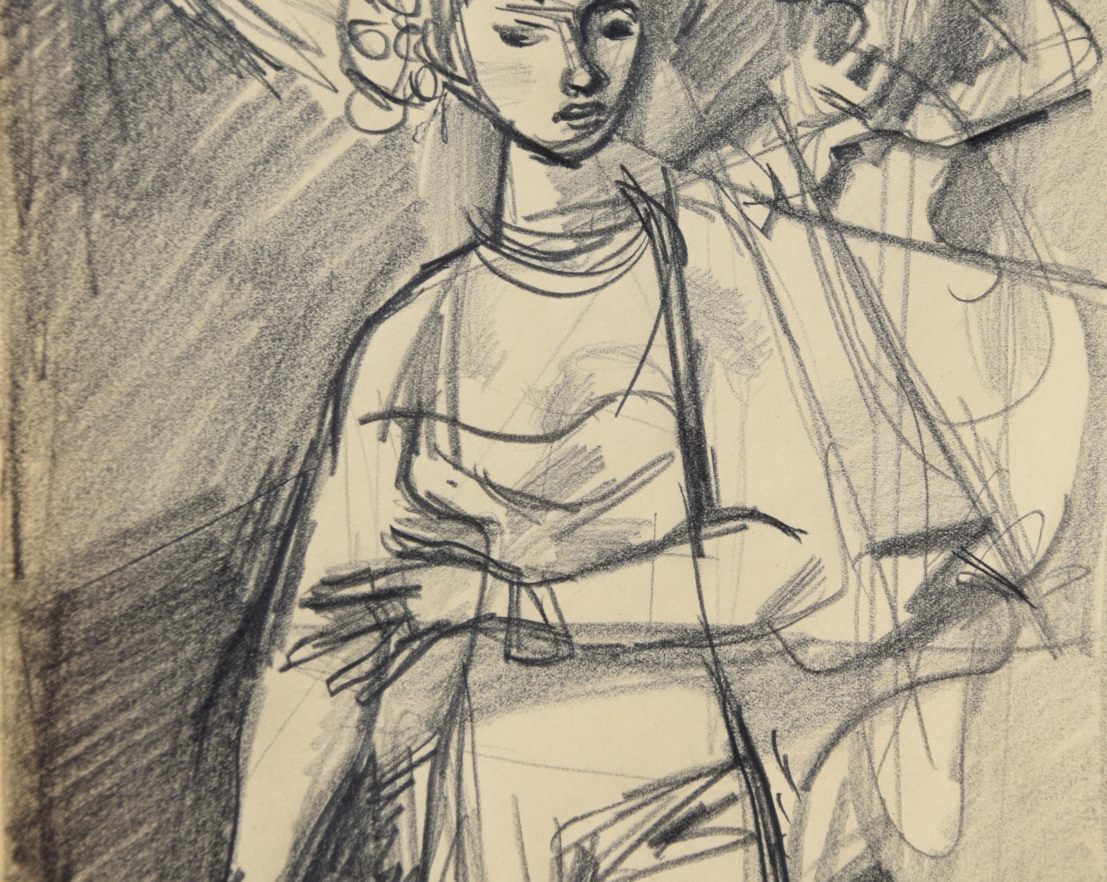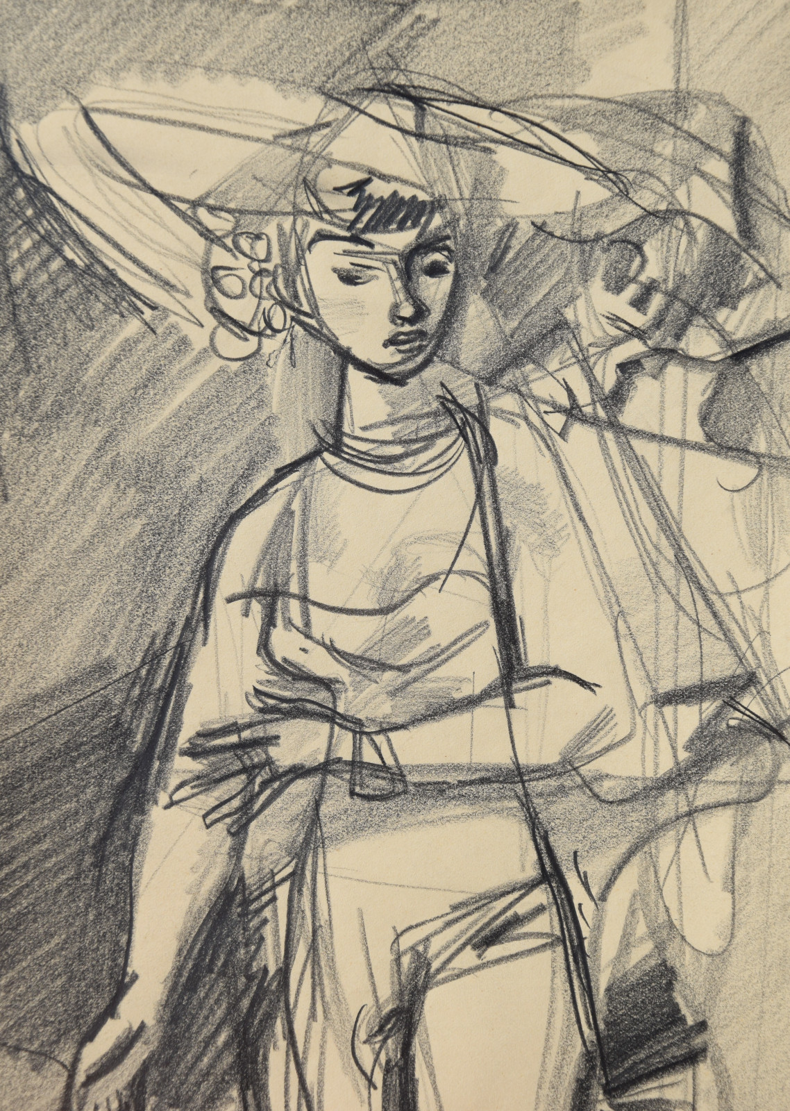 Diese hier vorliegende Zeichnung entstand der Datierung nach in der Anfangsphase seiner Münchner Schaffenszeit. Brust wendet sich nun langsam immer mehr der Ungegenständlichkeit zu, ist hier jedoch noch ganz im Figürlichen. In sehr markanter Zeichenmanier mit verschiedenen Grauabstufungen zeigt sich dem Betrachter das Bildnis einer Frau in einem sonst eher diffusen, unbekannt bleibenden Umfeld. Ihr linker Arm ist erhoben, der rechte Arm hängt herab und sie scheint gerade etwas fallen zu lassen (eine Blume?).