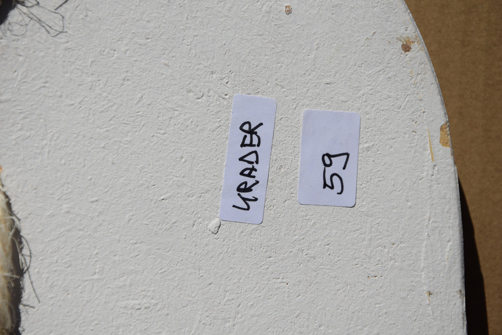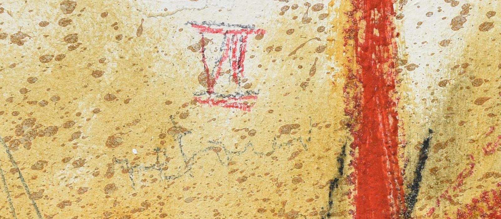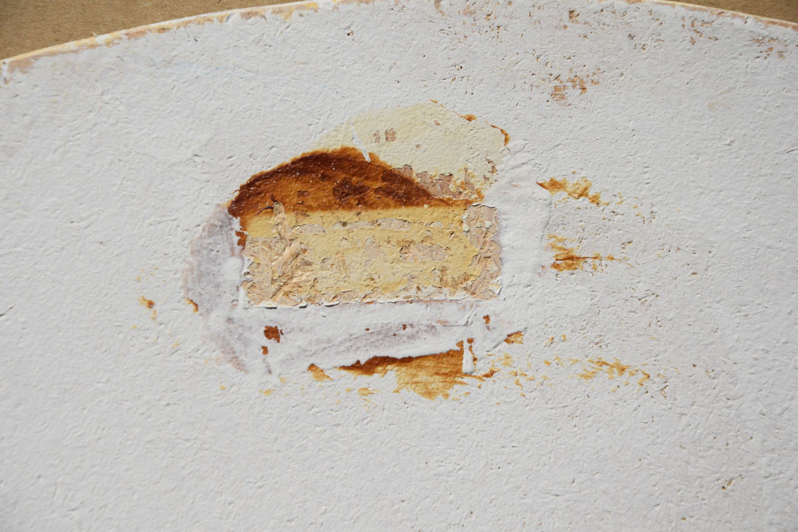 an den Kanten etwas berieben (untere Kante etwas stärker berieben); partiell leicht fleckig; an der Bruchstelle mehrere Retuschen der weißen Farbe, da diese durch die Reibung der beiden leicht beweglichen Bildteile angegriffen wird; die beiden unteren Ecken bestoßen; verso etwas fleckig und berieben; verso oben rechts zwei kleine Aufkleber mit handschriftlicher Bezeichnung und Nummer