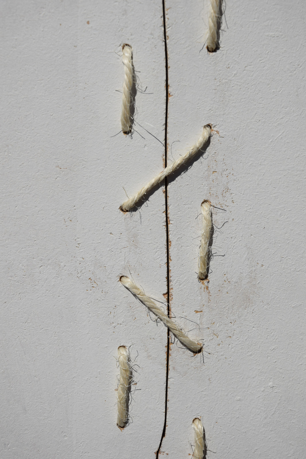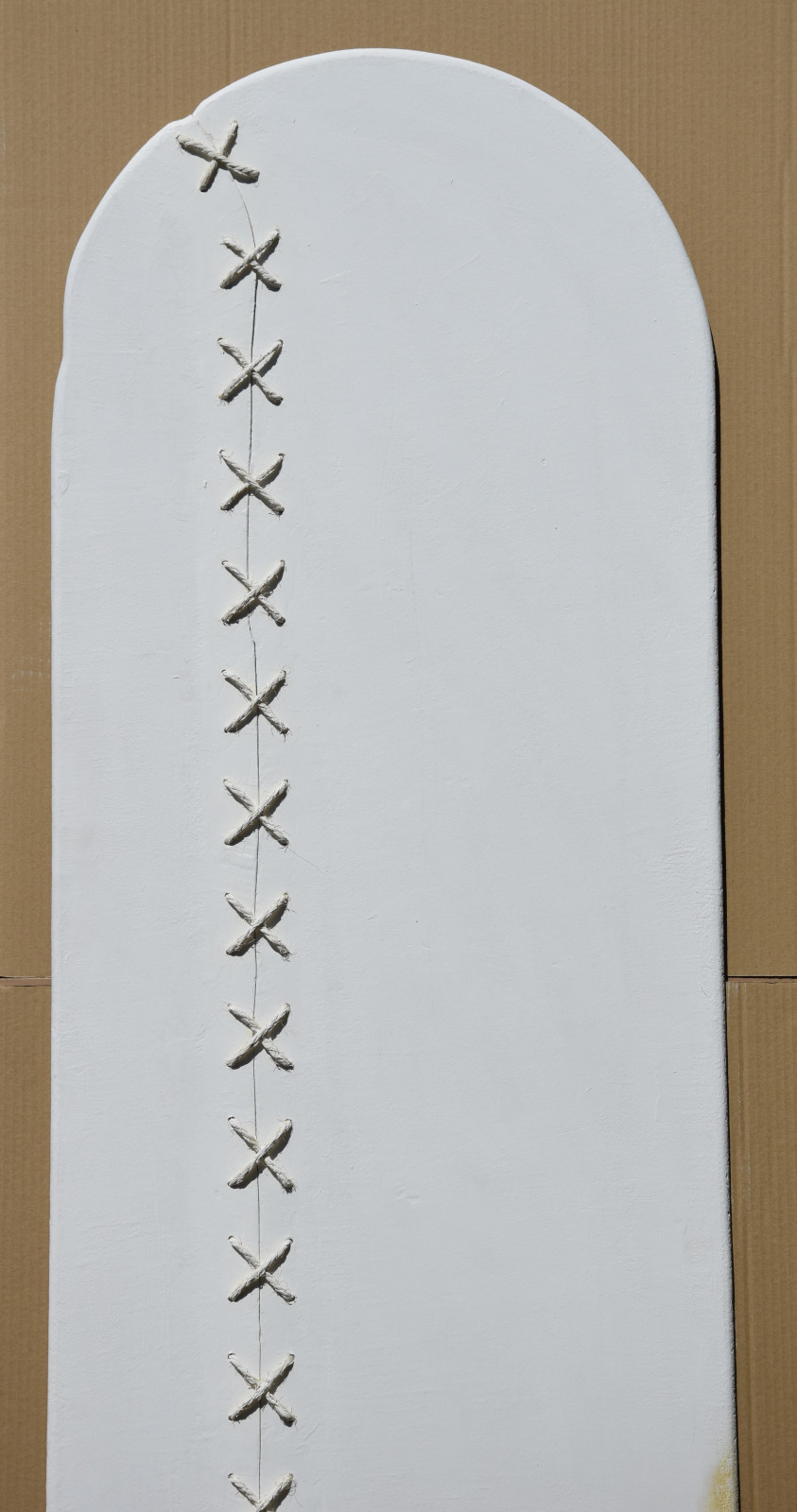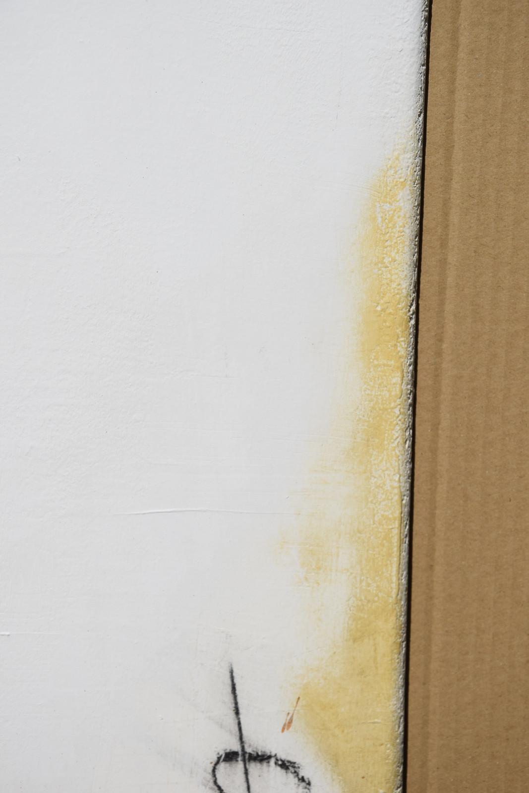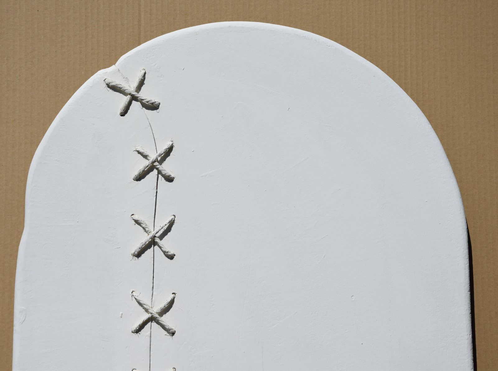 Zwei uneben auseinandergetrennte und ebenso ungleich große Platten, wurden von Neuper komplett weiß bemalt. Die Bruchstelle hat der Künstler einem Chirurgen gleich mit grober Schnur wieder verbunden. Die Naht, die Wunde ist damit immer noch offensichtlich und erkennbar. Farblich ist der größte Teil des Komposition monochrom in Weiß gehalten, einzig der untere Bereich der Platten zeigt eine nebulöse Fläche in Tönen aus Braun und Ocker, sowie darüber gelegte Formen und Strukturen in Rot und Grau-Schwarz. In diesen unteren Bereich wurde nun der Bildtitel – quasi als Bildteil – eingefügt: „Die Tafeln sind kein Tagebuch“. Ein (autobiografischer?) Titel der sicherlich mehr Fragezeichen erzeugt als dass er Antworten liefert…
