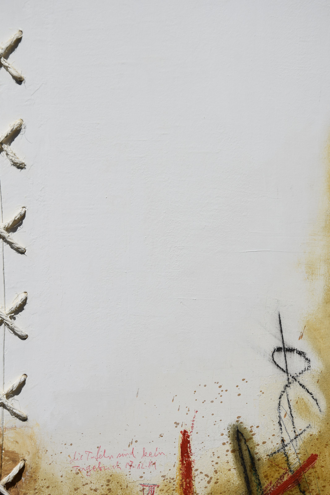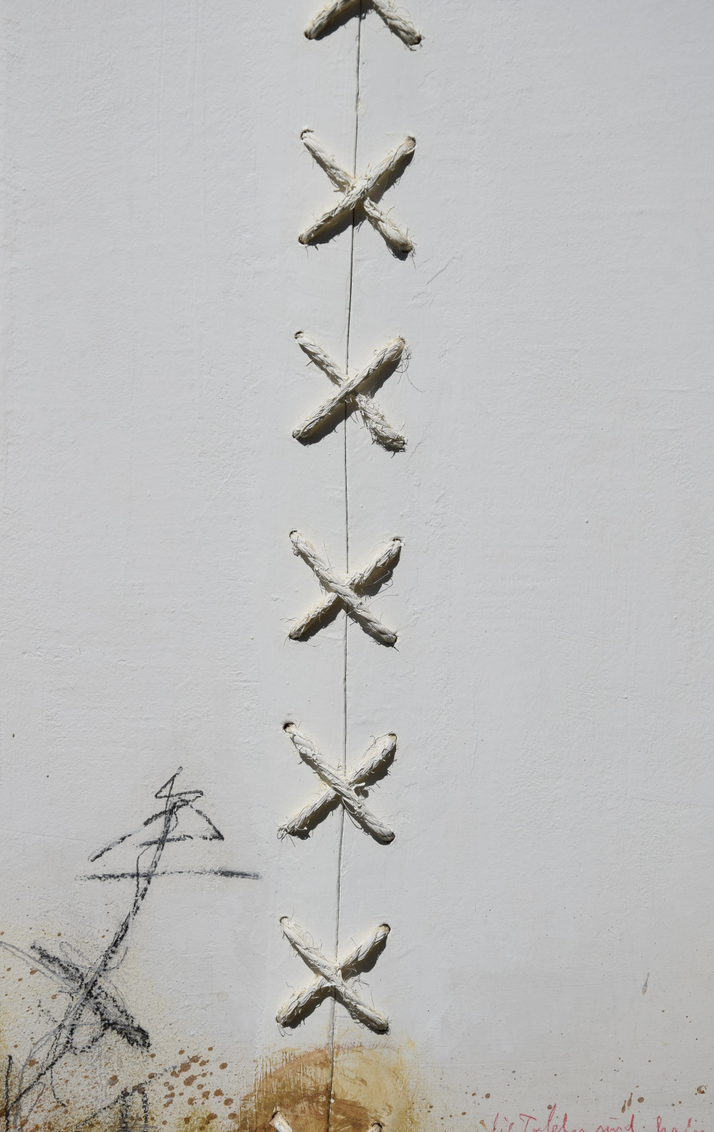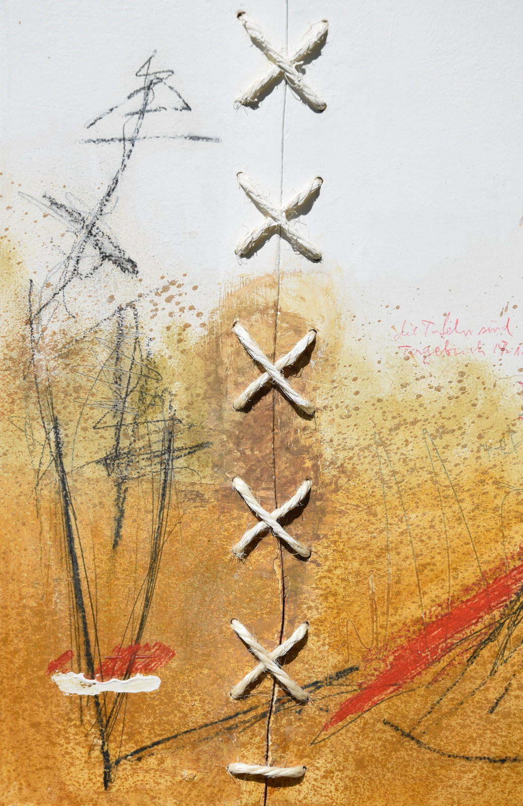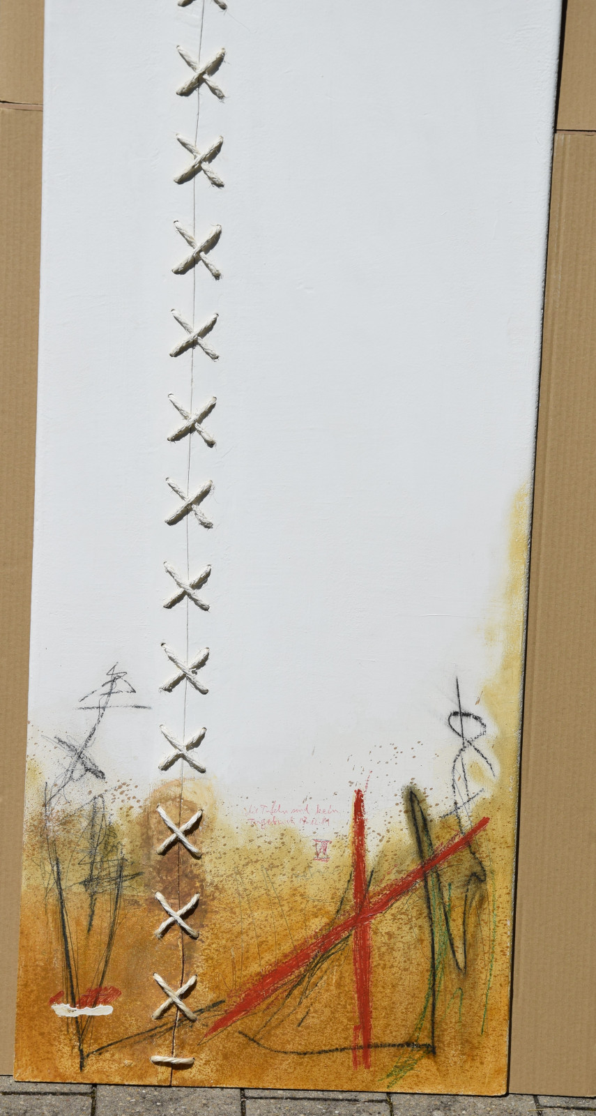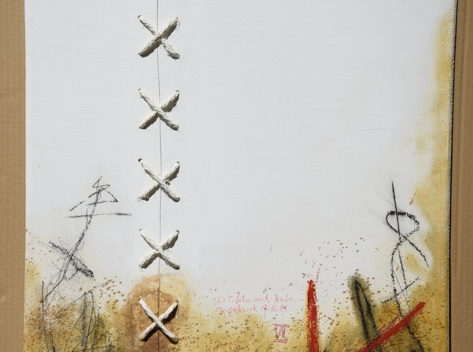 Markant ist an der Ausführung das häufige Wiederkehren des Kreuzsymbols. – Nicht nur an der Naht in Form der Schnur, sondern ganz markant auch unten rechts im roten Kreuz und etwas dezenter links in einem etwas kleineren grauschwarzen Kreuz. Man mag damit sicherlich nicht ohne Grund an Antoni Tapies denken für den gerade das Kreuz von herausragender Bedeutung war und es betrachtete als „Ursymbol menschlicher Orientierung aus der mythischen Geografie, das bevor es christlich motiviert war, die Himmelsrichtungen noch eng mit Mythen verband.“ [1]