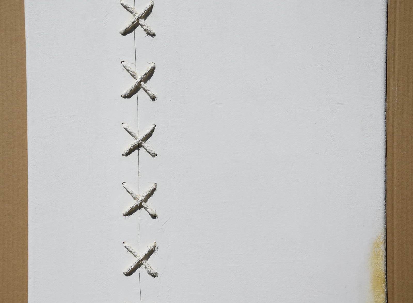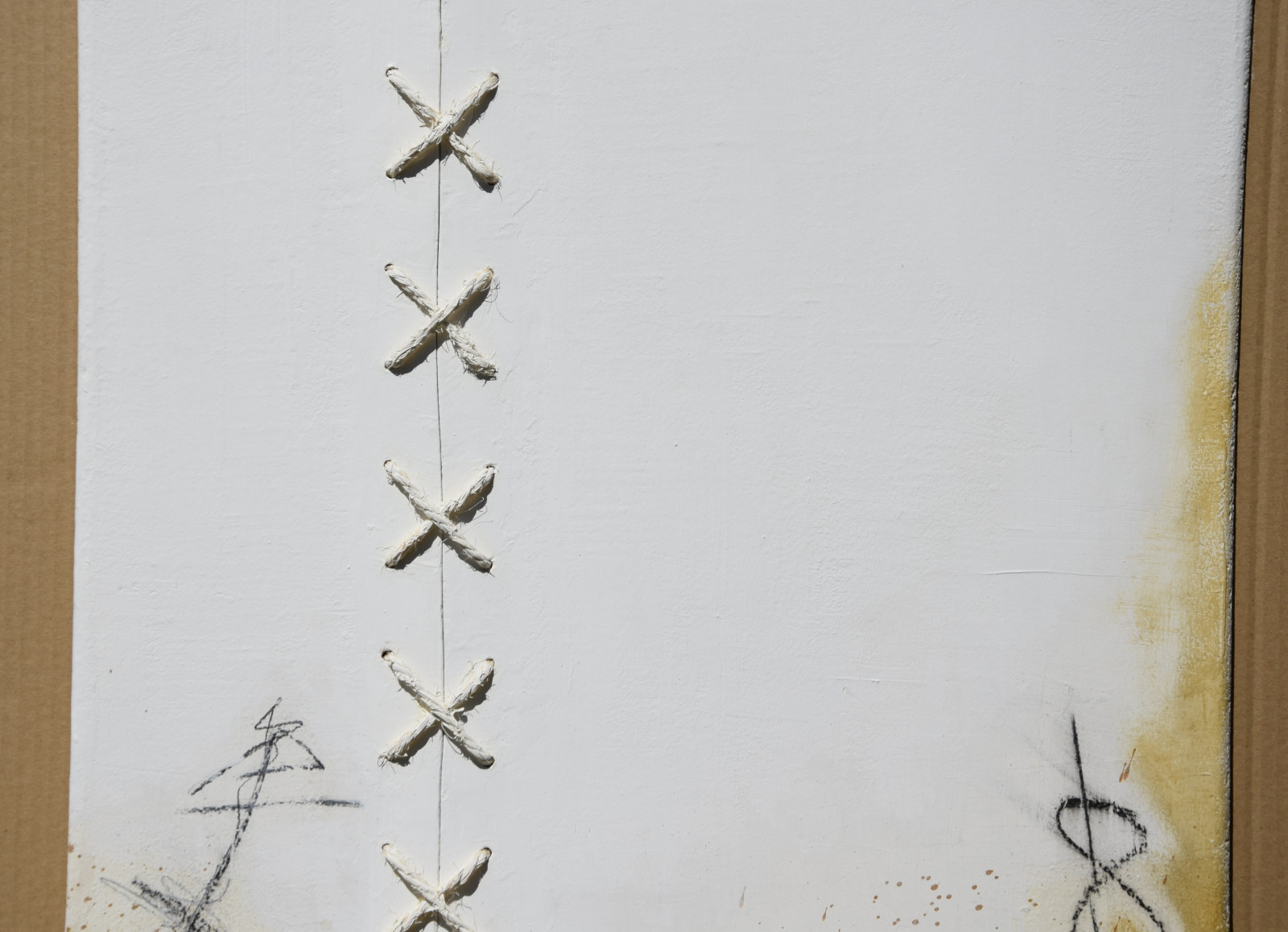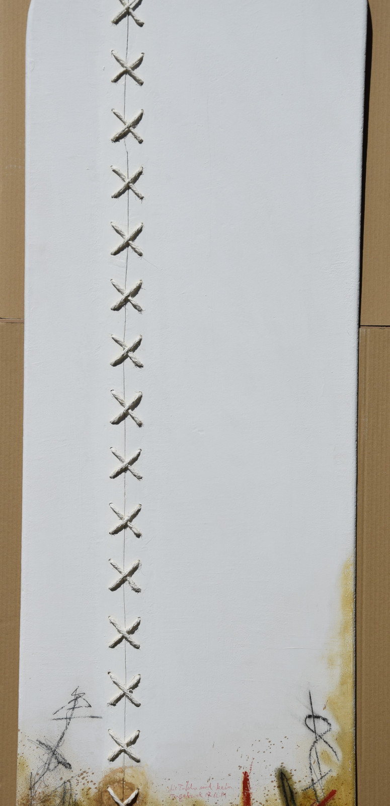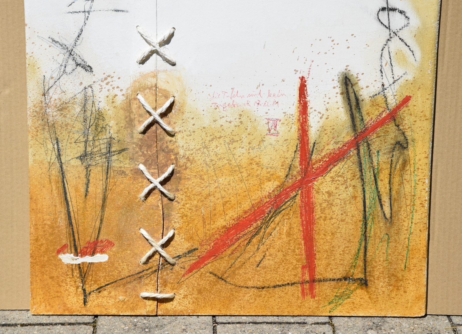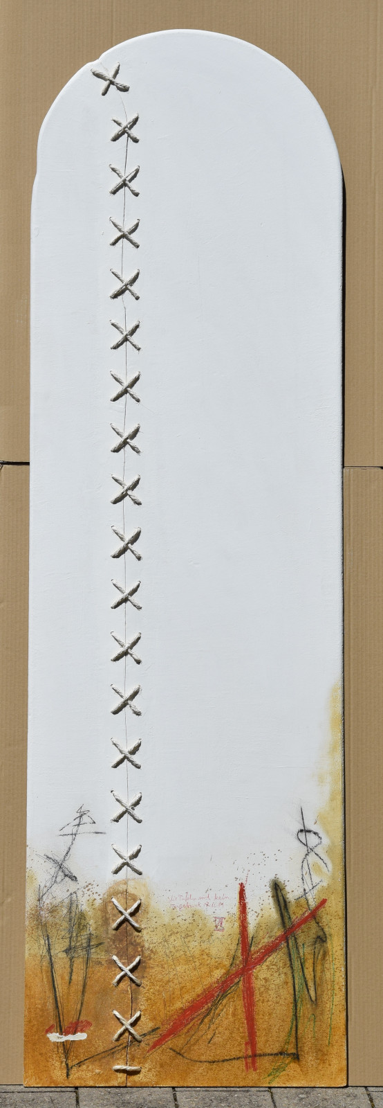 Markant ist an der Ausführung das häufige Wiederkehren des Kreuzsymbols. – Nicht nur an der Naht in Form der Schnur, sondern ganz markant auch unten rechts im roten Kreuz und etwas dezenter links in einem etwas kleineren grauschwarzen Kreuz. Man mag damit sicherlich nicht ohne Grund an Antoni Tapies denken für den gerade das Kreuz von herausragender Bedeutung war und es betrachtete als „Ursymbol menschlicher Orientierung aus der mythischen Geografie, das bevor es christlich motiviert war, die Himmelsrichtungen noch eng mit Mythen verband.“ [1]
