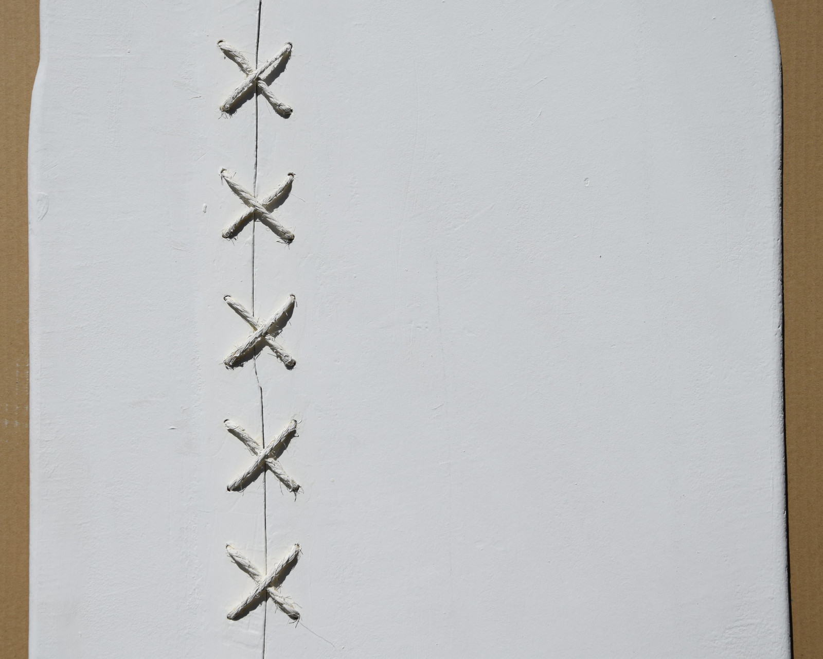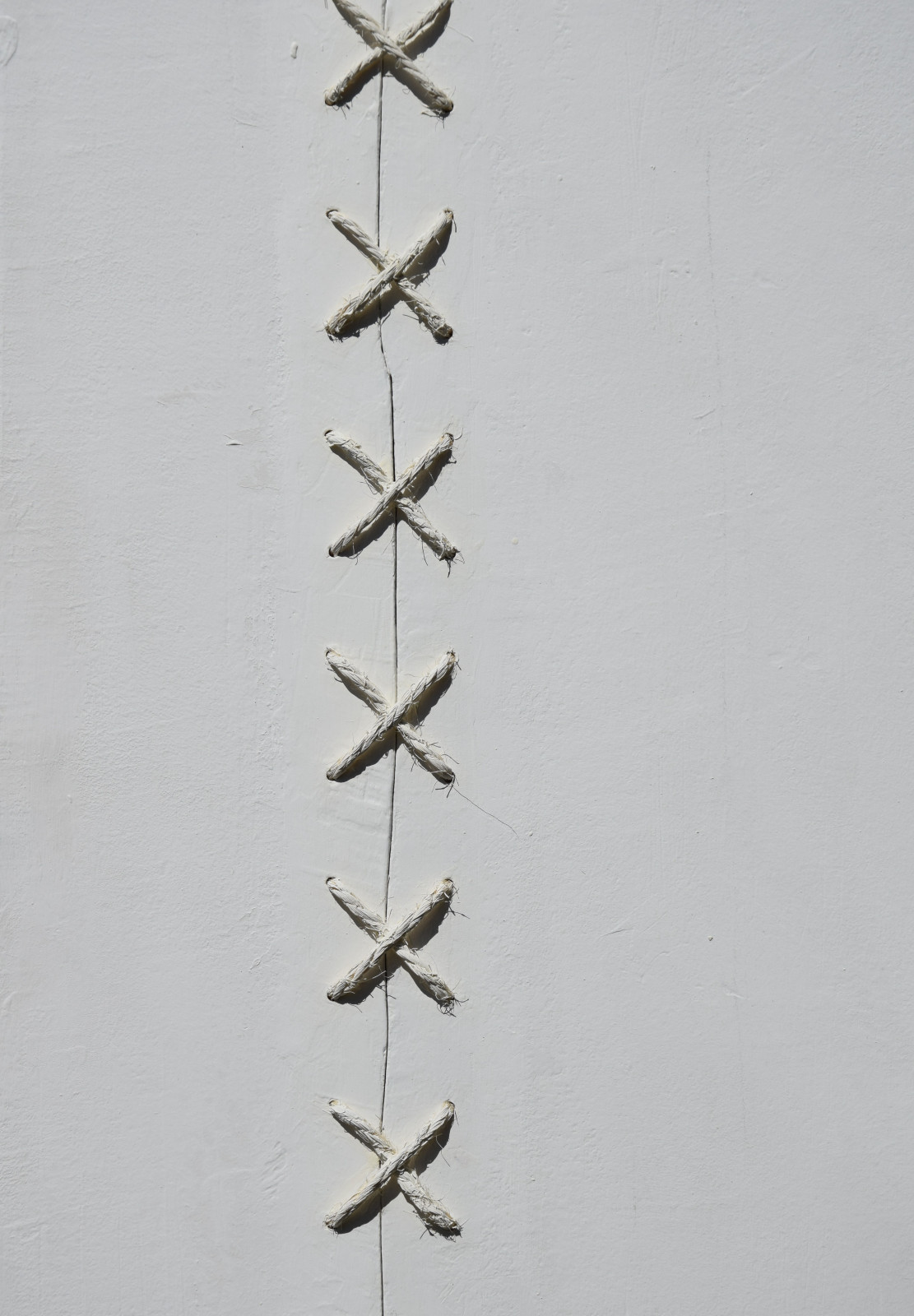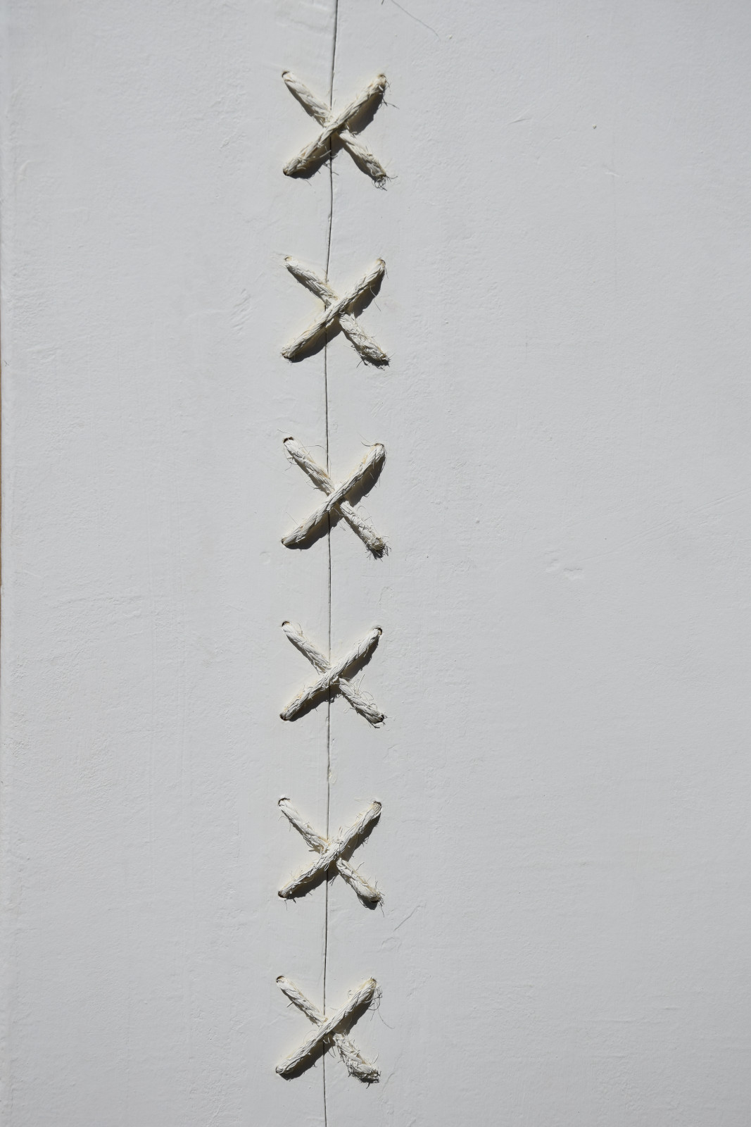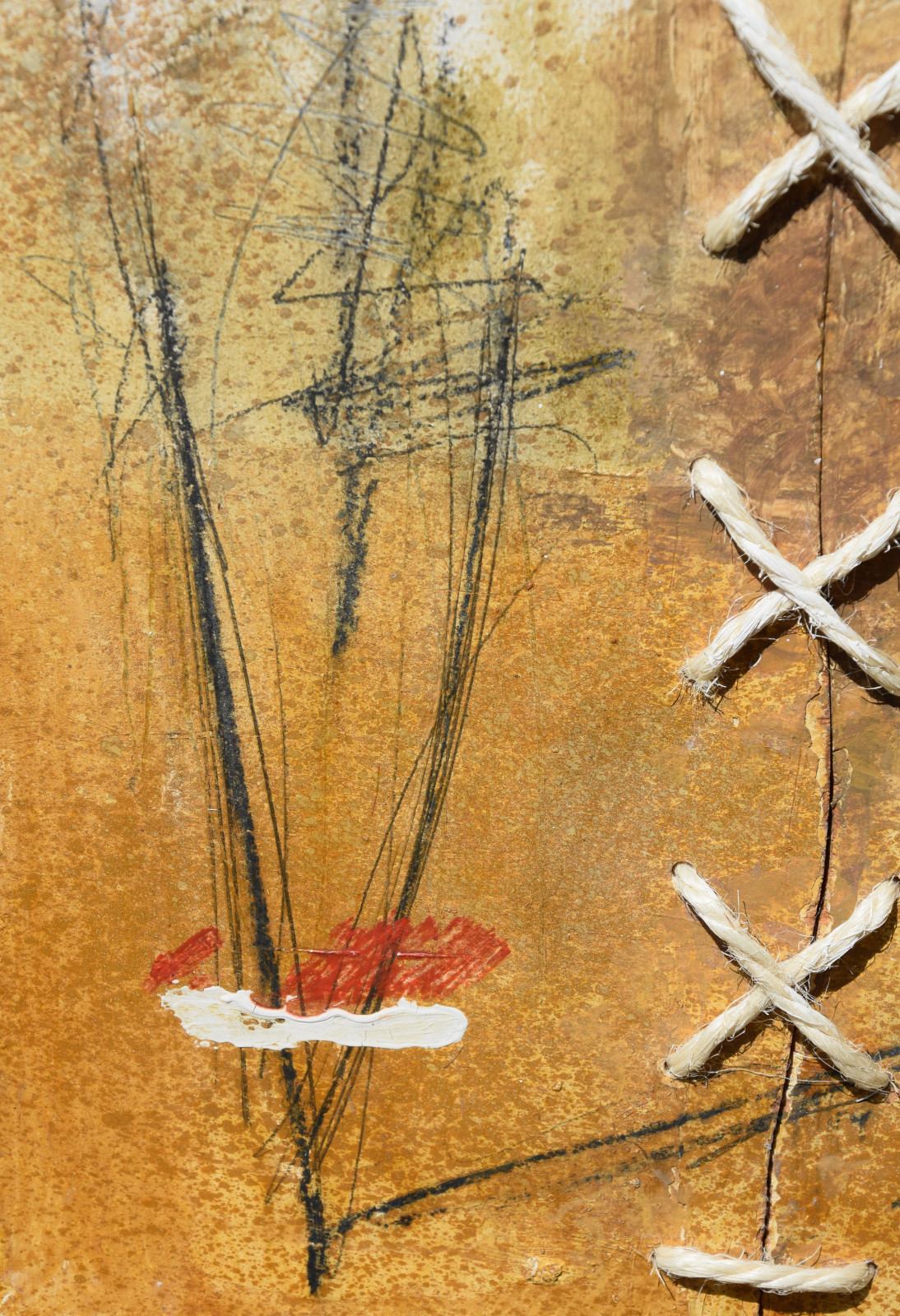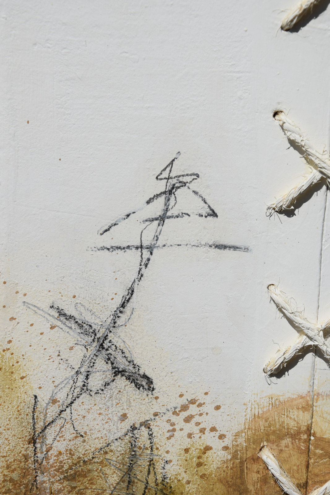 Markant ist an der Ausführung das häufige Wiederkehren des Kreuzsymbols. – Nicht nur an der Naht in Form der Schnur, sondern ganz markant auch unten rechts im roten Kreuz und etwas dezenter links in einem etwas kleineren grauschwarzen Kreuz. Man mag damit sicherlich nicht ohne Grund an Antoni Tapies denken für den gerade das Kreuz von herausragender Bedeutung war und es betrachtete als „Ursymbol menschlicher Orientierung aus der mythischen Geografie, das bevor es christlich motiviert war, die Himmelsrichtungen noch eng mit Mythen verband.“ [1]