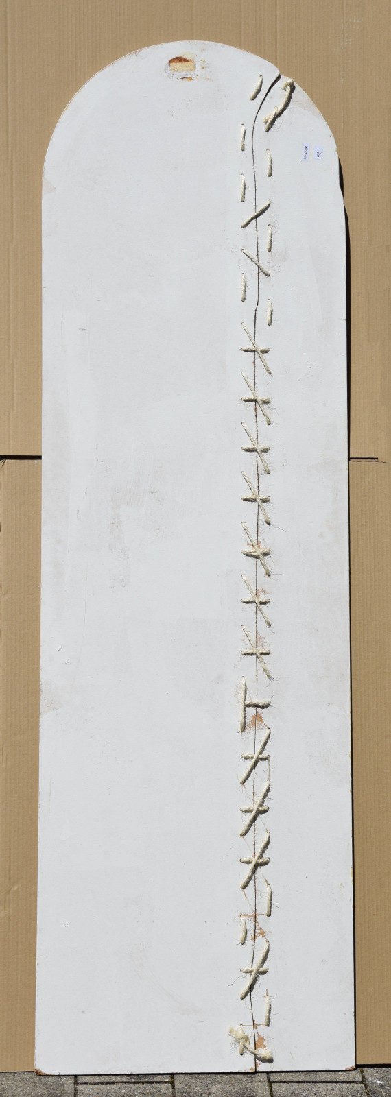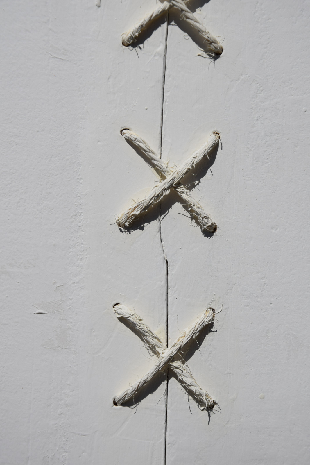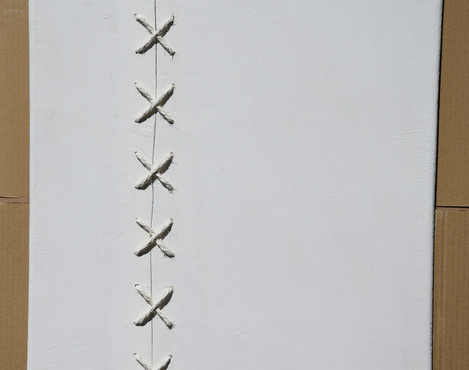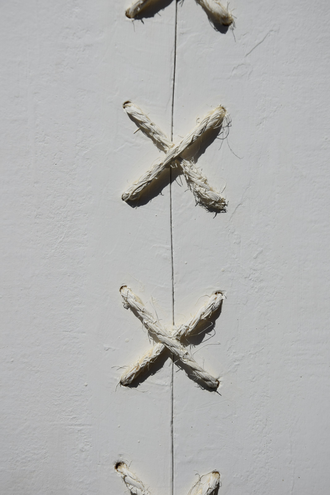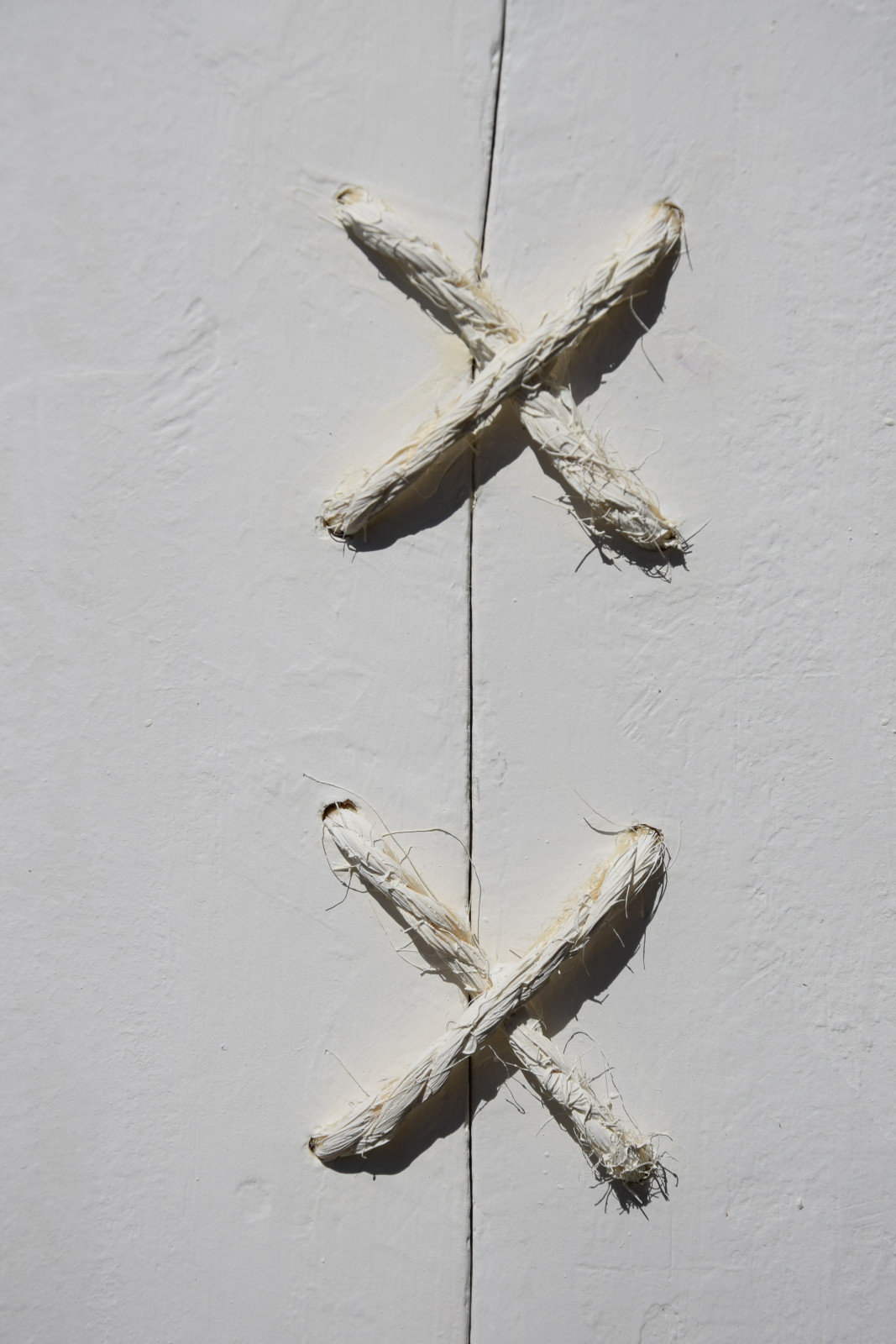 Markant ist an der Ausführung das häufige Wiederkehren des Kreuzsymbols. – Nicht nur an der Naht in Form der Schnur, sondern ganz markant auch unten rechts im roten Kreuz und etwas dezenter links in einem etwas kleineren grauschwarzen Kreuz. Man mag damit sicherlich nicht ohne Grund an Antoni Tapies denken für den gerade das Kreuz von herausragender Bedeutung war und es betrachtete als „Ursymbol menschlicher Orientierung aus der mythischen Geografie, das bevor es christlich motiviert war, die Himmelsrichtungen noch eng mit Mythen verband.“ [1]