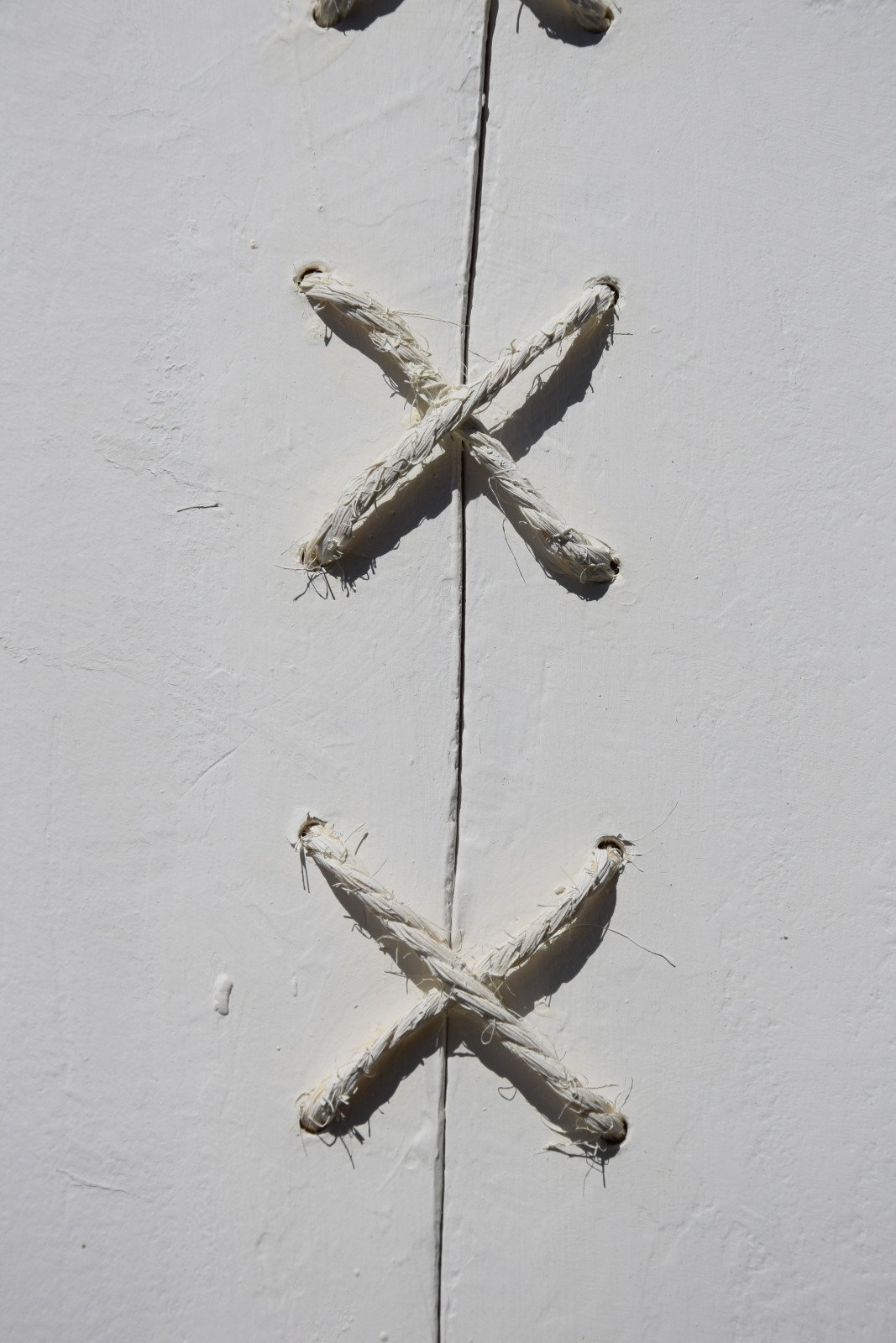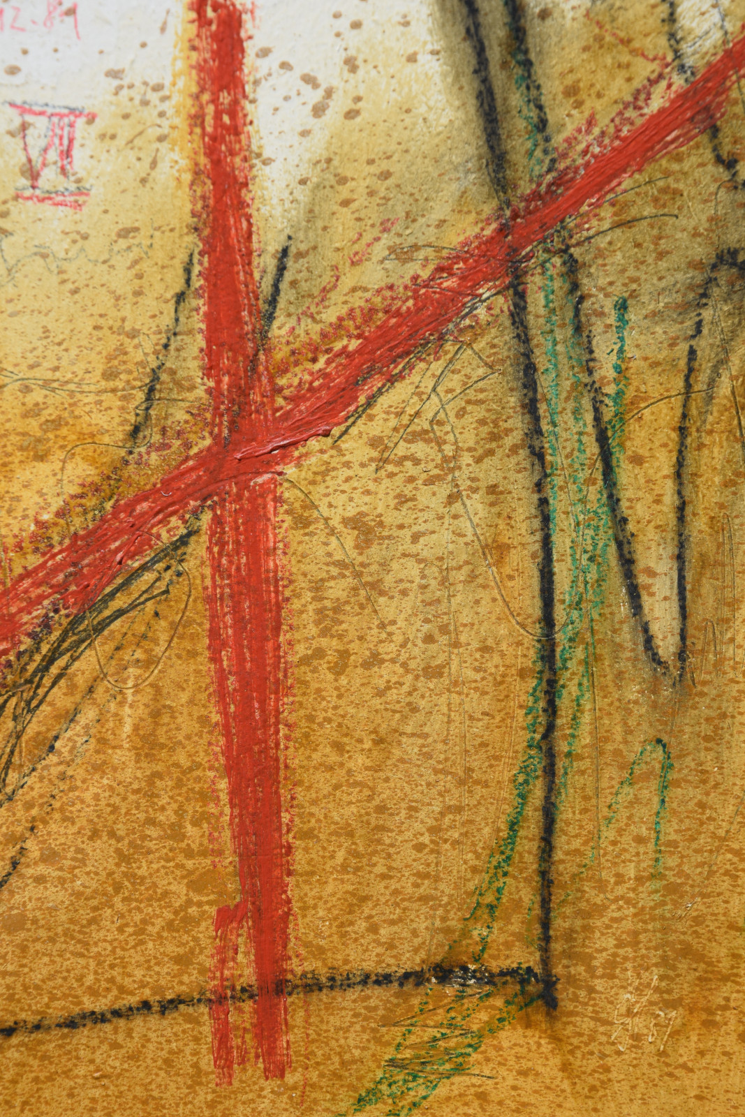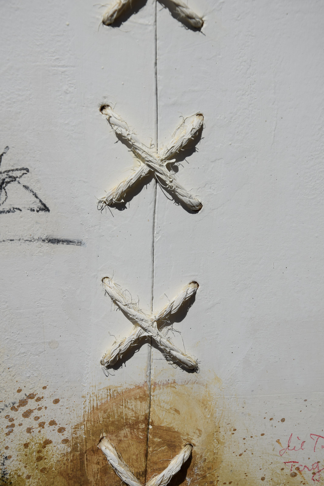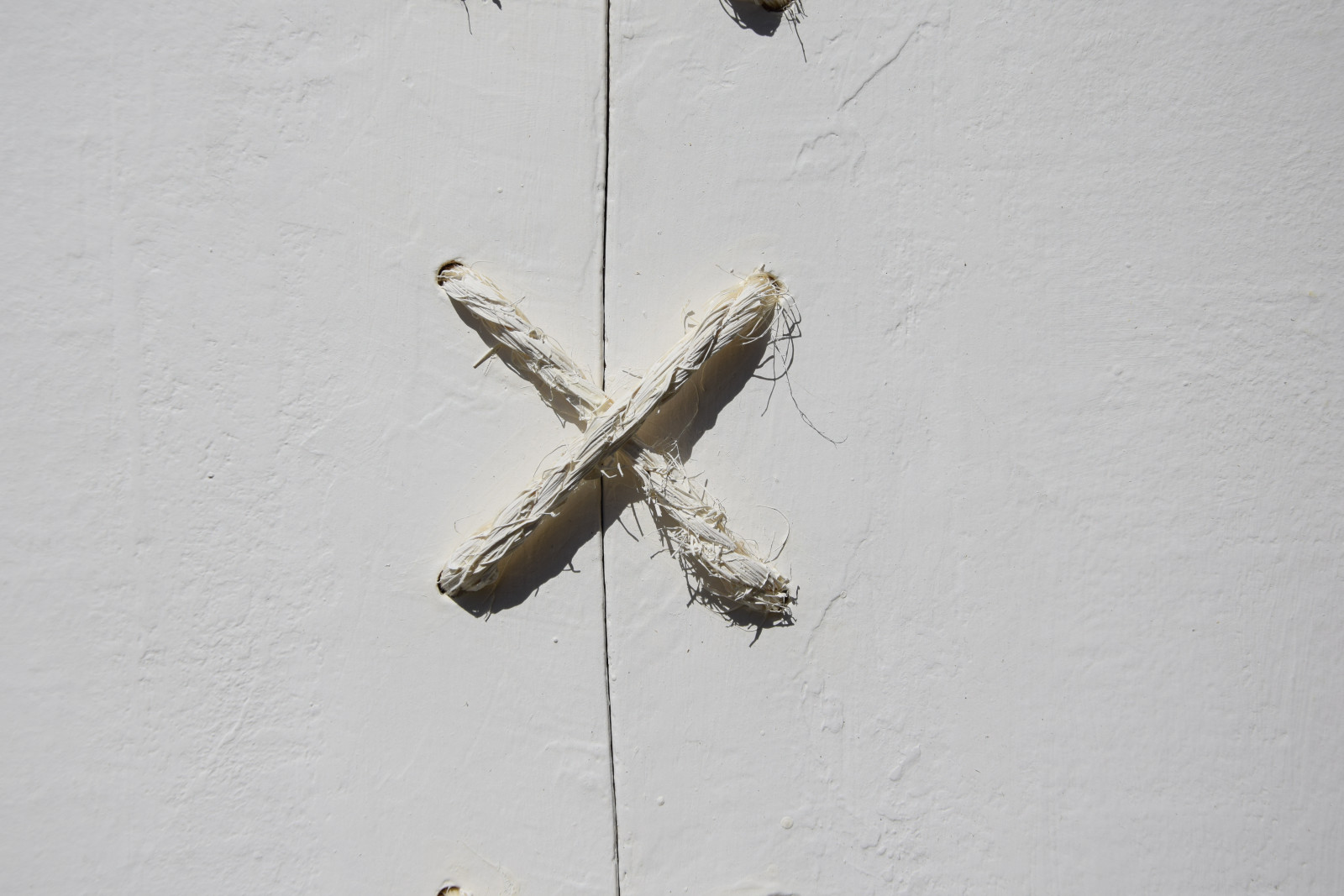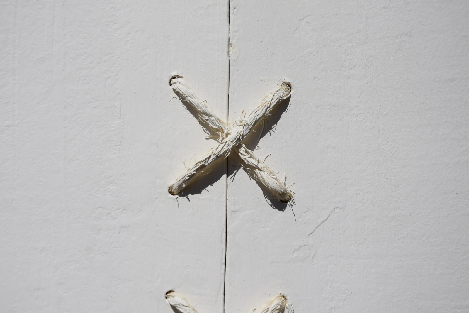 Markant ist an der Ausführung das häufige Wiederkehren des Kreuzsymbols. – Nicht nur an der Naht in Form der Schnur, sondern ganz markant auch unten rechts im roten Kreuz und etwas dezenter links in einem etwas kleineren grauschwarzen Kreuz. Man mag damit sicherlich nicht ohne Grund an Antoni Tapies denken für den gerade das Kreuz von herausragender Bedeutung war und es betrachtete als „Ursymbol menschlicher Orientierung aus der mythischen Geografie, das bevor es christlich motiviert war, die Himmelsrichtungen noch eng mit Mythen verband.“ [1]