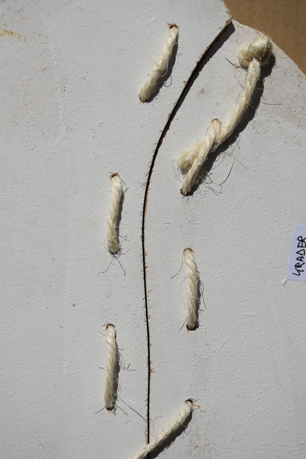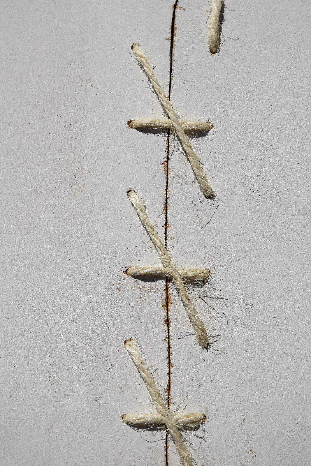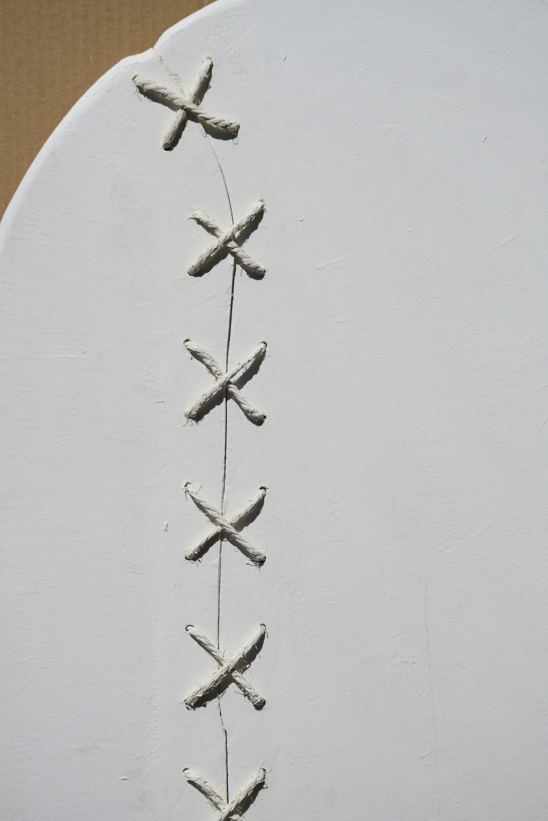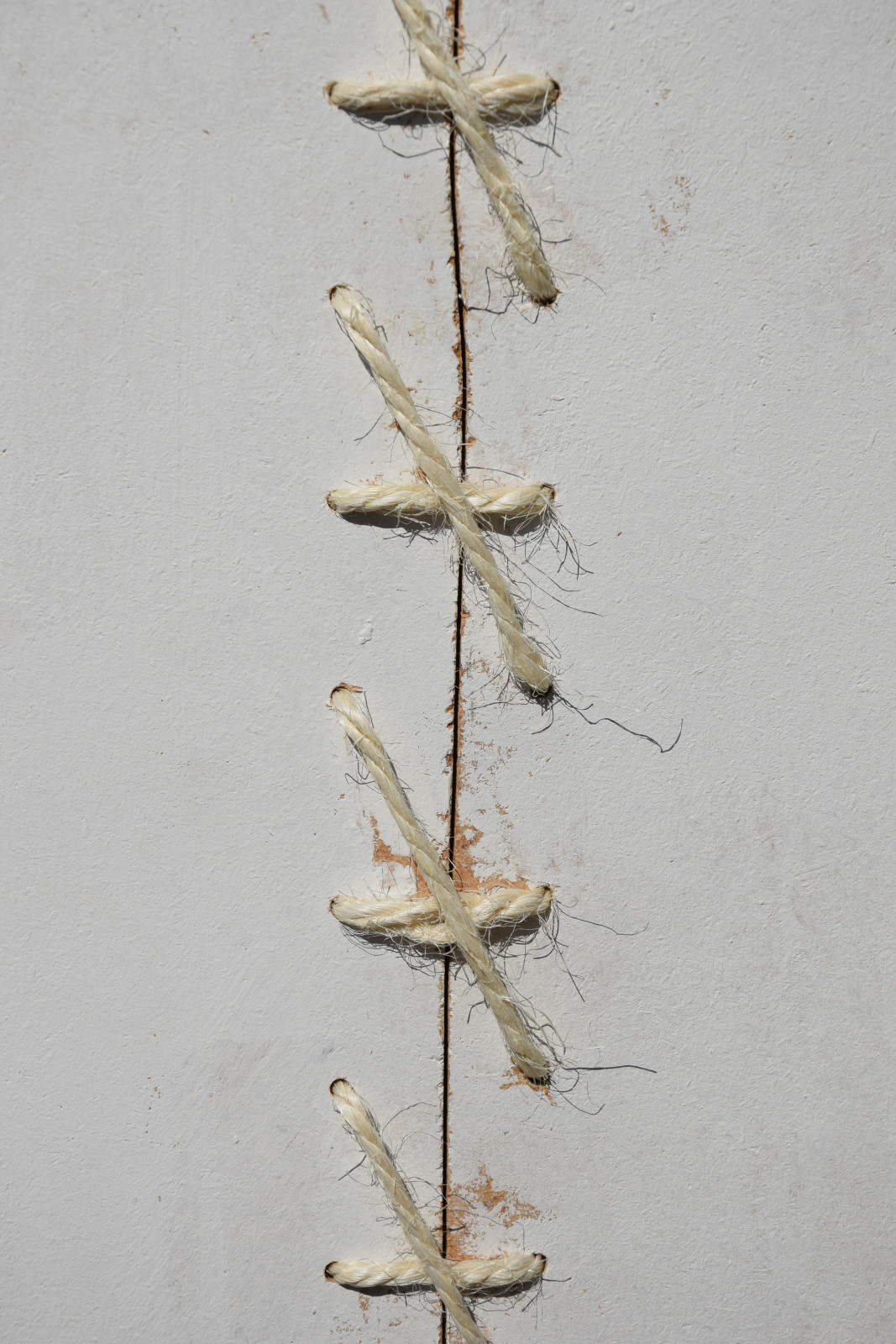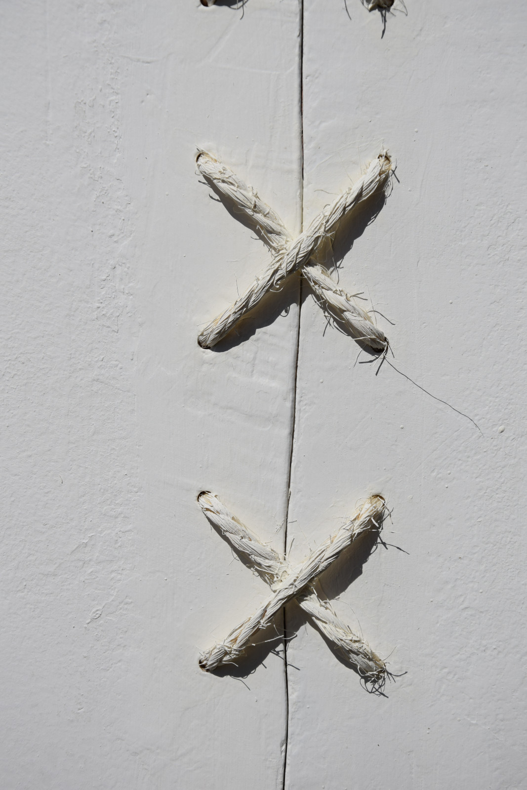 Markant ist an der Ausführung das häufige Wiederkehren des Kreuzsymbols. – Nicht nur an der Naht in Form der Schnur, sondern ganz markant auch unten rechts im roten Kreuz und etwas dezenter links in einem etwas kleineren grauschwarzen Kreuz. Man mag damit sicherlich nicht ohne Grund an Antoni Tapies denken für den gerade das Kreuz von herausragender Bedeutung war und es betrachtete als „Ursymbol menschlicher Orientierung aus der mythischen Geografie, das bevor es christlich motiviert war, die Himmelsrichtungen noch eng mit Mythen verband.“ [1]