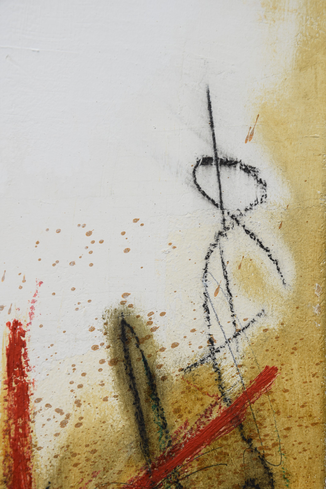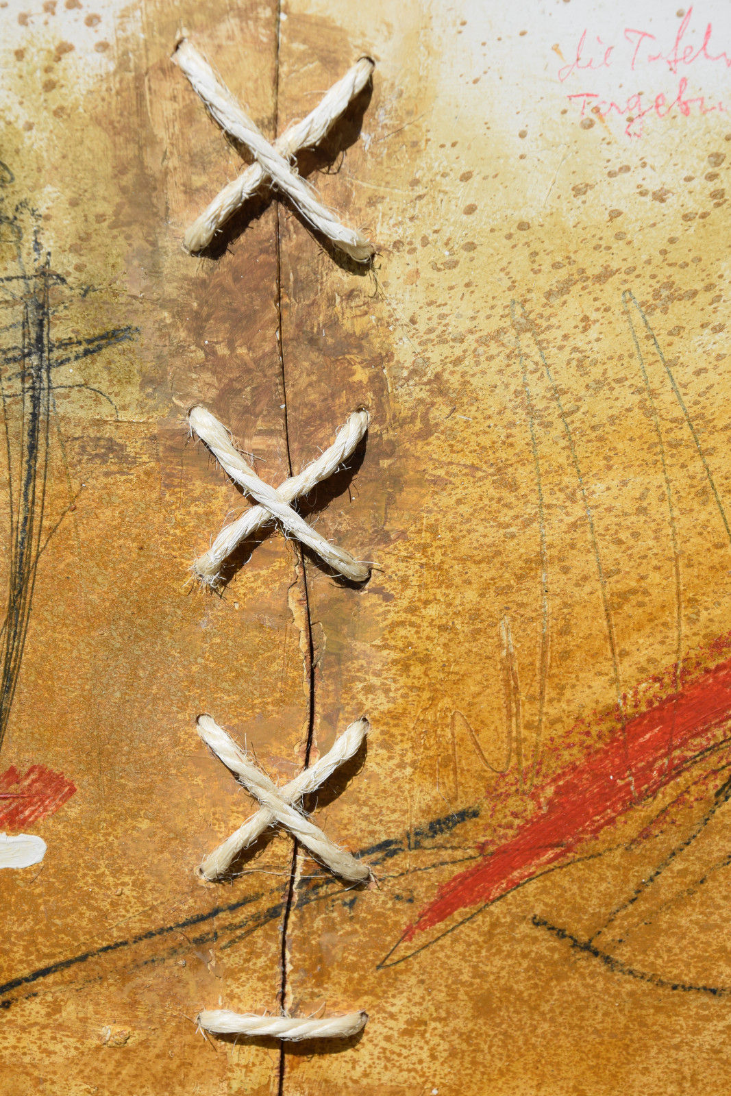 Mischtechnik (Öl-, Deckfarben, Ölkreiden, Bleistift) auf zwei durch Schnur aneinander gebundenen Platten