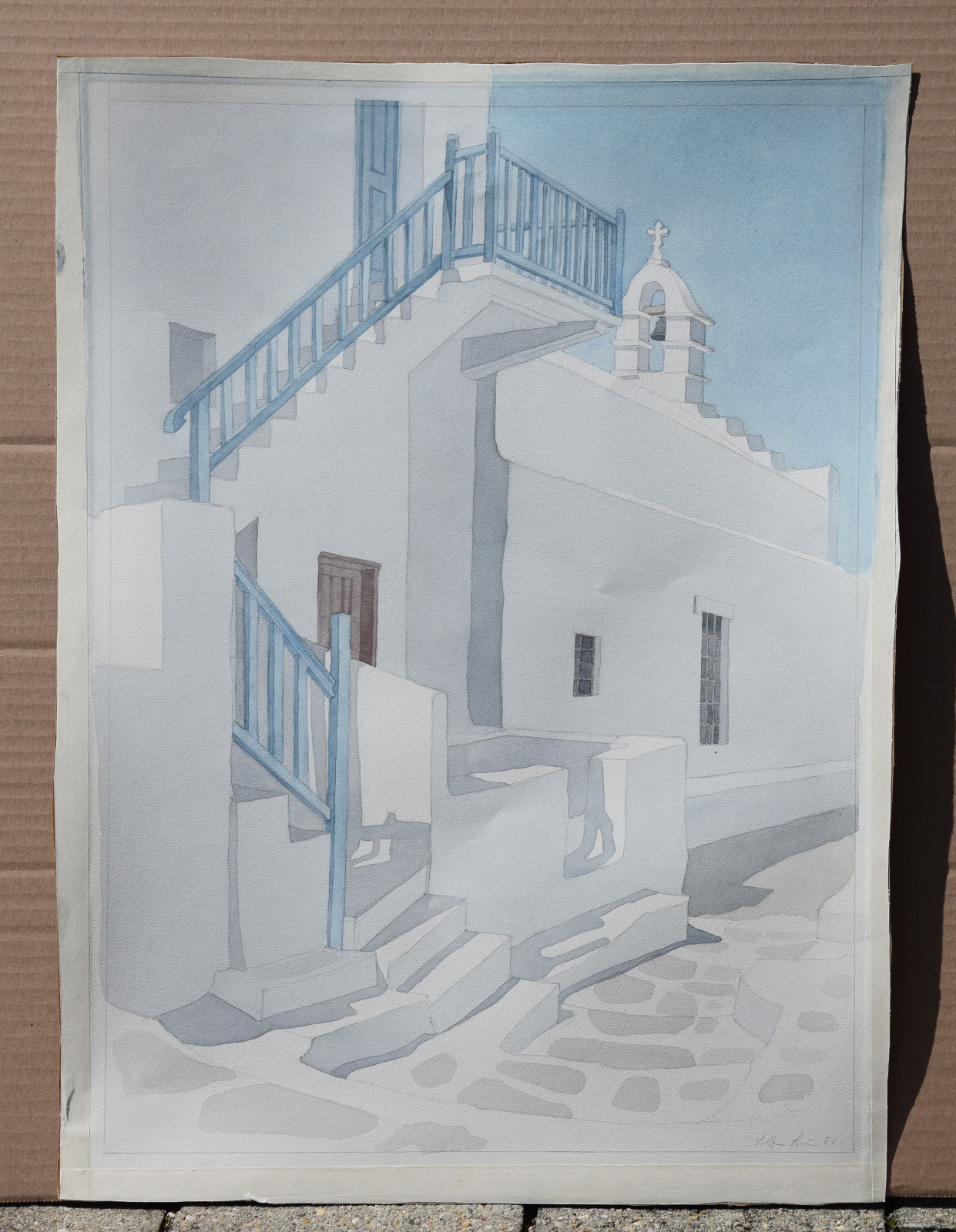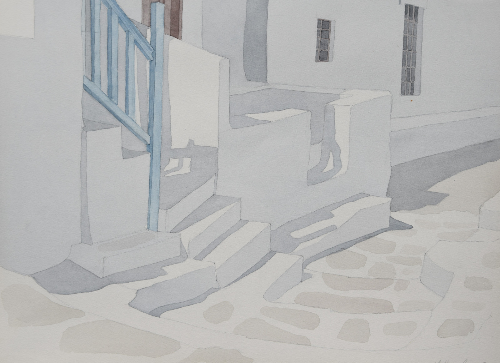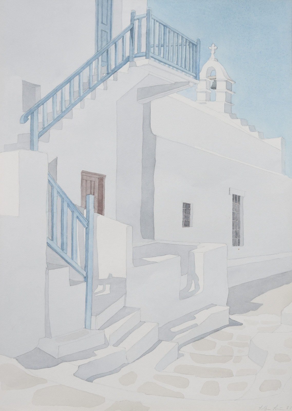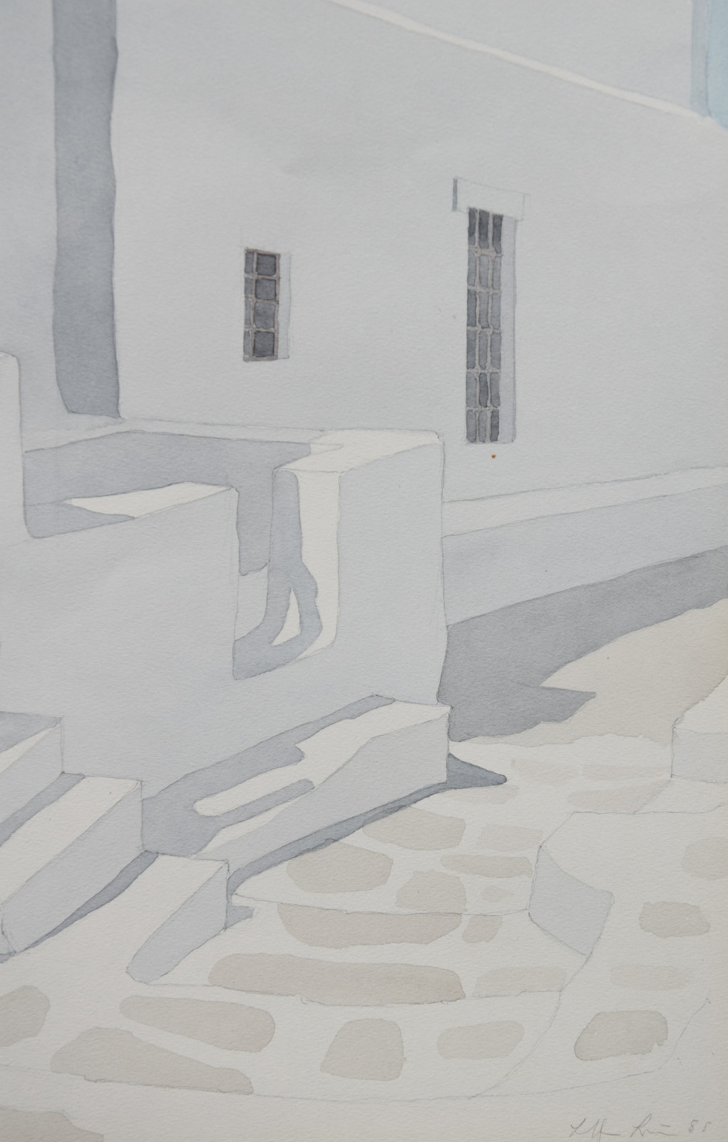 Das vorliegende Aquarell ist eine für Lothar Braun ganz typische, reduzierte und auch klar strukturierte Komposition mit einem Blick auf kubische Gebäude und Gebäudeteile, die merklich an Orte auf den Kykladen denken lassen. Braun hat diese faszinierenden Bauwerke immer wieder als Motiv gewählt, wodurch ihm ein ganz eigener Zugang zur künstlerischen Landschafts- und Stadtdarstellung gelang.