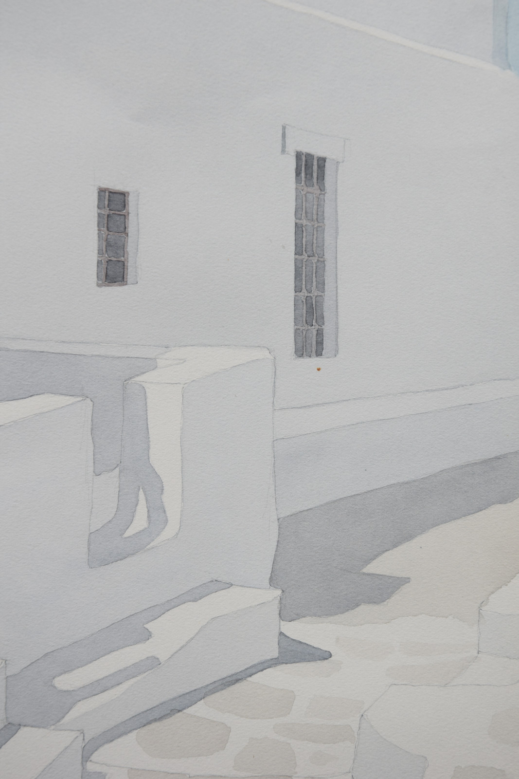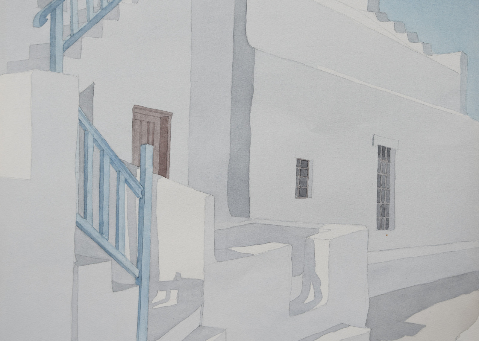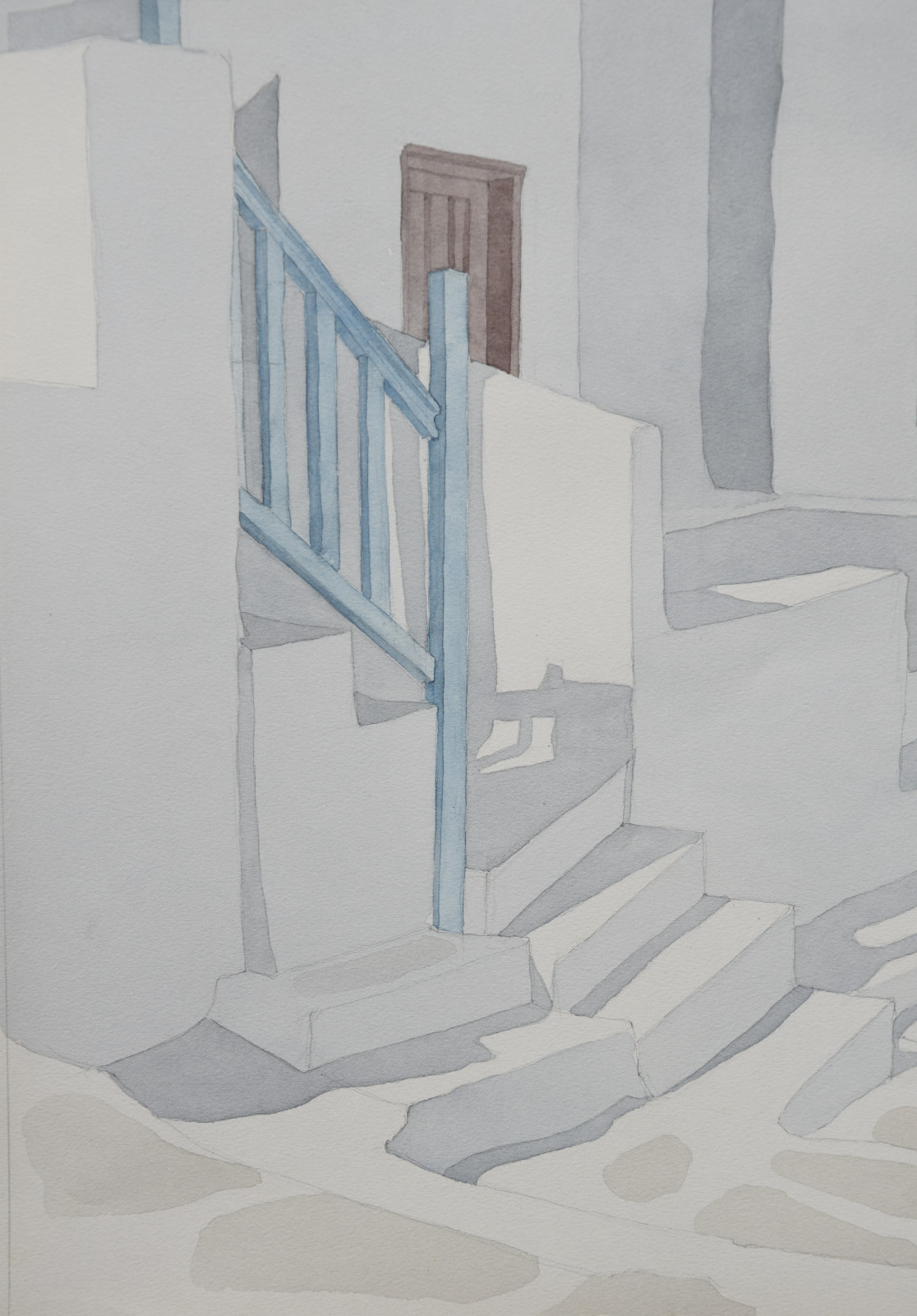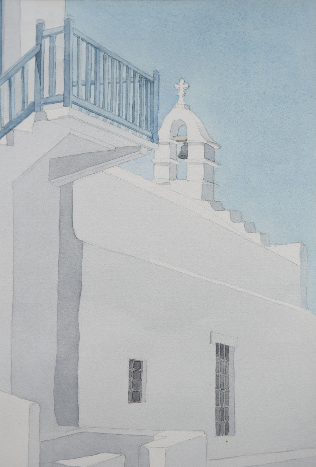 Das vorliegende Aquarell ist eine für Lothar Braun ganz typische, reduzierte und auch klar strukturierte Komposition mit einem Blick auf kubische Gebäude und Gebäudeteile, die merklich an Orte auf den Kykladen denken lassen. Braun hat diese faszinierenden Bauwerke immer wieder als Motiv gewählt, wodurch ihm ein ganz eigener Zugang zur künstlerischen Landschafts- und Stadtdarstellung gelang.