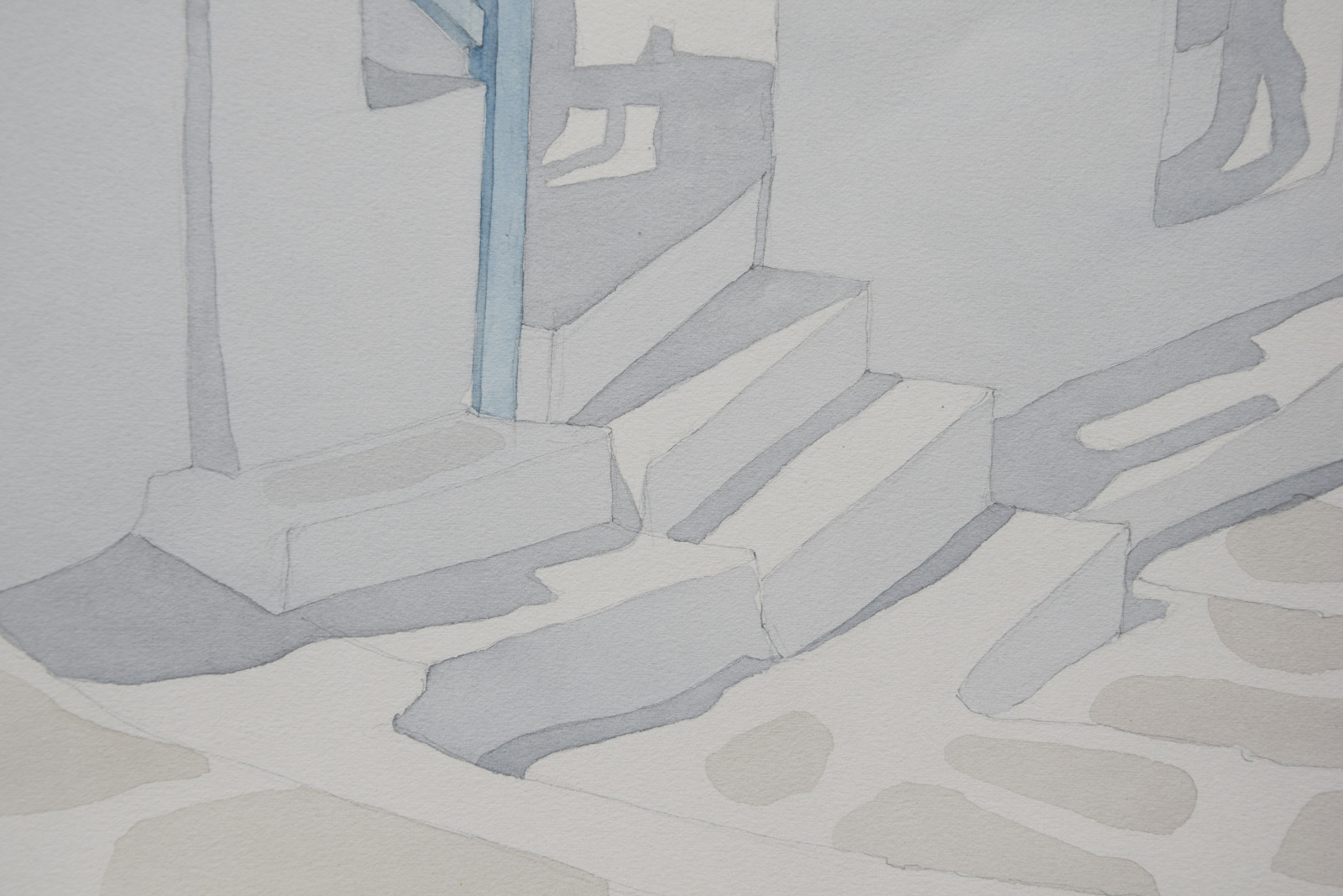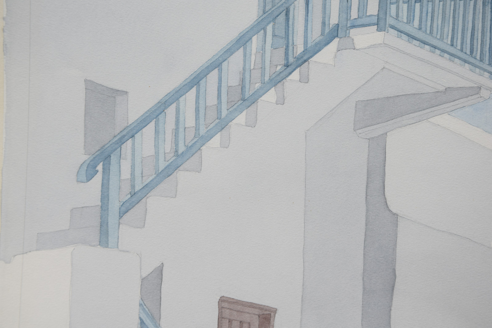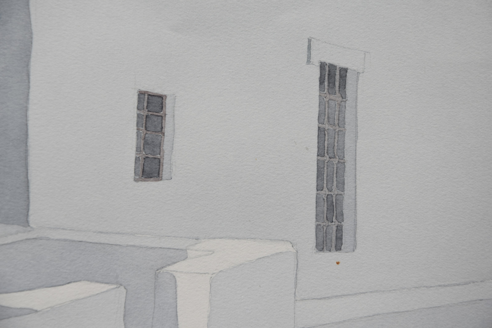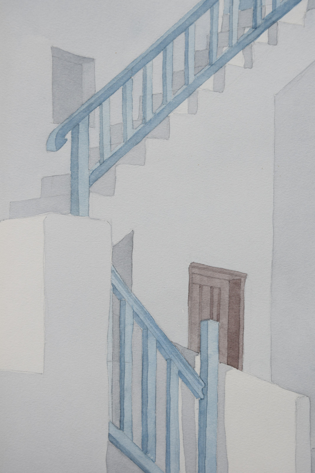 Das vorliegende Aquarell ist eine für Lothar Braun ganz typische, reduzierte und auch klar strukturierte Komposition mit einem Blick auf kubische Gebäude und Gebäudeteile, die merklich an Orte auf den Kykladen denken lassen. Braun hat diese faszinierenden Bauwerke immer wieder als Motiv gewählt, wodurch ihm ein ganz eigener Zugang zur künstlerischen Landschafts- und Stadtdarstellung gelang.