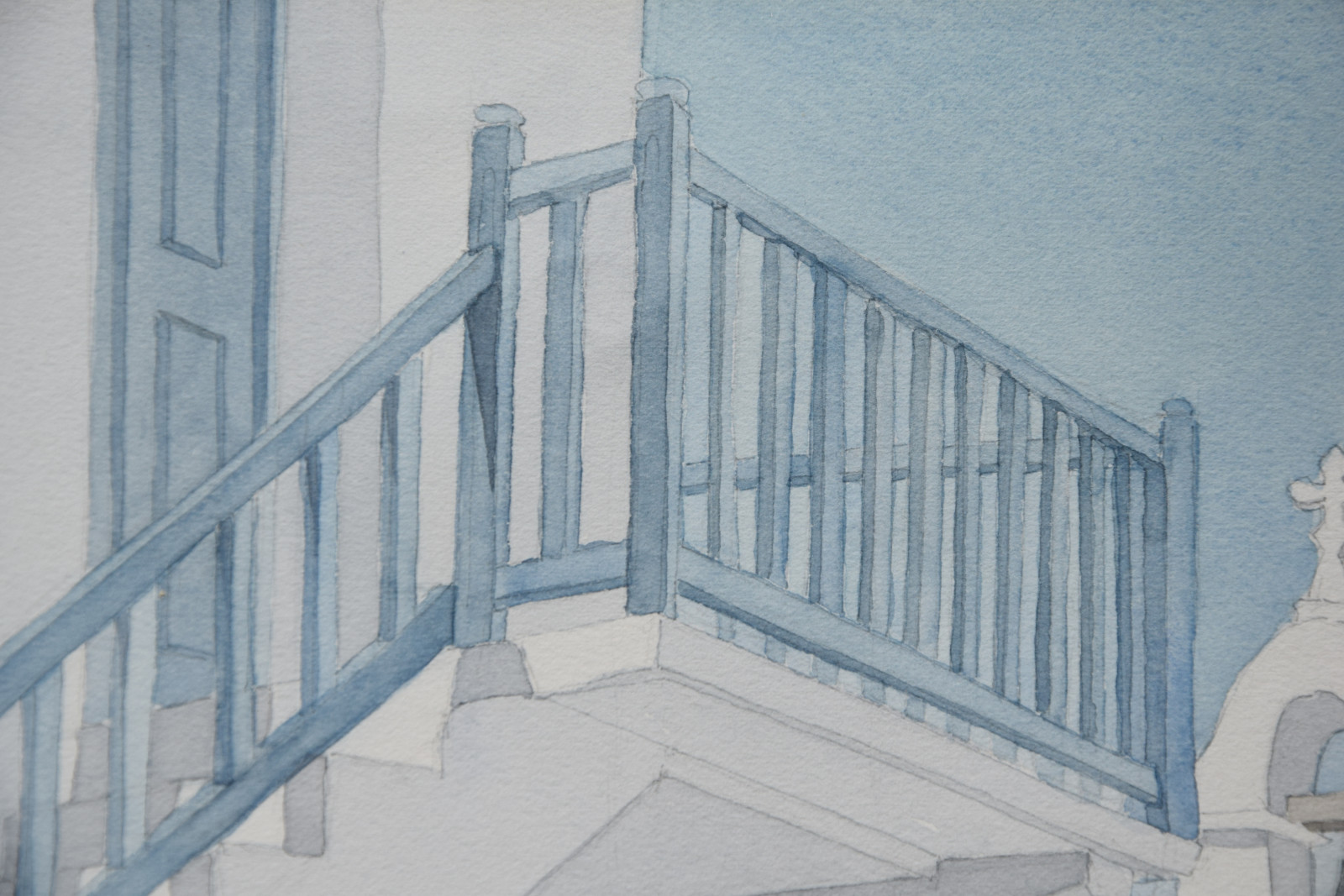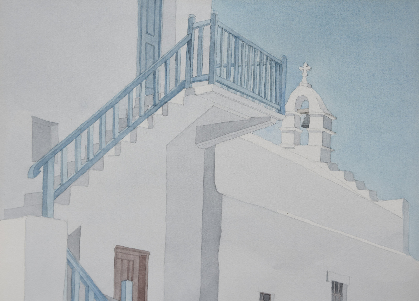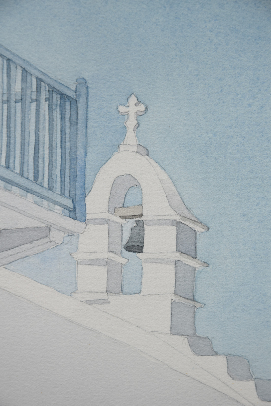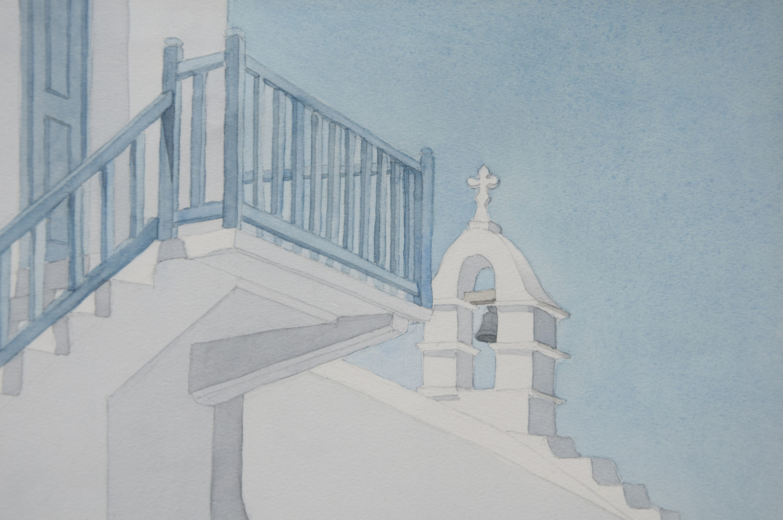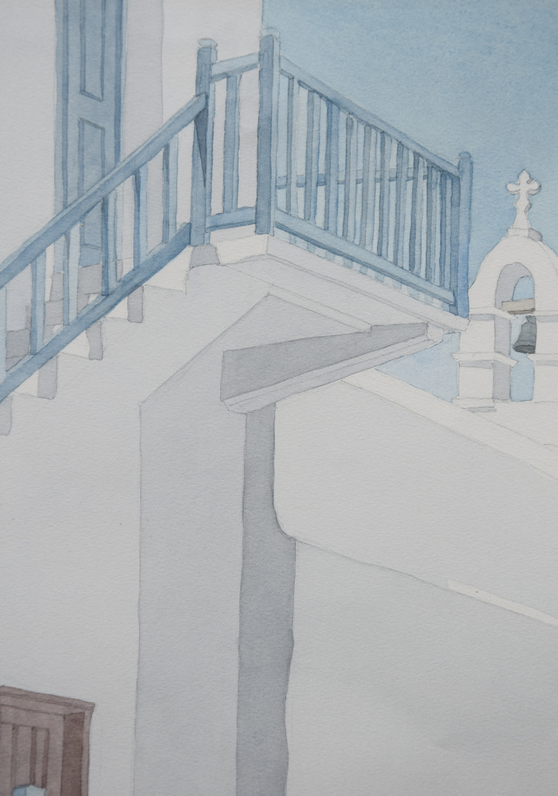 Im Vordergrund führt eine Treppe mit blauem Holzgeländer nach oben und führt damit den Blick zum blauen Himmel vor dem sich ein markanter Glockenturm abbildet.