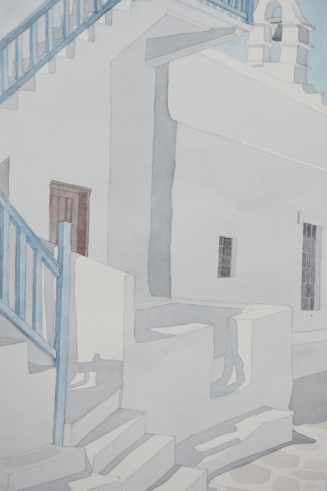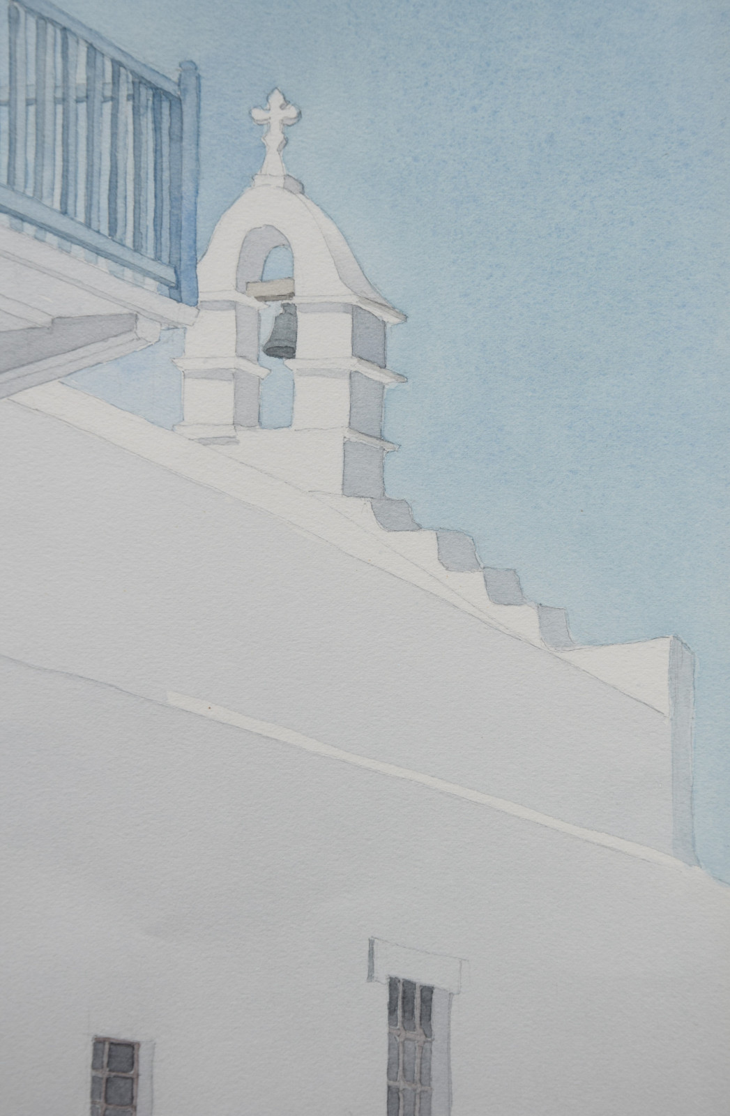 ohne Titel [Ansicht aus einer mediterranen Gemeinde, im Hintergrund ein markanter Glockenturm; wohl ein Ort auf den Kykladen]