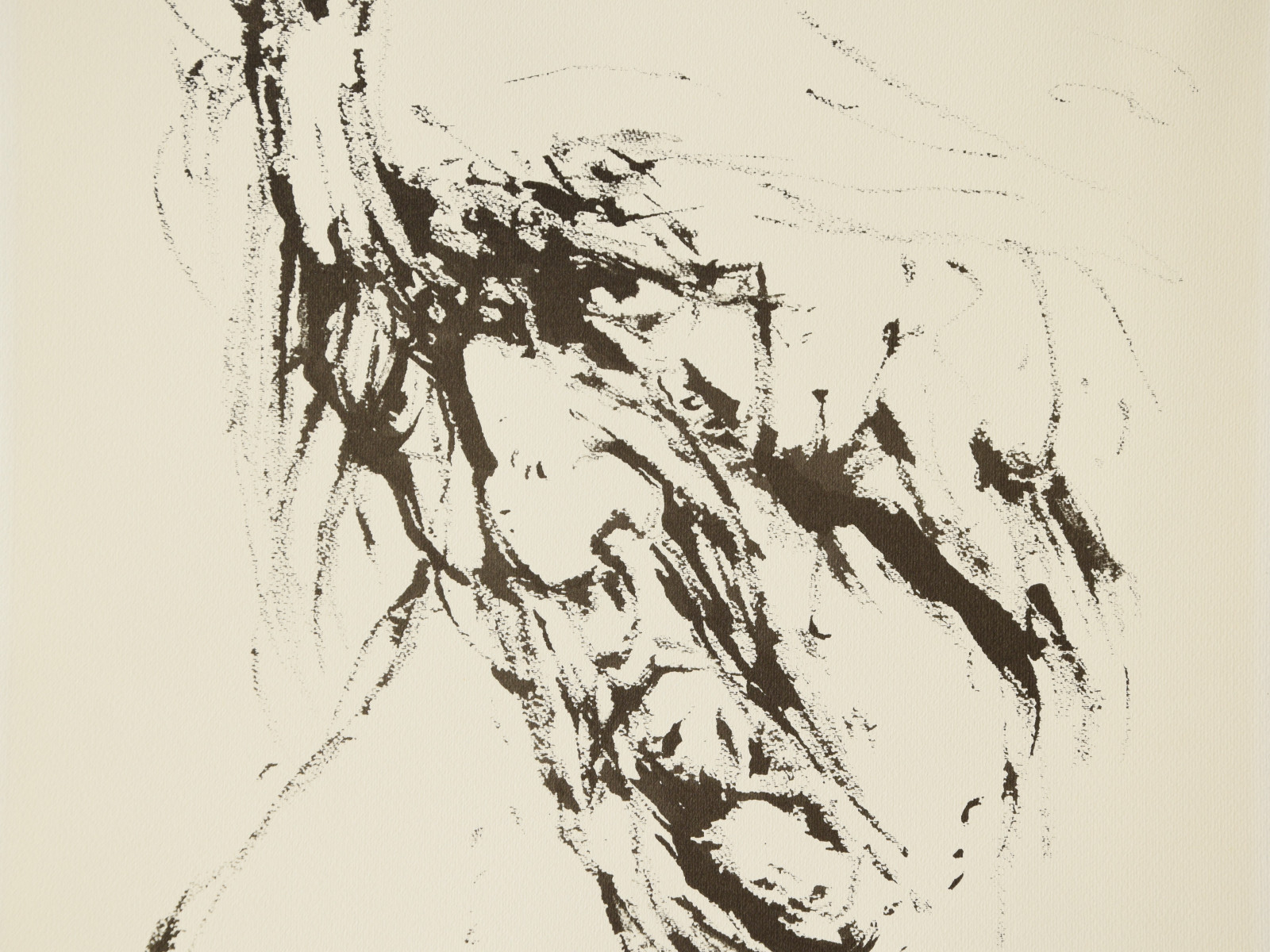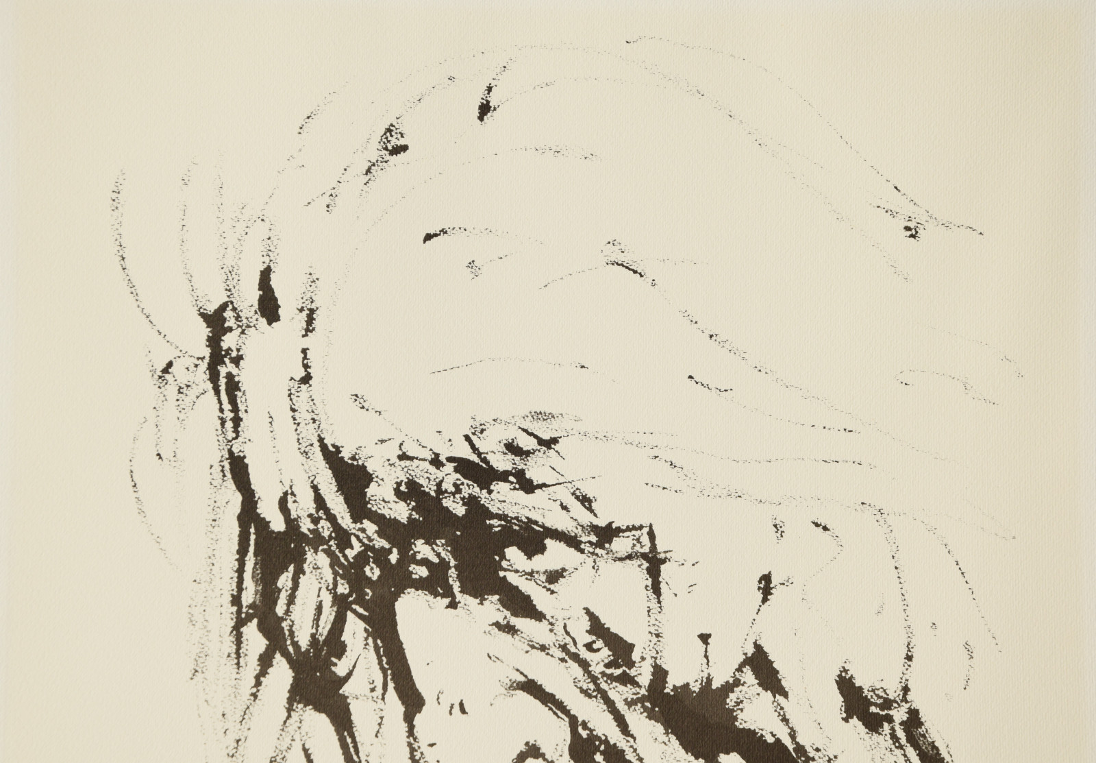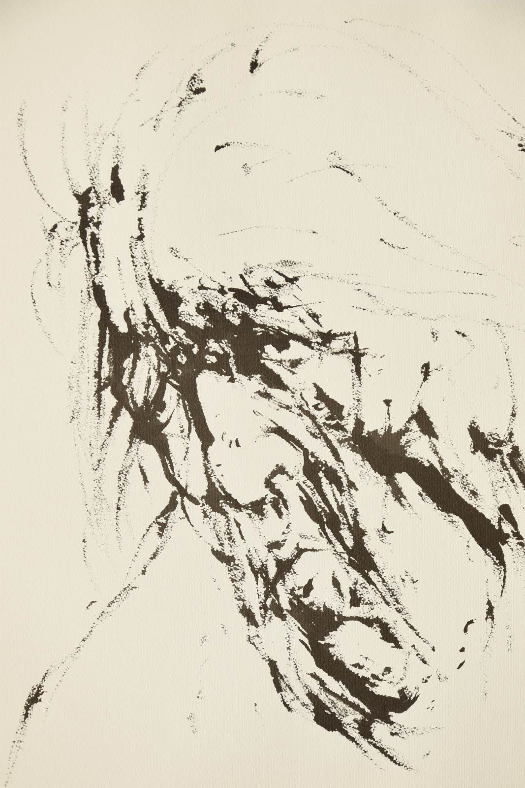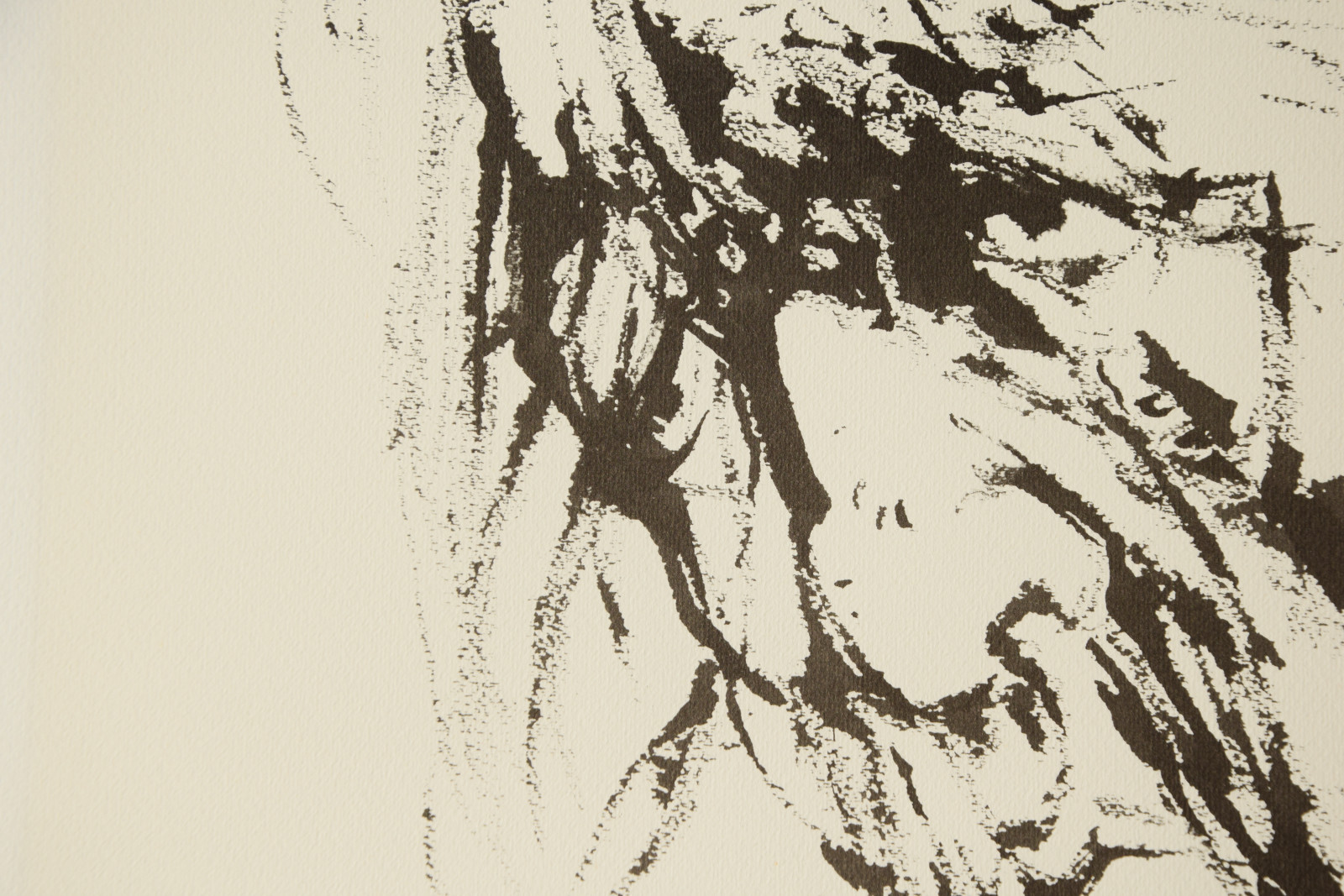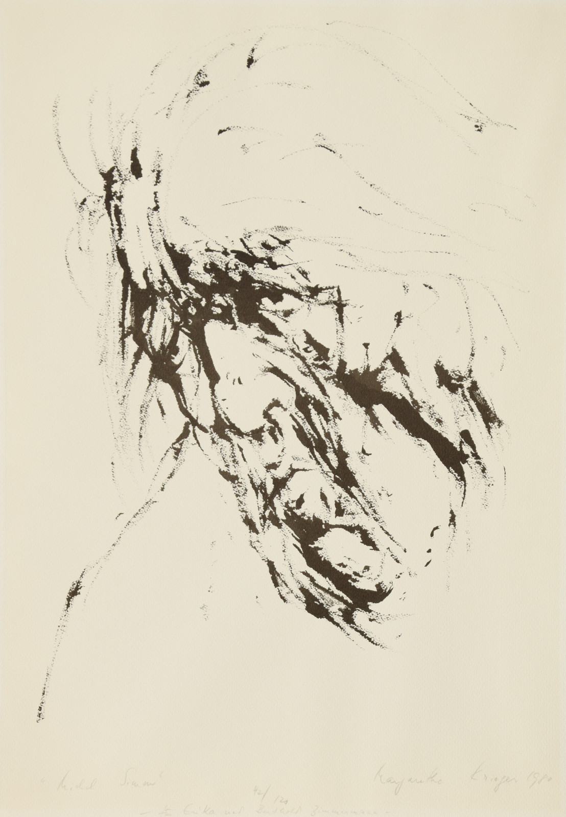 In der hier vorliegenden Lithografie hat Krieger den Abstraktionsgrad merklich erhöht. Die äußeren Bereiche sind eher zart und sehr reduziert ausgeführt und führen in ihren lockeren Linien zur Bildmitte, dem Gesicht, hin. Dieses ist signifikant dunkel, mit harten, kantigen Flächen dargstellt. Der Blick aus dem leicht geneigten Kopf geht müde, traurig nach links. Es wirkt alles schwer, alles voller Trübsinn und Melancholie. Ein hartes gelebtes Leben tritt er auf eine unnachahmliche Weise vor den Betrachter.