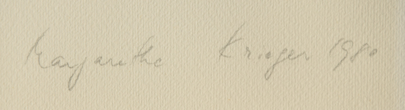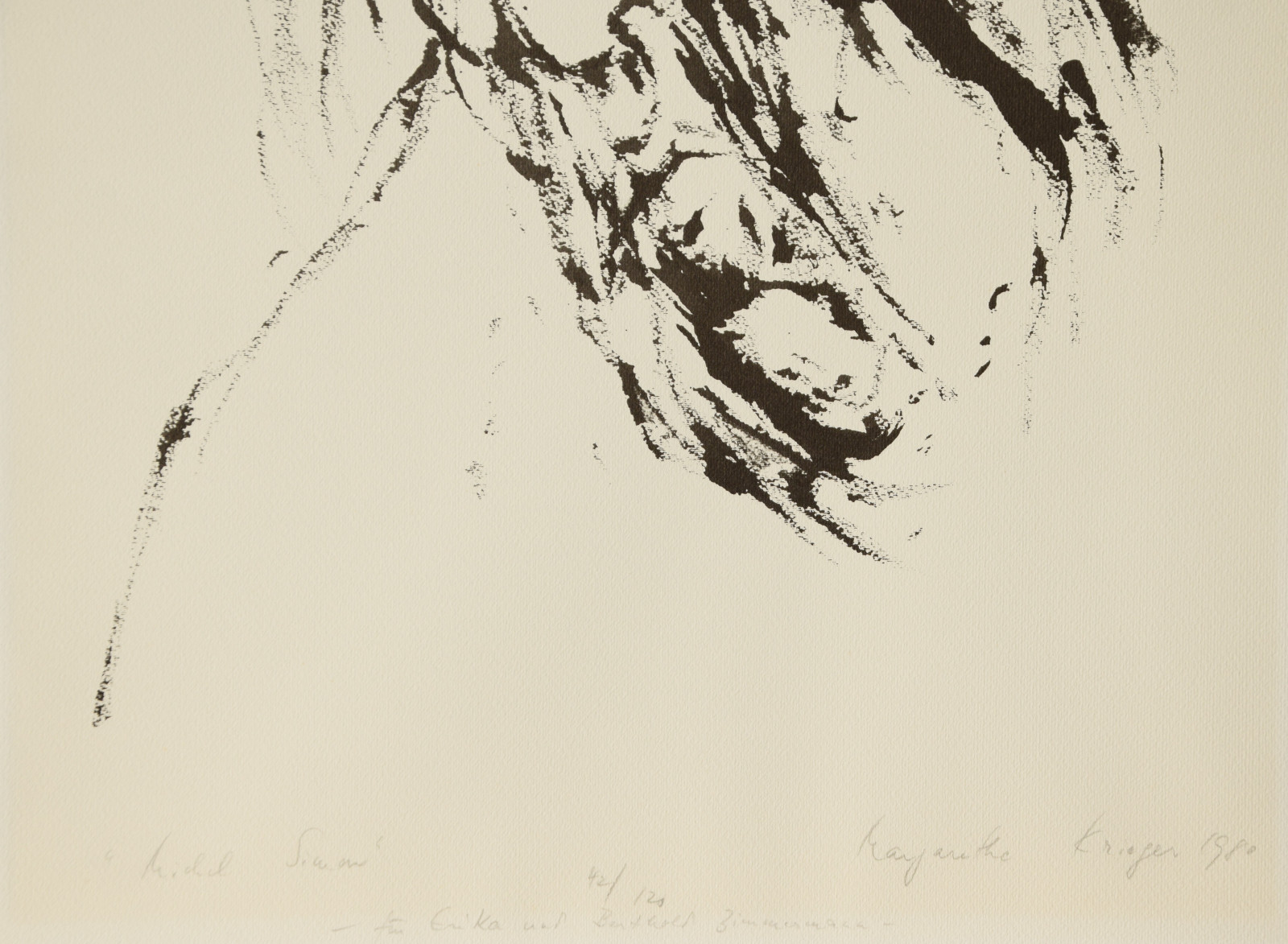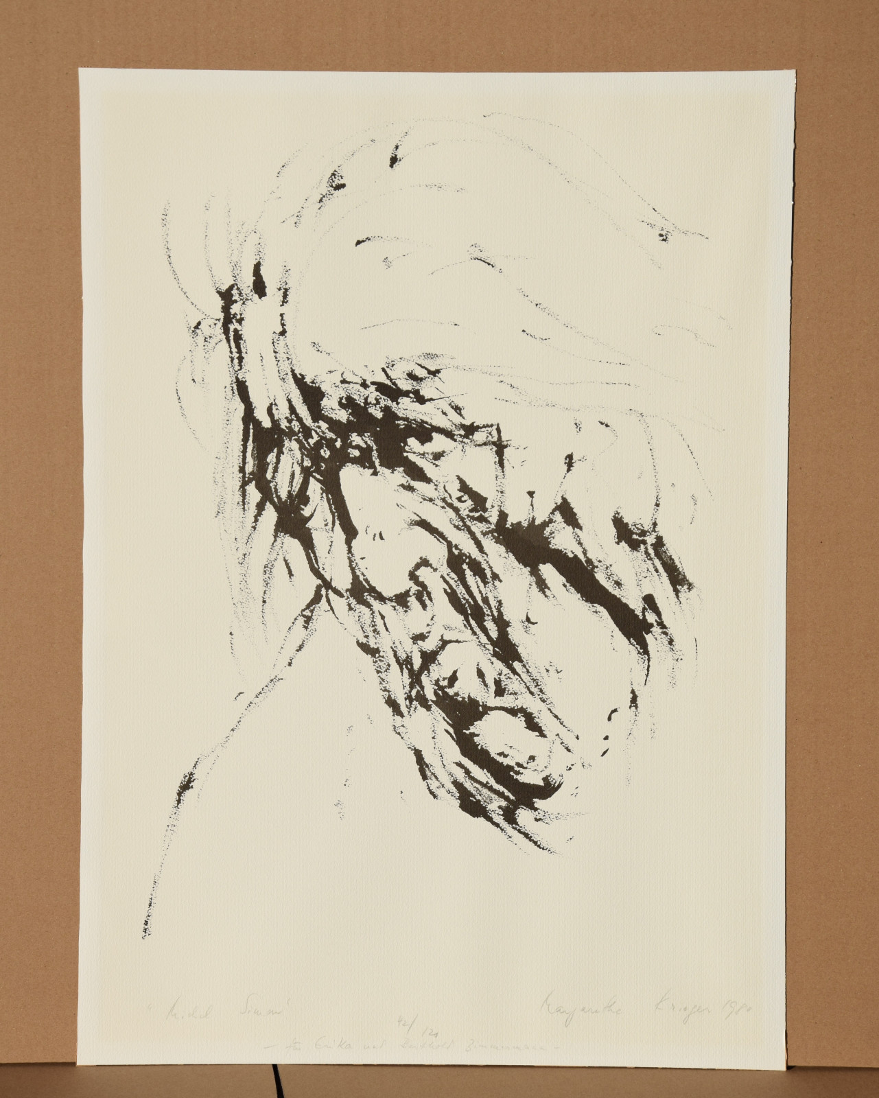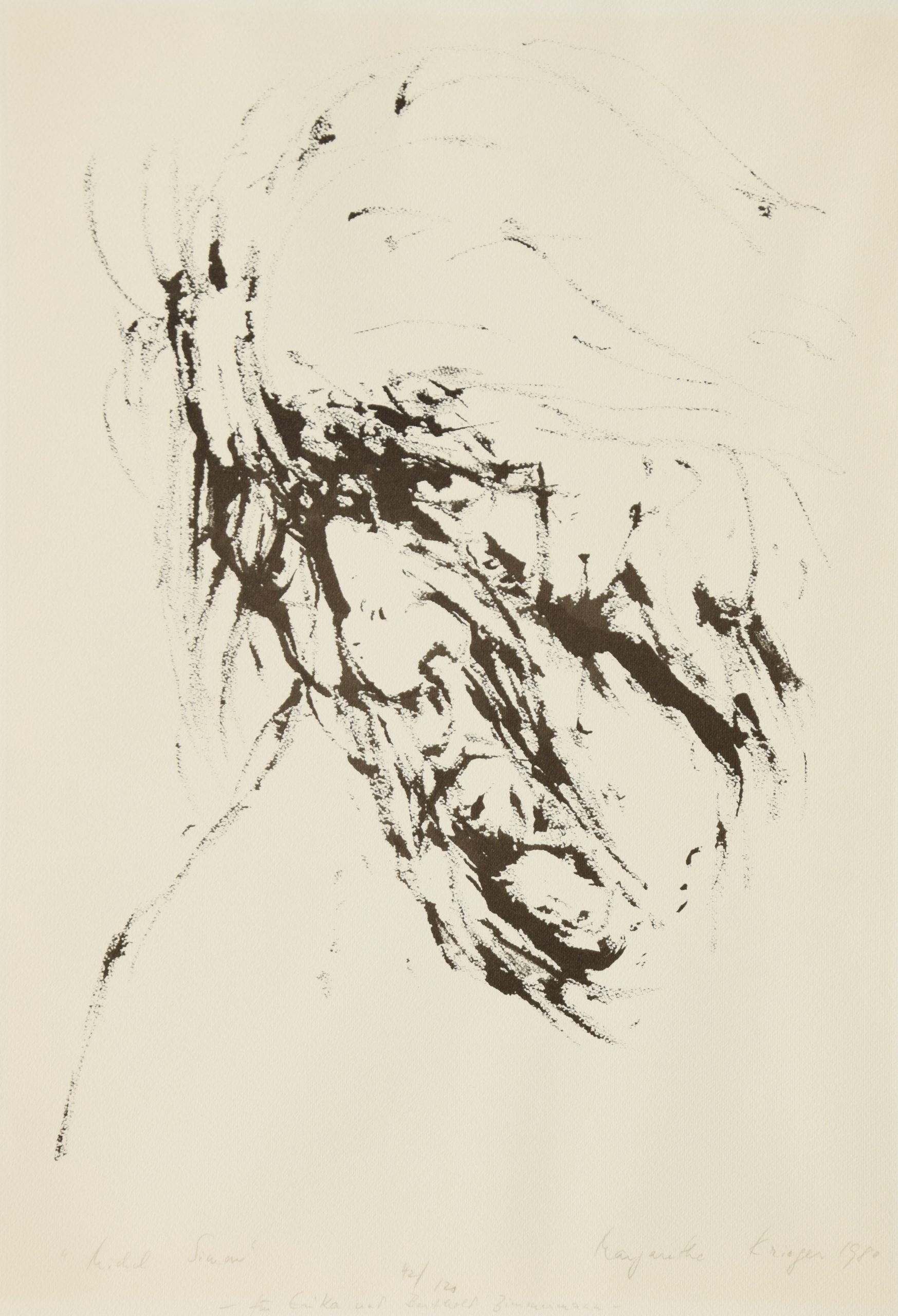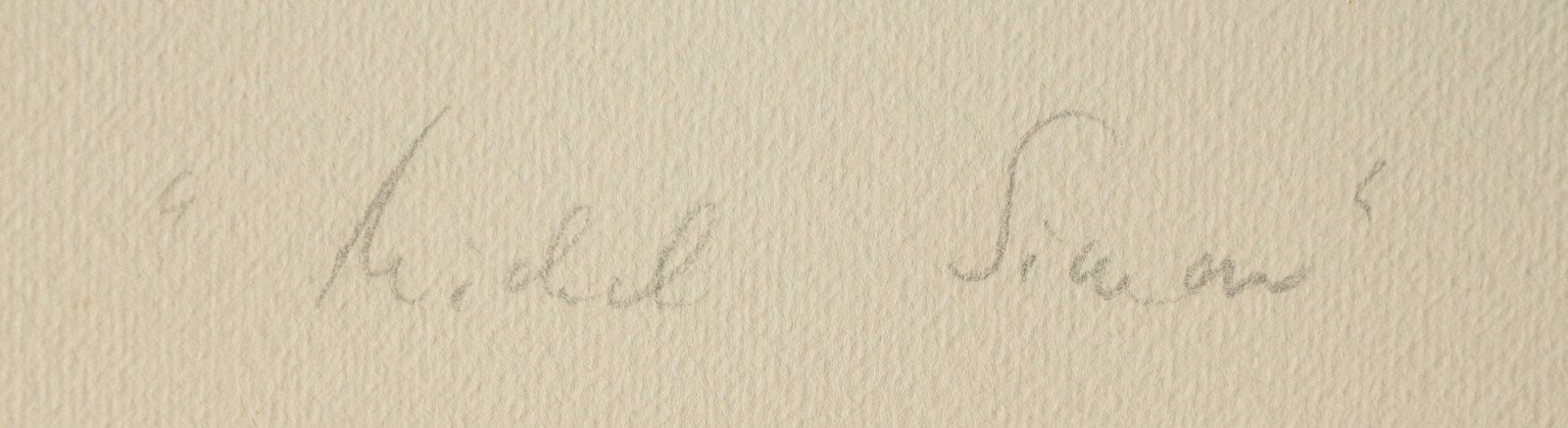 Die hier gezeigte Lithografie zeigt den schweizerischen Schauspieler Michel Simon (1895 Genf – 1975 Bry-sur-Marne). Es handelt sich bei diesem auf 1980 datierten Blatt demnach um eine posthum entstandene Arbeit, was im Schaffen Kriegers gerade bei Bildnissen Simons aber auch bei Bildnissen Oskar Werners zu sehen ist [1]. Margarethe Krieger kannte Simon seit 1965. Während eines Aufenthalts am Bodensee traf sie mit Simon zusammen, der sich damals in einem Sanatorium erholte. Das markante Gesicht, die Falten und Furchen faszinierten die Künstlerin und sie zeichnete ein Portrait – in der Folge entstand daraus eine ganze eigene Werkgruppe. Beachtenswerterweise waren es auch Bildnisses von Michel Simon mit denen Krieger auf Wettbewerben Preise erhielt, so u. a. den oben erwähnten Graphik-Preis des 84. Salon de l‘union des femmes peintres im Musée d’ Art Moderne 1968.