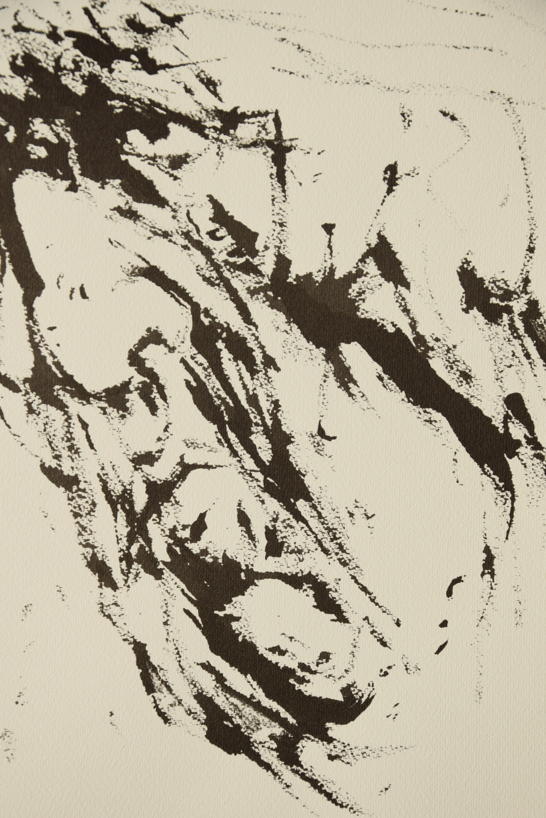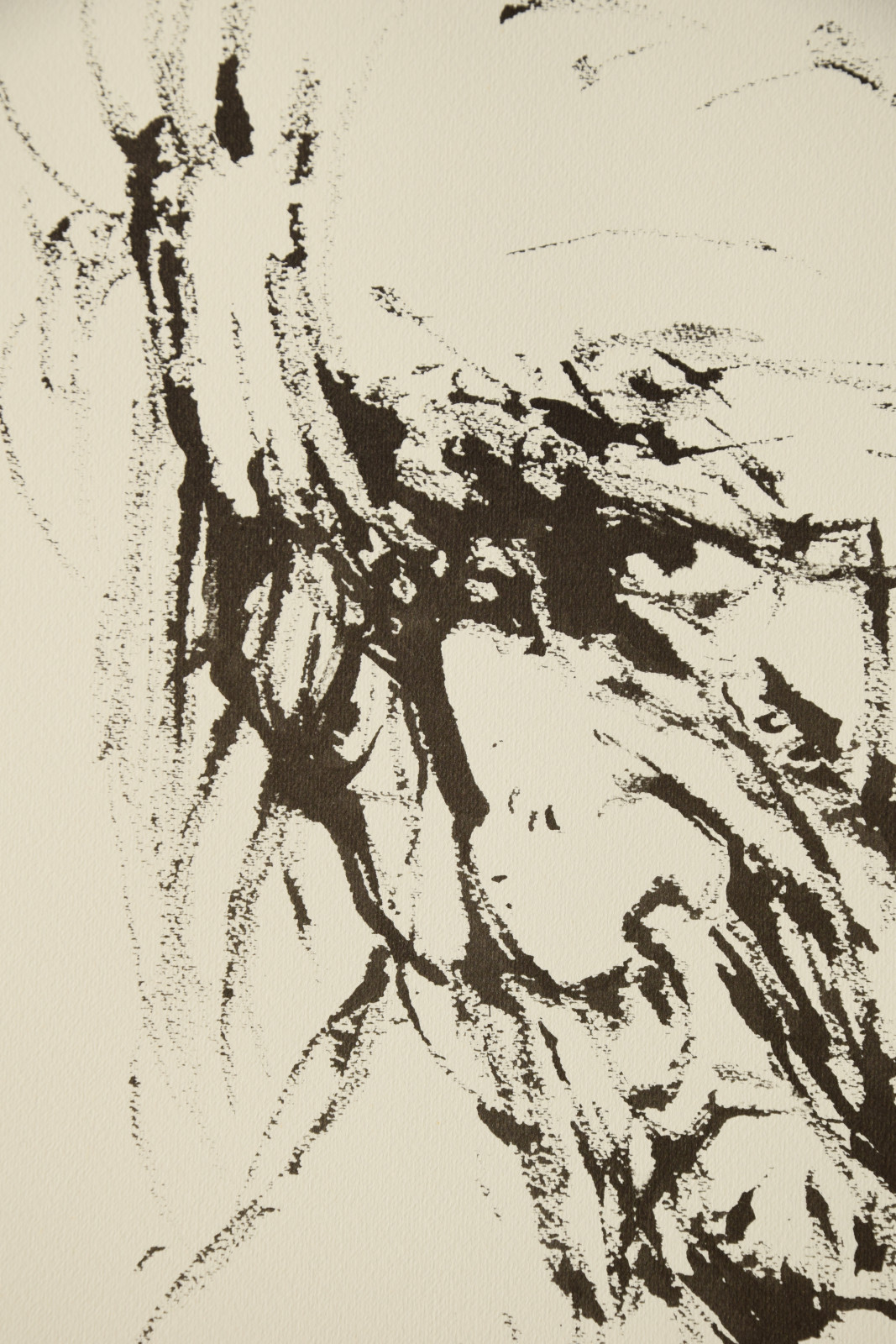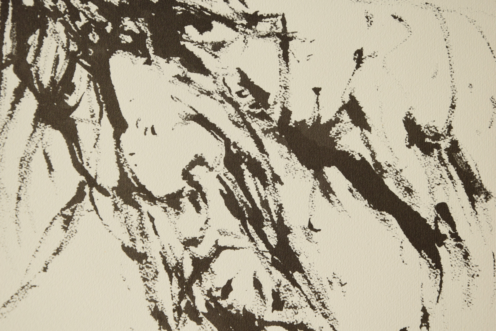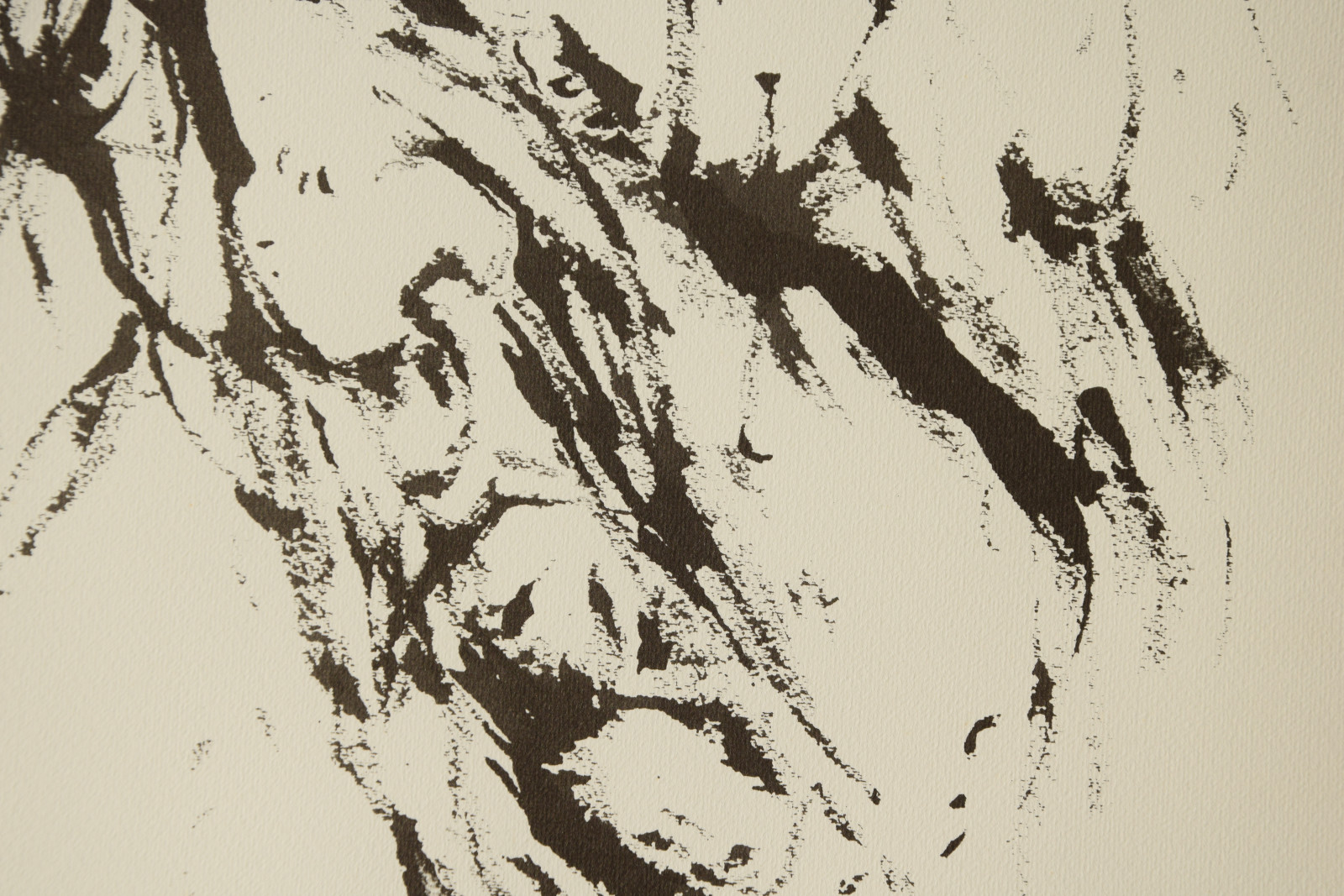 Die hier gezeigte Lithografie zeigt den schweizerischen Schauspieler Michel Simon (1895 Genf – 1975 Bry-sur-Marne). Es handelt sich bei diesem auf 1980 datierten Blatt demnach um eine posthum entstandene Arbeit, was im Schaffen Kriegers gerade bei Bildnissen Simons aber auch bei Bildnissen Oskar Werners zu sehen ist [1]. Margarethe Krieger kannte Simon seit 1965. Während eines Aufenthalts am Bodensee traf sie mit Simon zusammen, der sich damals in einem Sanatorium erholte. Das markante Gesicht, die Falten und Furchen faszinierten die Künstlerin und sie zeichnete ein Portrait – in der Folge entstand daraus eine ganze eigene Werkgruppe. Beachtenswerterweise waren es auch Bildnisses von Michel Simon mit denen Krieger auf Wettbewerben Preise erhielt, so u. a. den oben erwähnten Graphik-Preis des 84. Salon de l‘union des femmes peintres im Musée d’ Art Moderne 1968.