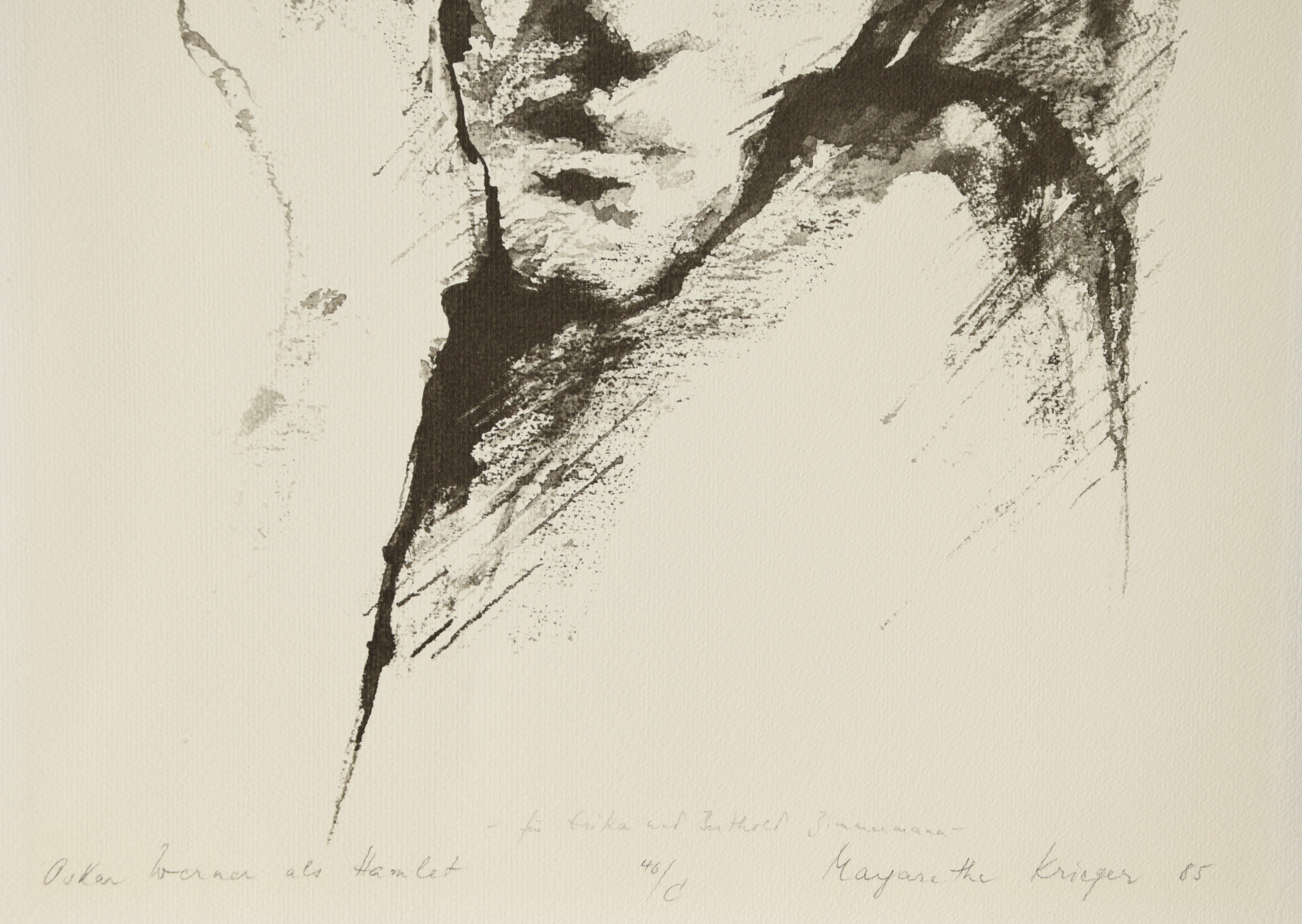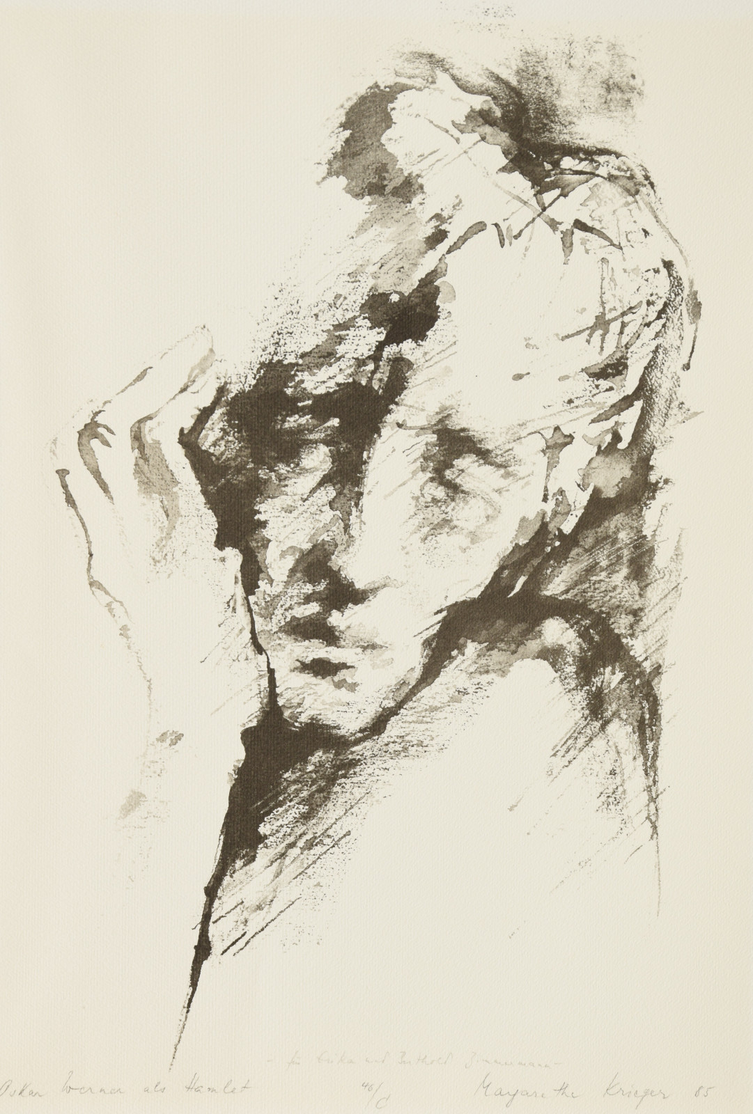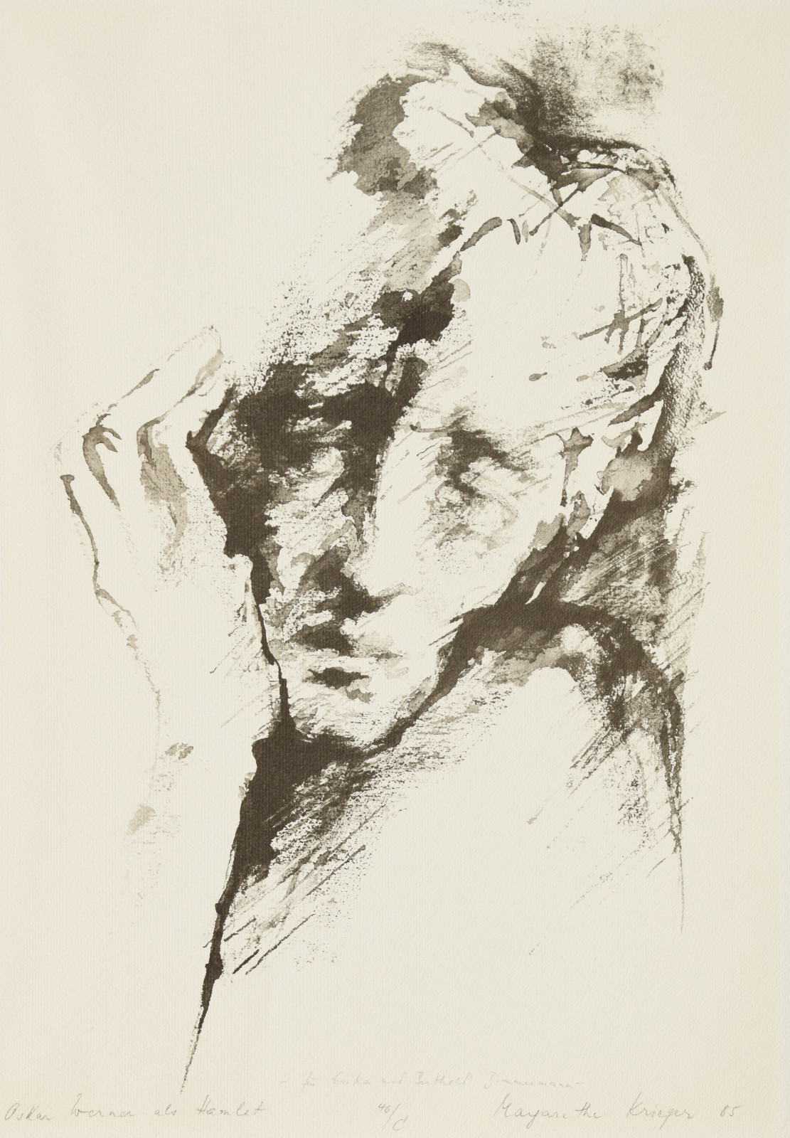 Die hier gezeigte Lithografie zeigt Oskar Werner in einer seiner größten Rolle: als Hamlet. Das Bildnis zeigt sich in einer Nahaufnahme dem Betrachter, dadurch wie auch durch die schnelle, spontan erscheinende Pinselführung erscheint das Werk anfangs beinahe wie eine Abstraktion. Schnell und impulsiv hat Krieger die Farbe gesetzt, was an Werke des Informel denken lässt. Doch aus der Mitte heraus bildet sich ein Gesicht, mit geschlossenen Augen, aufgestützt auf die rechte Hand, nachdenklich, traurig und müde. In erstaunlichen Abstufungen sind Details und Stimmungen dieses Gesichts eingefangen, wodurch die Künstlerin eben nicht nur Oskar Werner, sondern auch den Schmerz des Prinzen in herausragender druckgrafischer Kunst unnachahmlich einfängt.