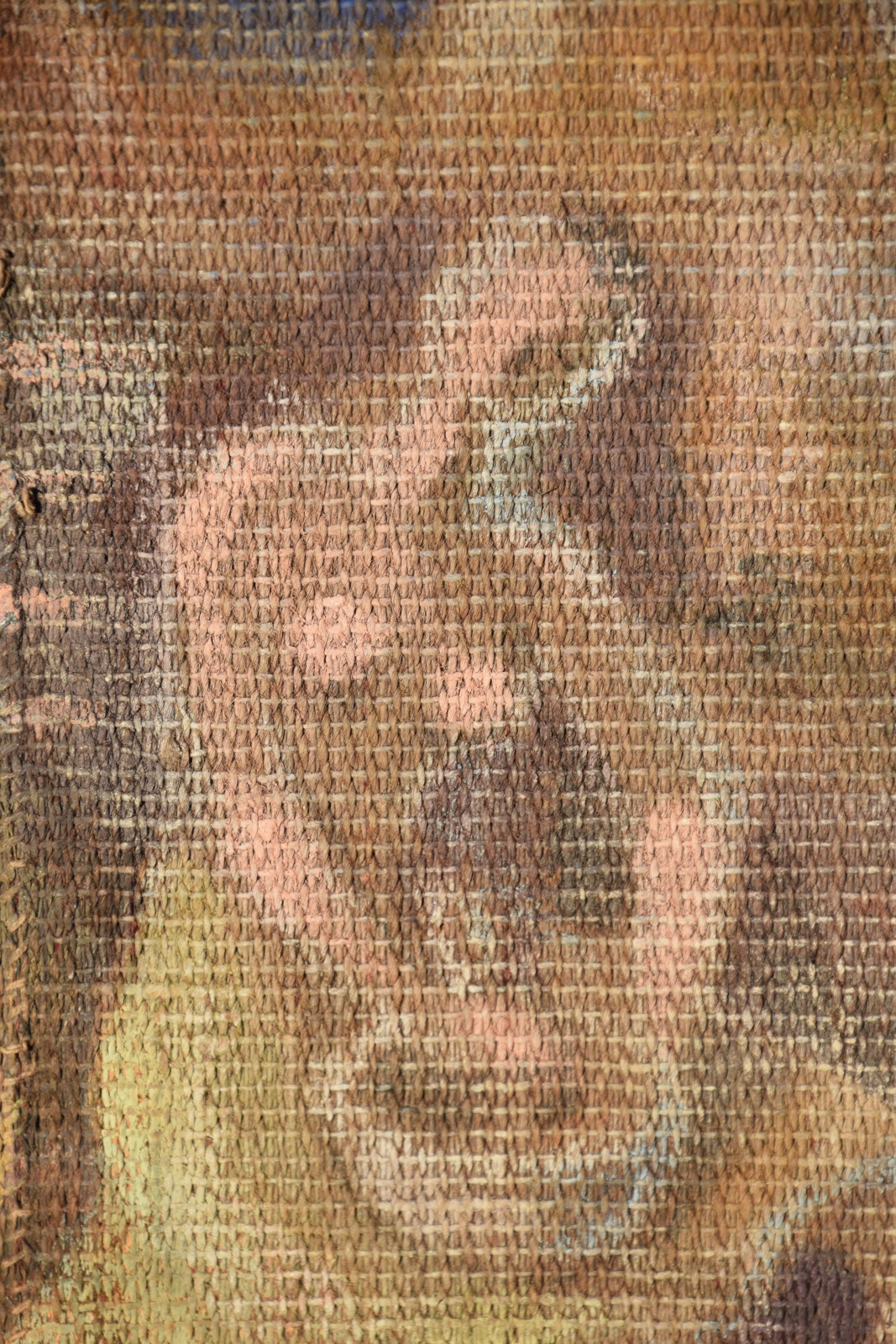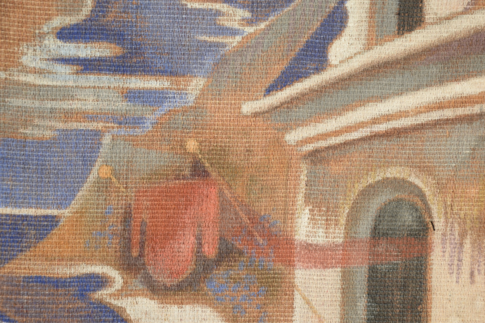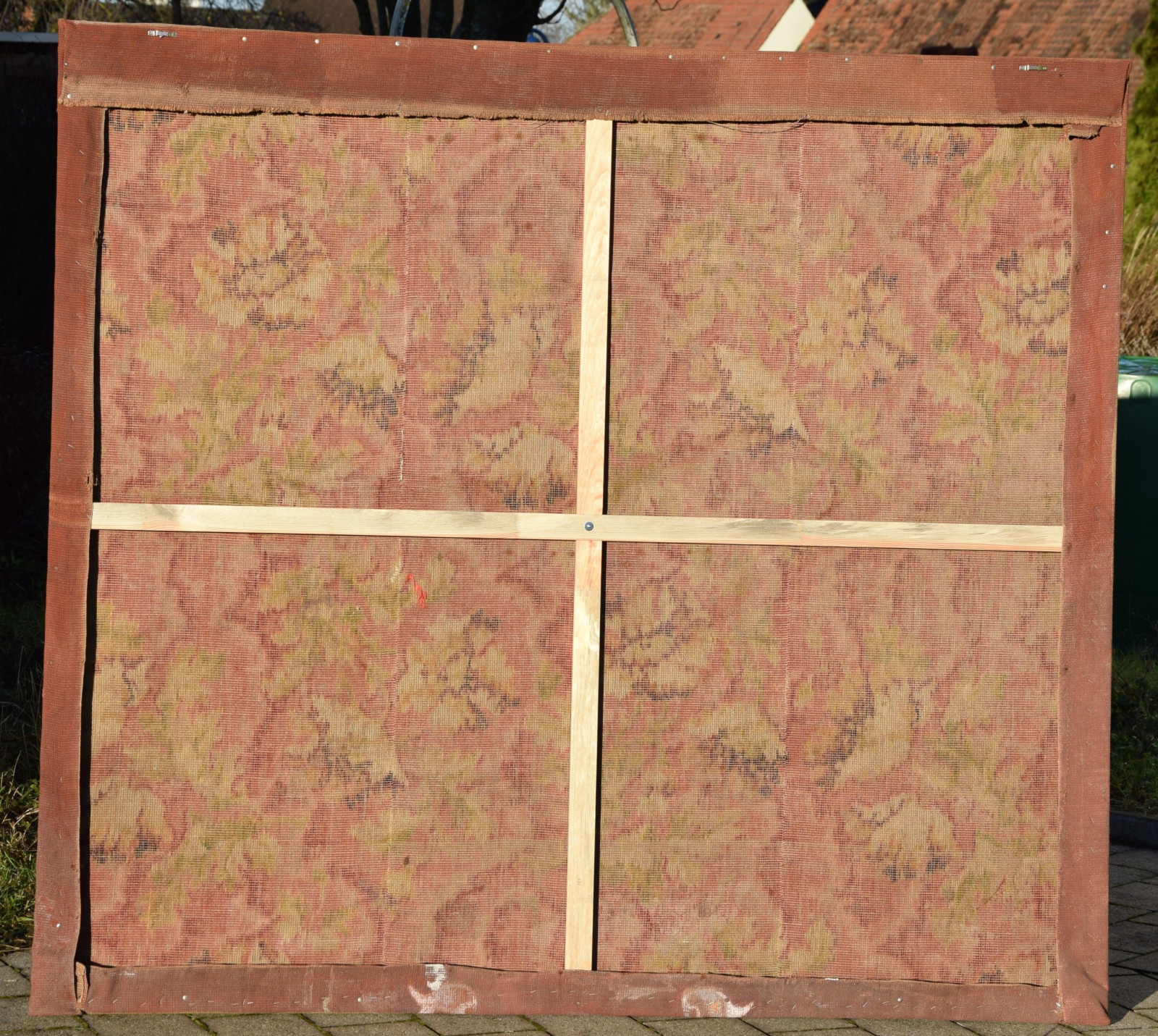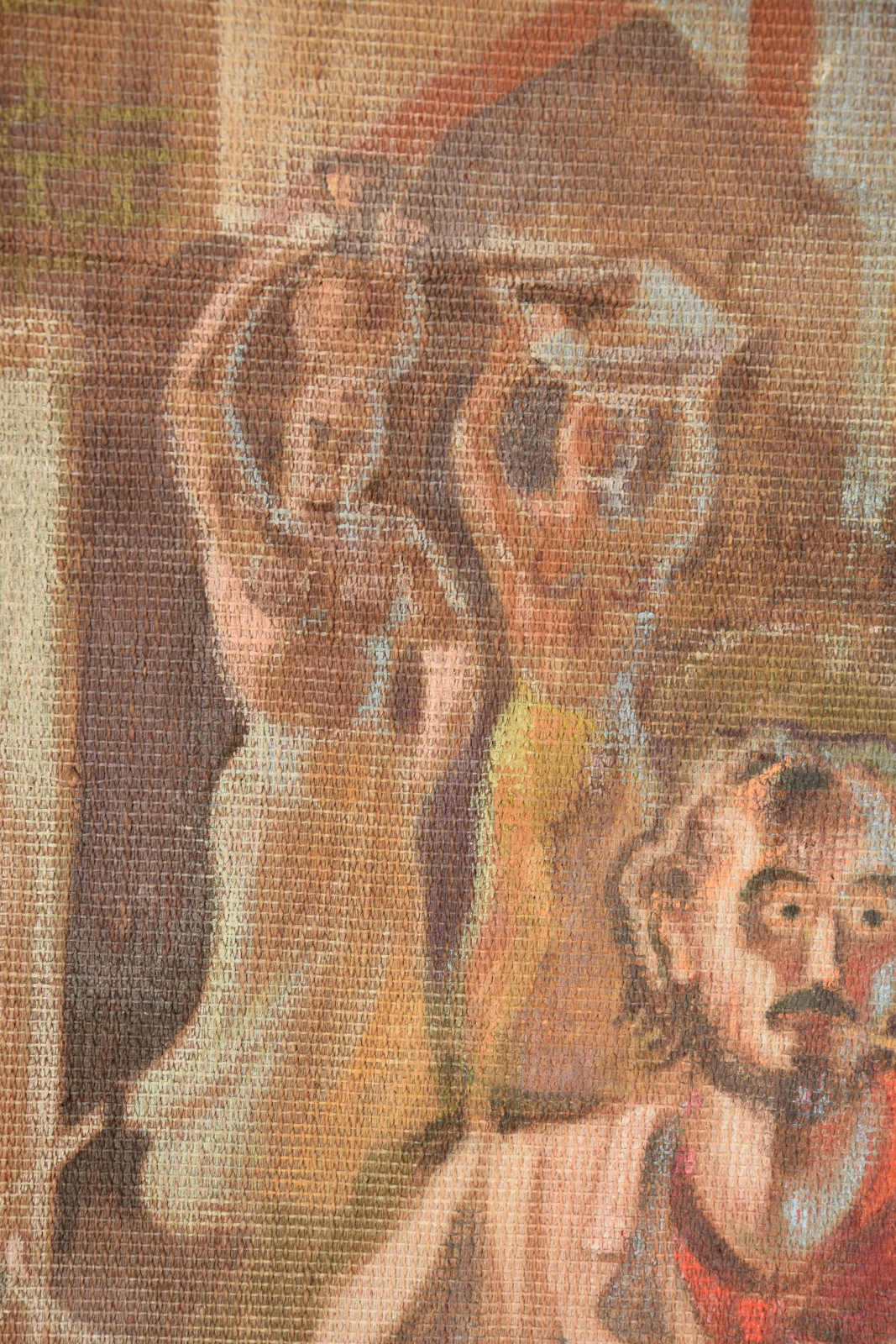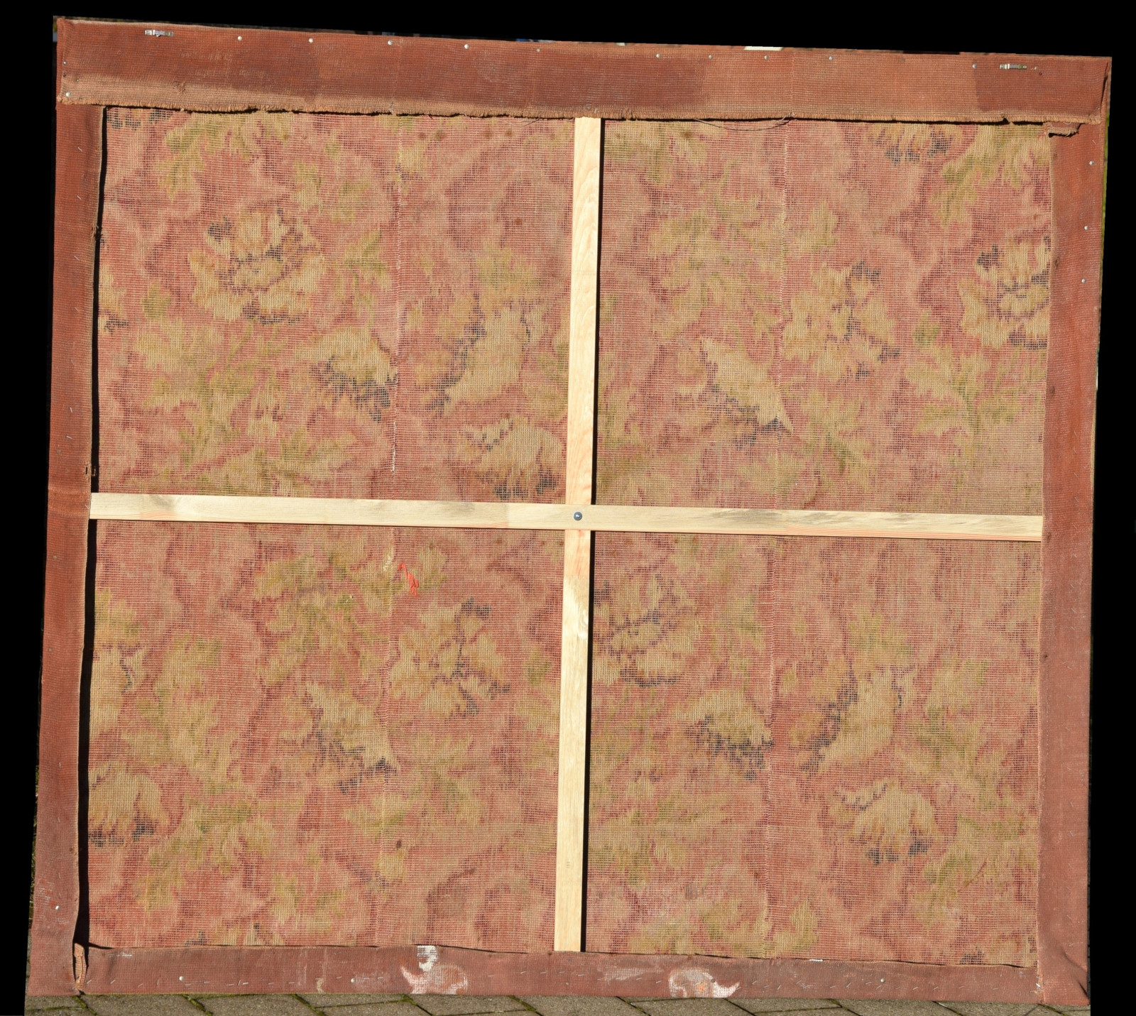 Temperamalerei auf grober Leinwand, auf Keilrahmen (verso oben links und oben rechts mit Aufhängevorrichtungen)