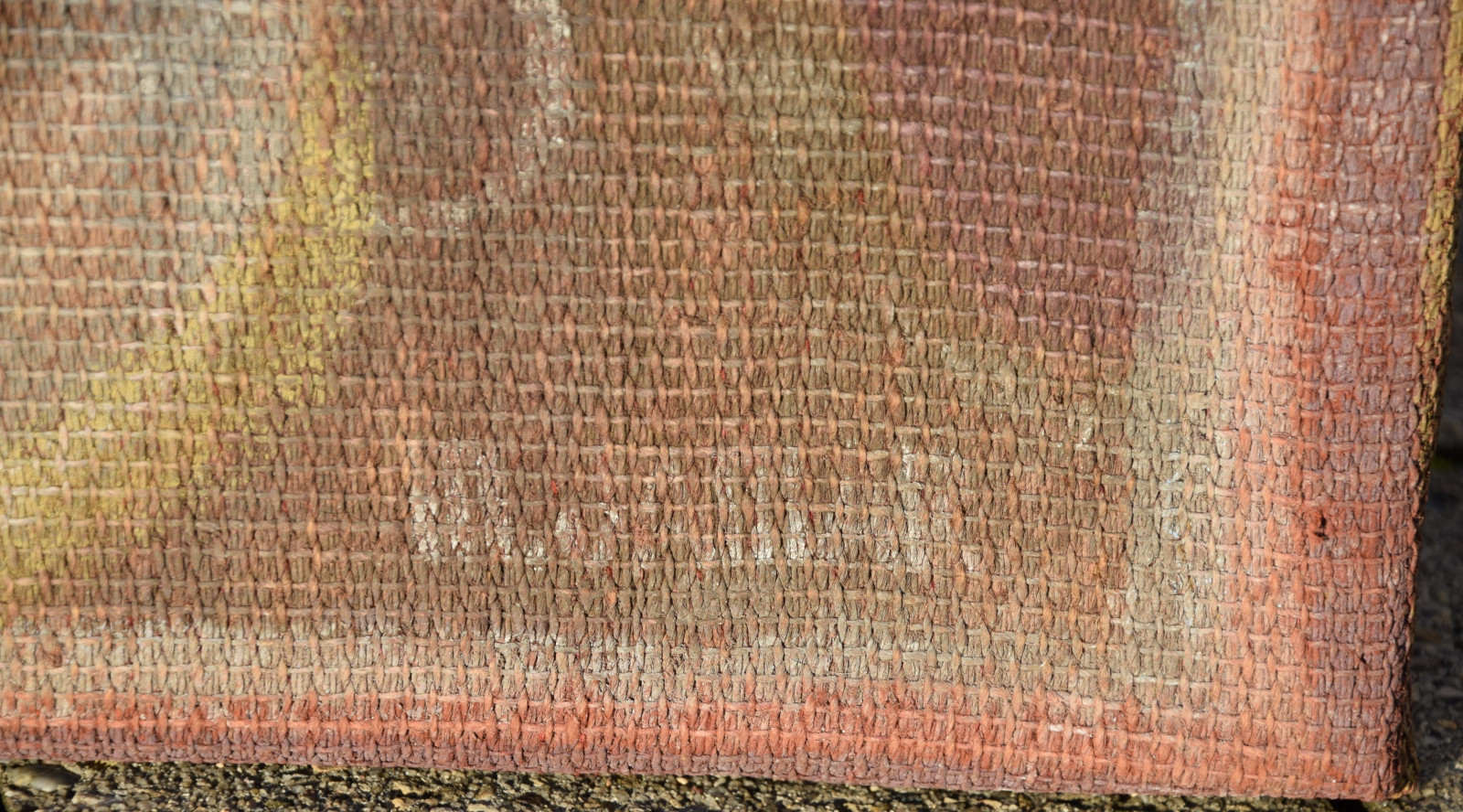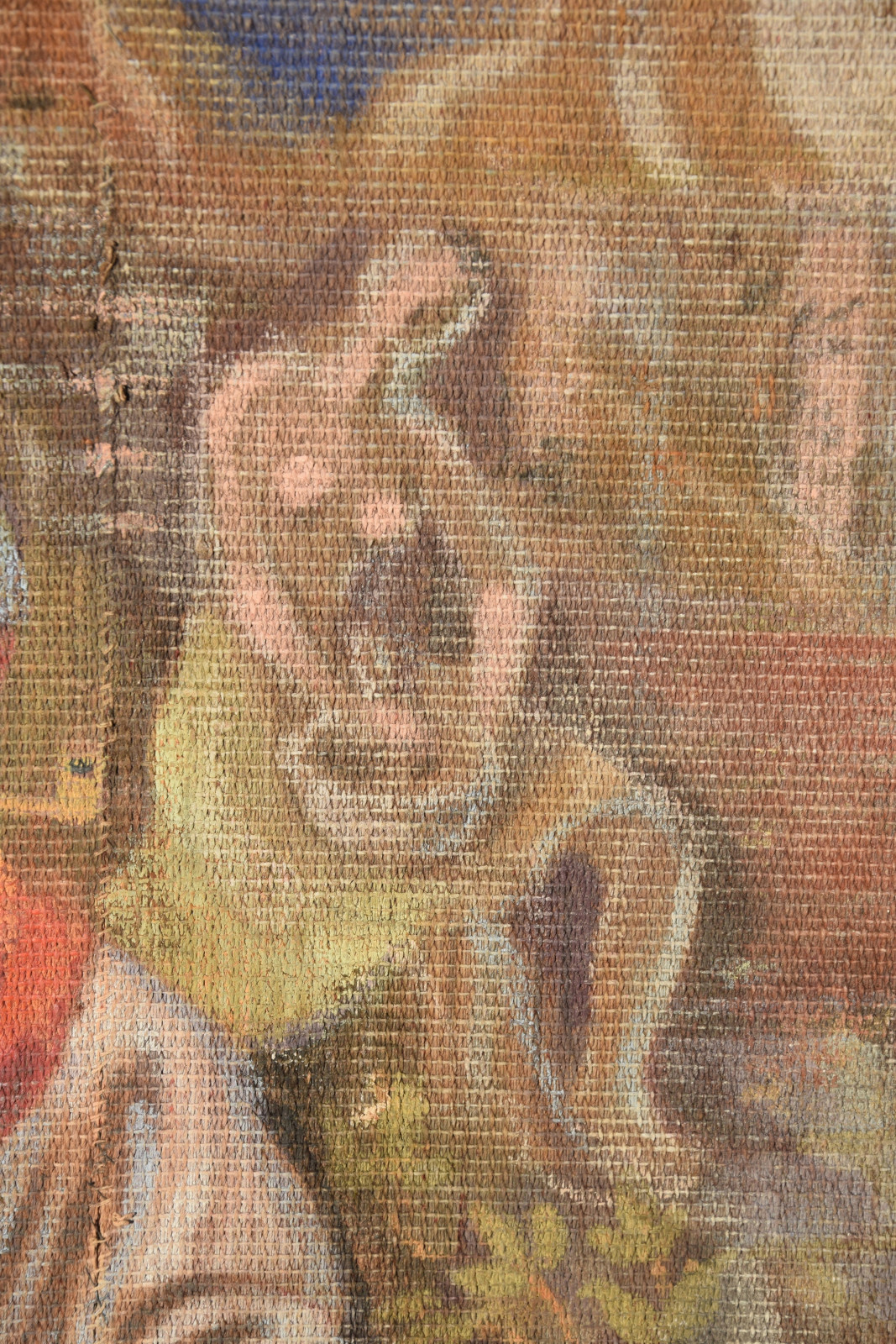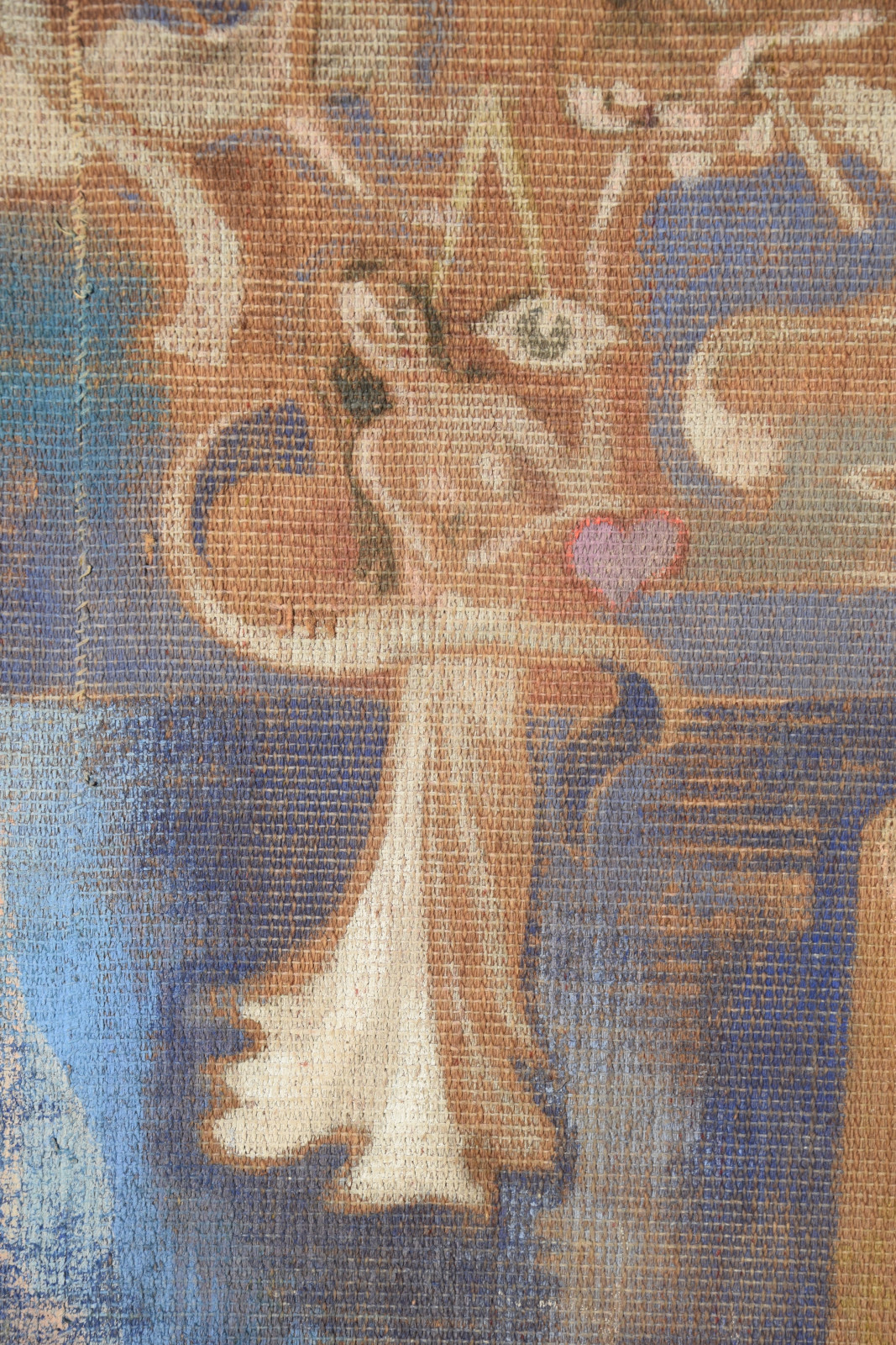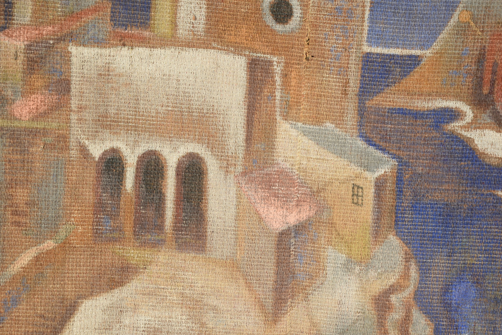 Temperamalerei auf grober Leinwand, auf Keilrahmen (verso oben links und oben rechts mit Aufhängevorrichtungen)