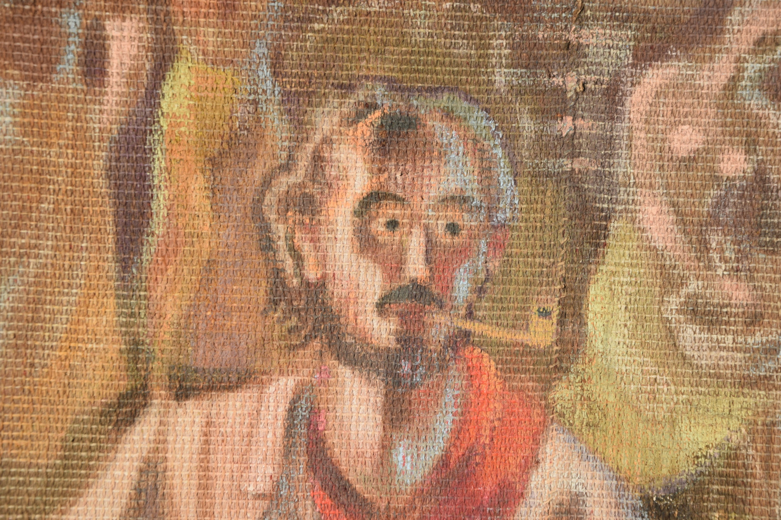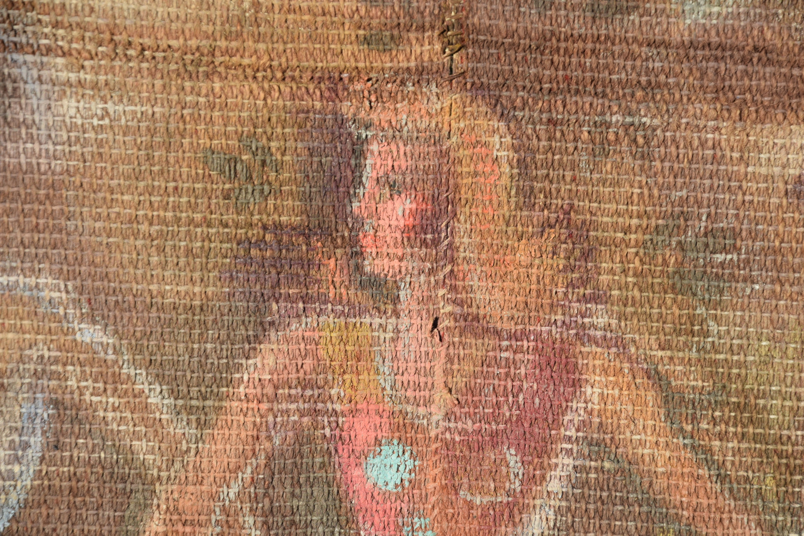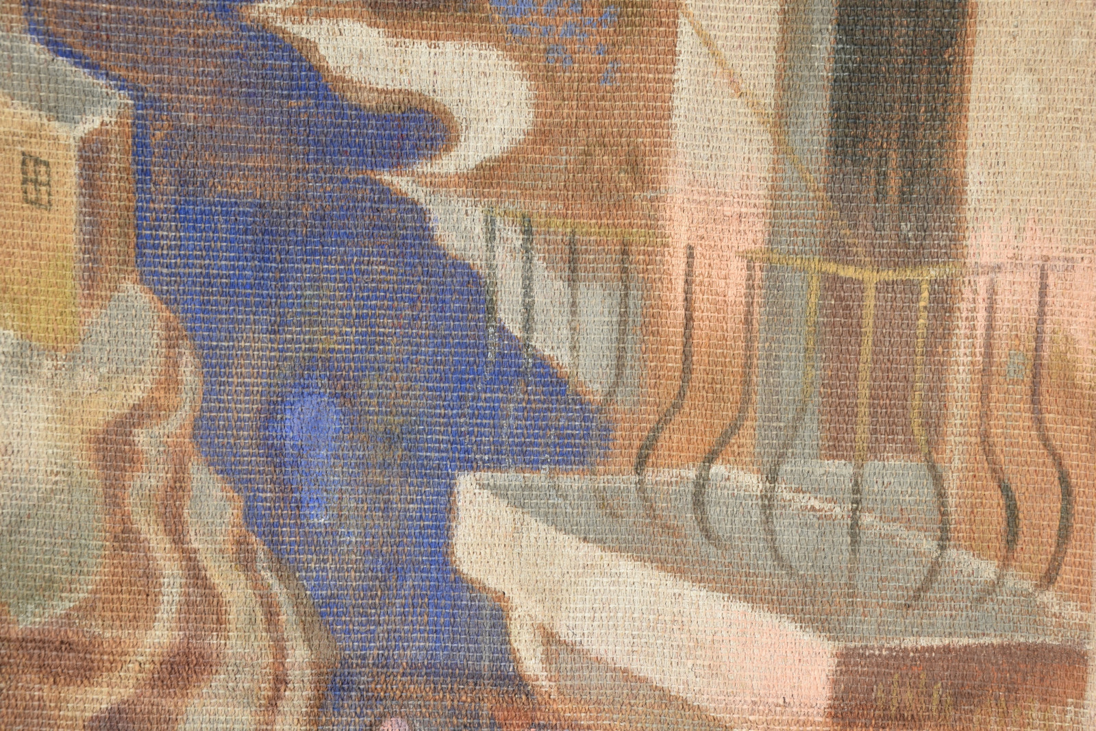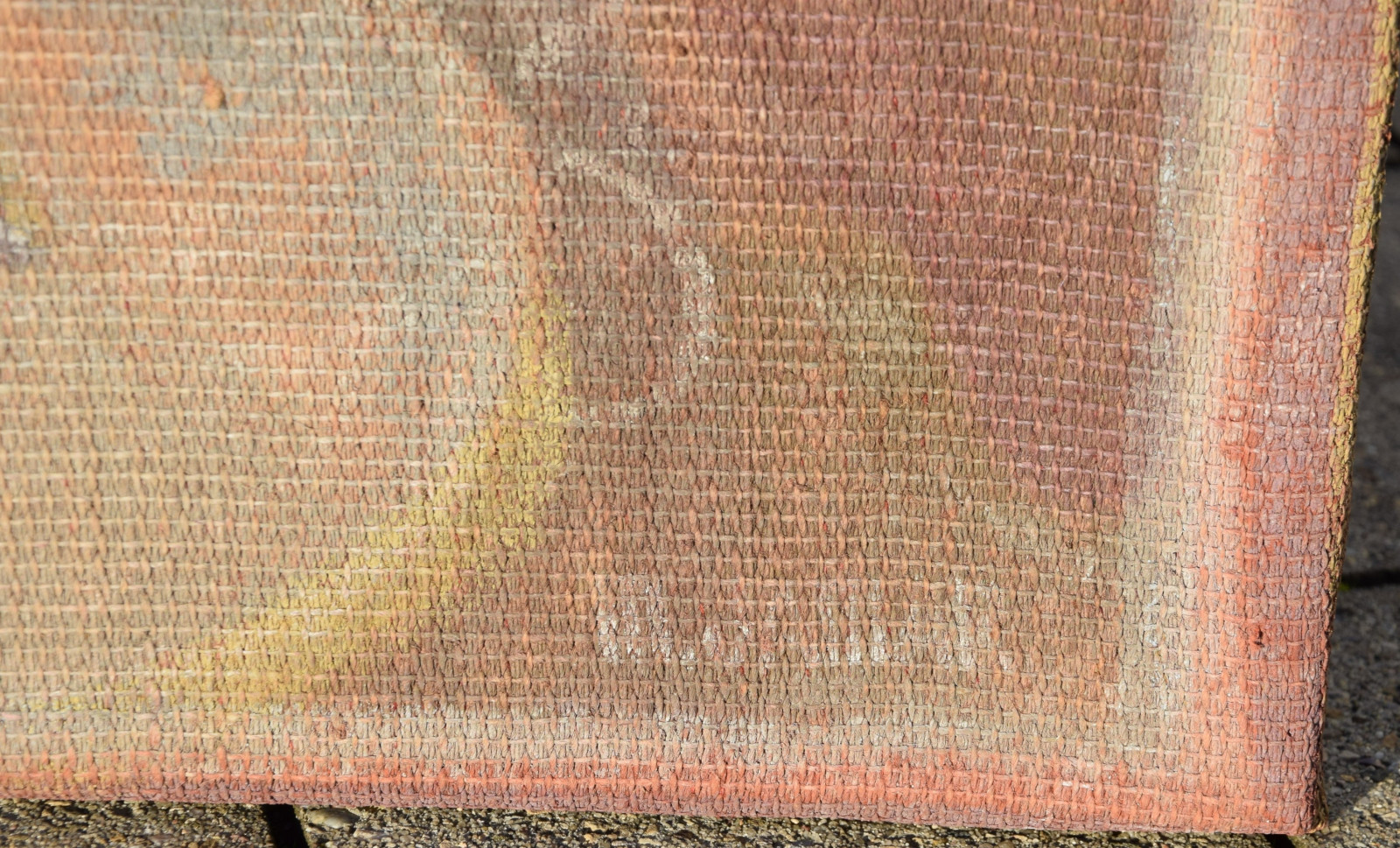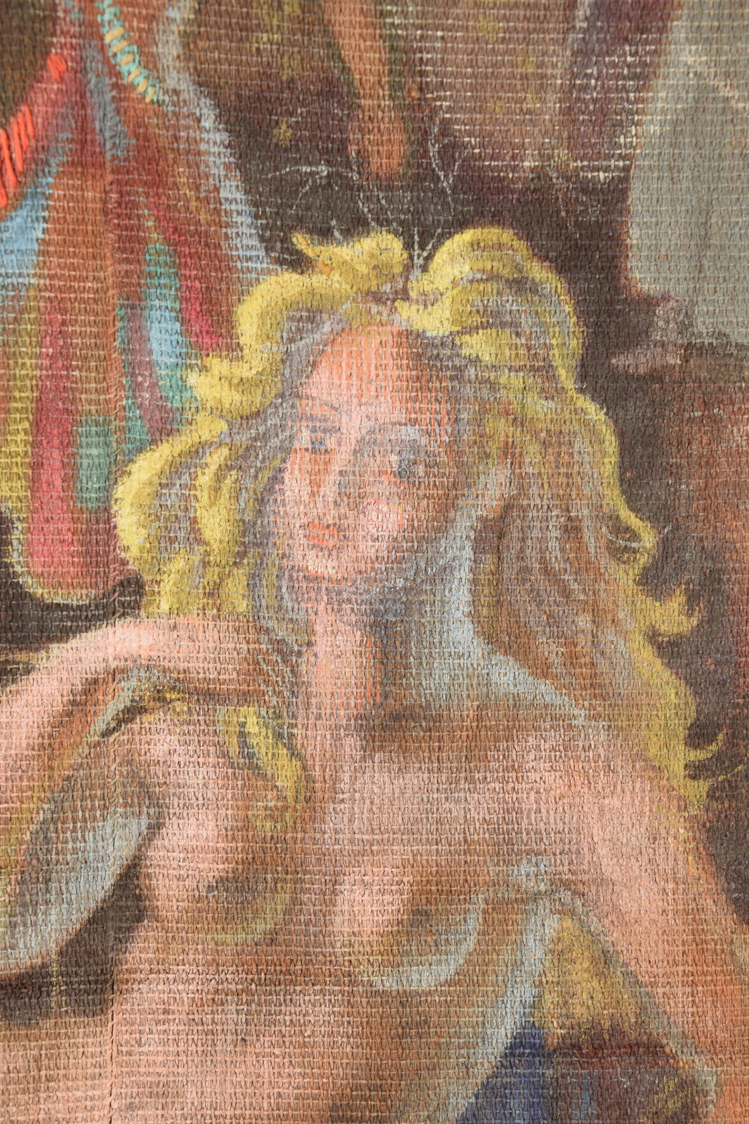 Temperamalerei auf grober Leinwand, auf Keilrahmen (verso oben links und oben rechts mit Aufhängevorrichtungen)