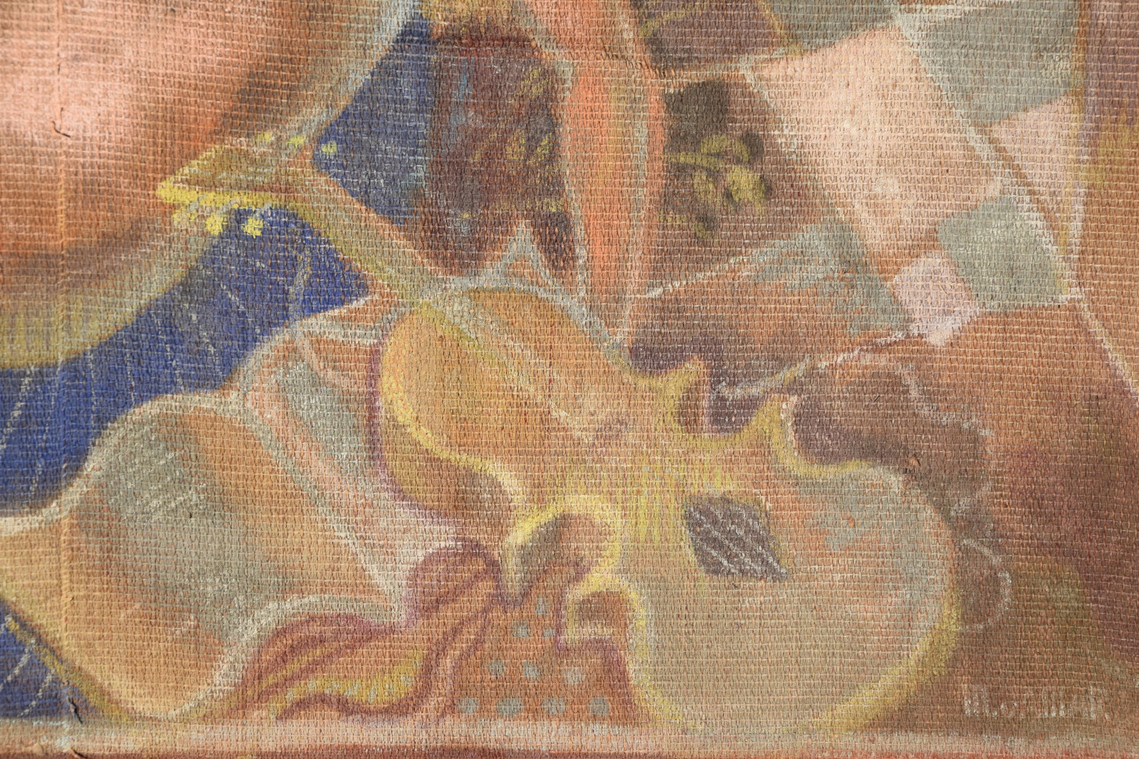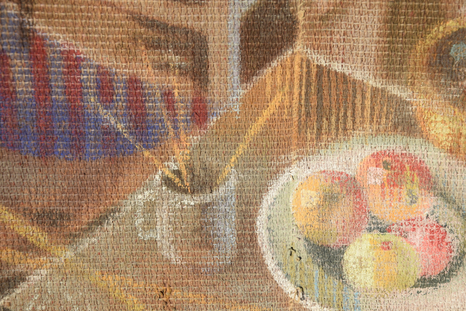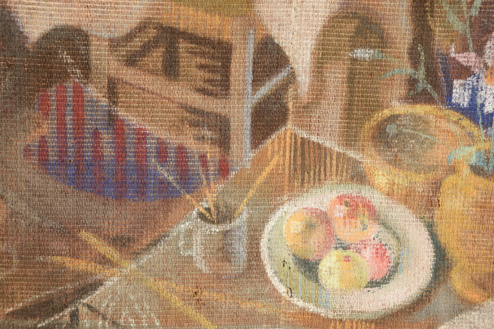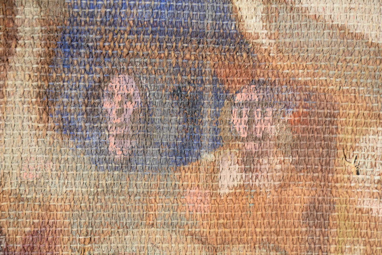 Temperamalerei auf grober Leinwand, auf Keilrahmen (verso oben links und oben rechts mit Aufhängevorrichtungen)