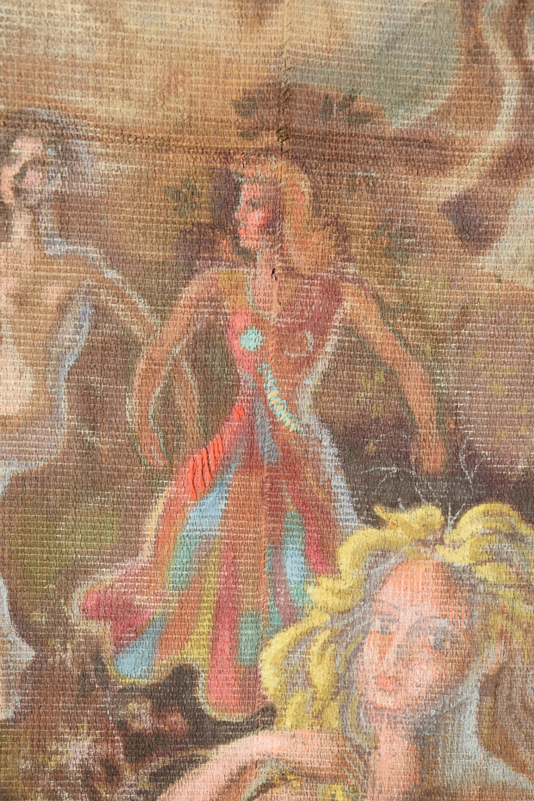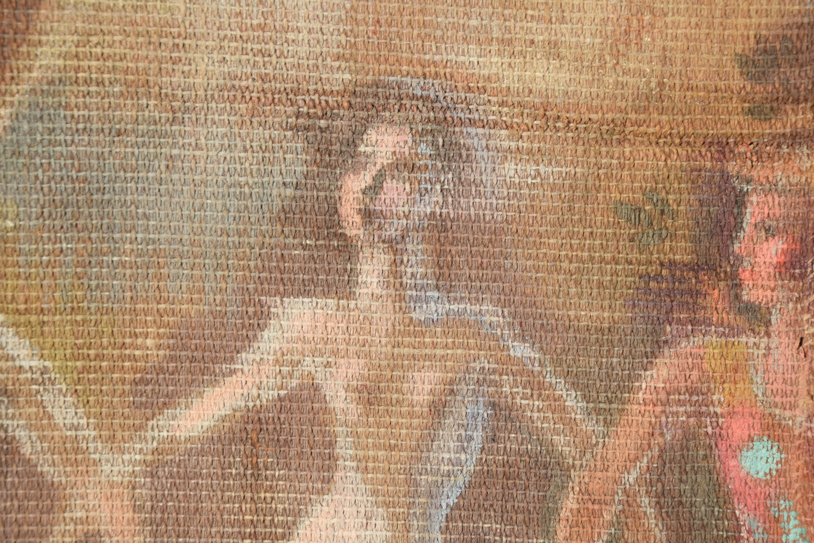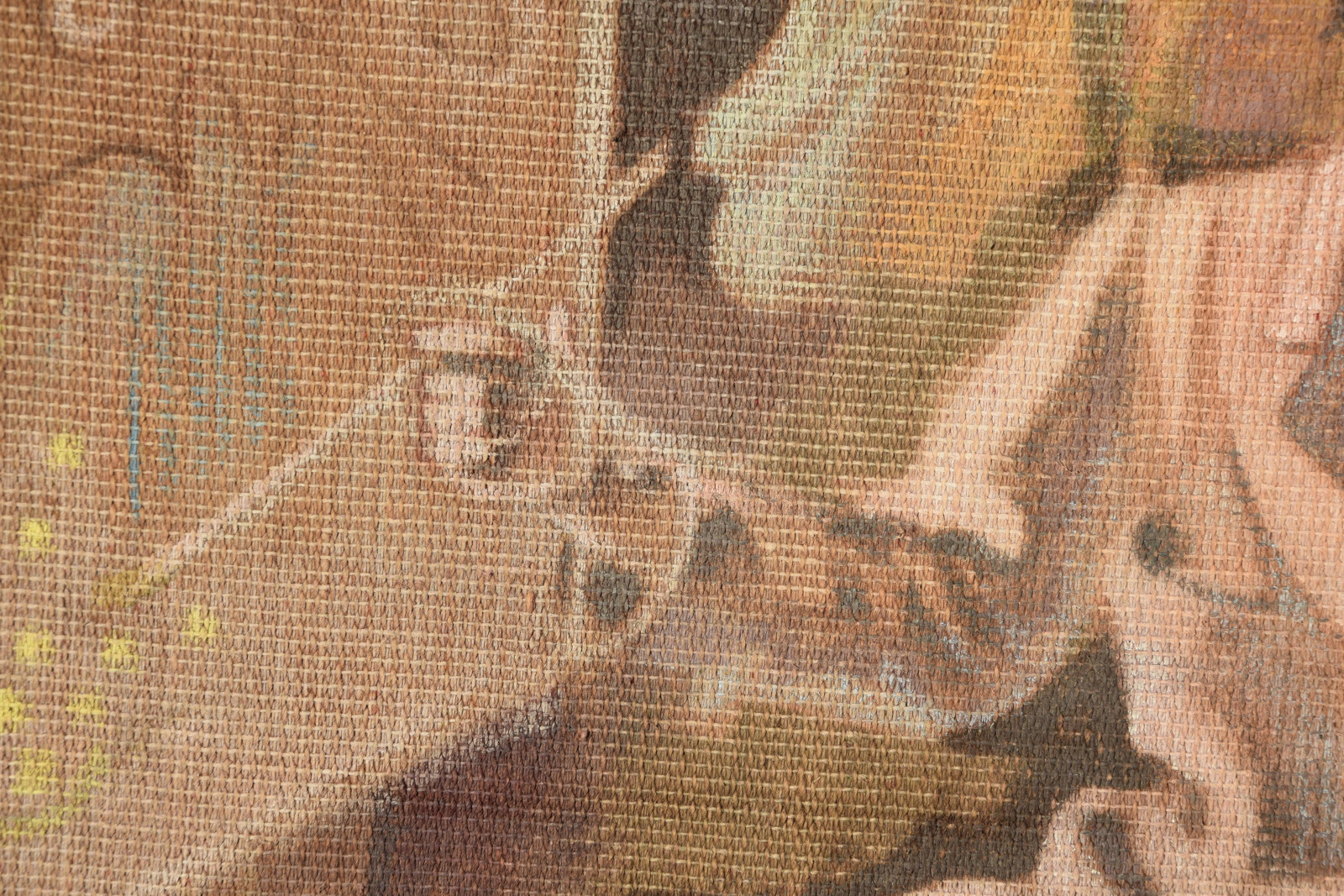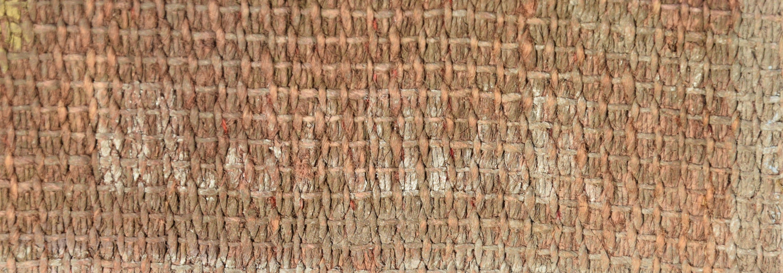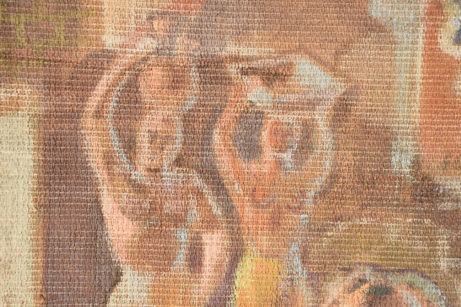 Temperamalerei auf grober Leinwand, auf Keilrahmen (verso oben links und oben rechts mit Aufhängevorrichtungen)