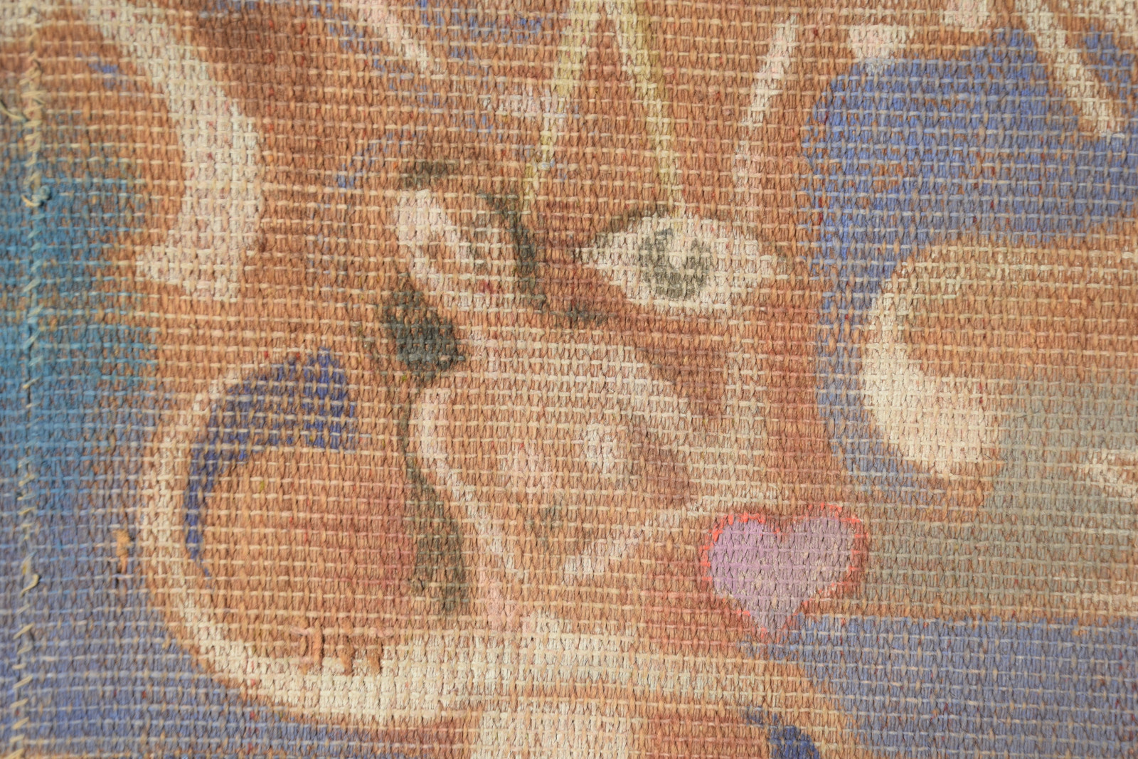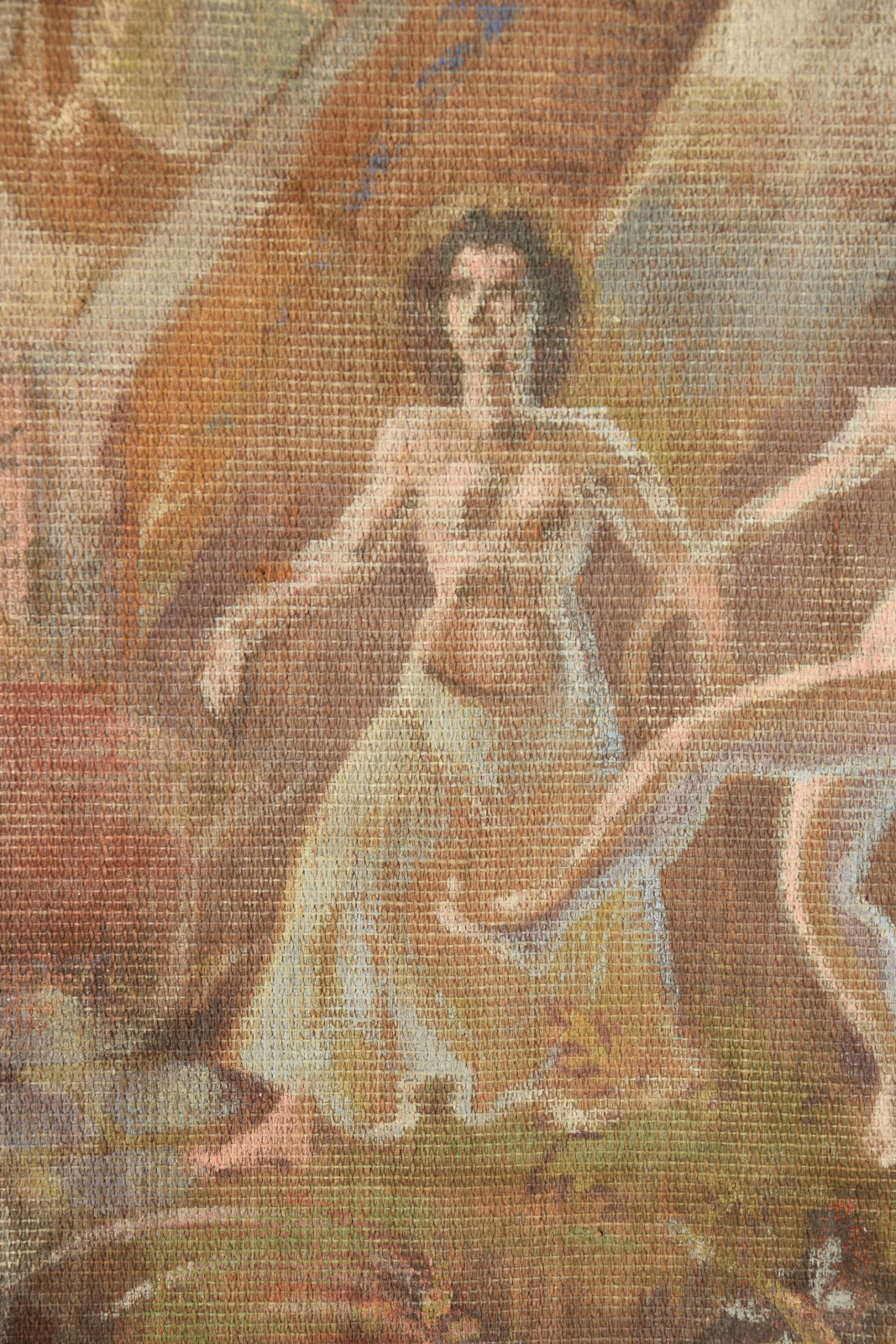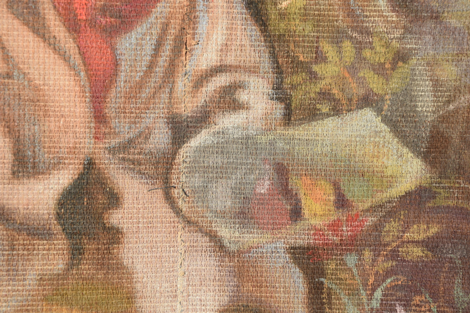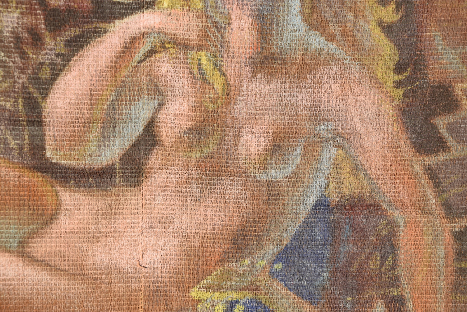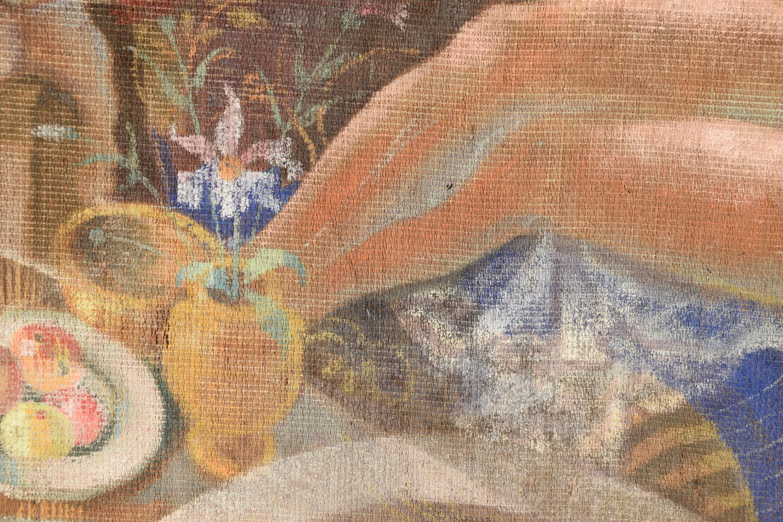 Temperamalerei auf grober Leinwand, auf Keilrahmen (verso oben links und oben rechts mit Aufhängevorrichtungen)