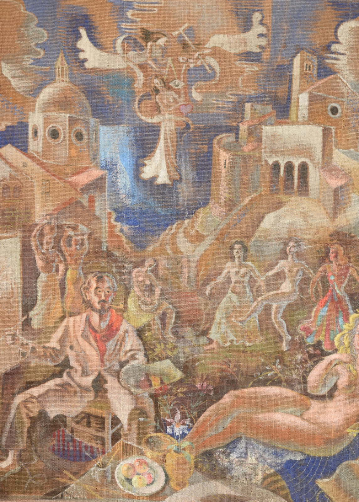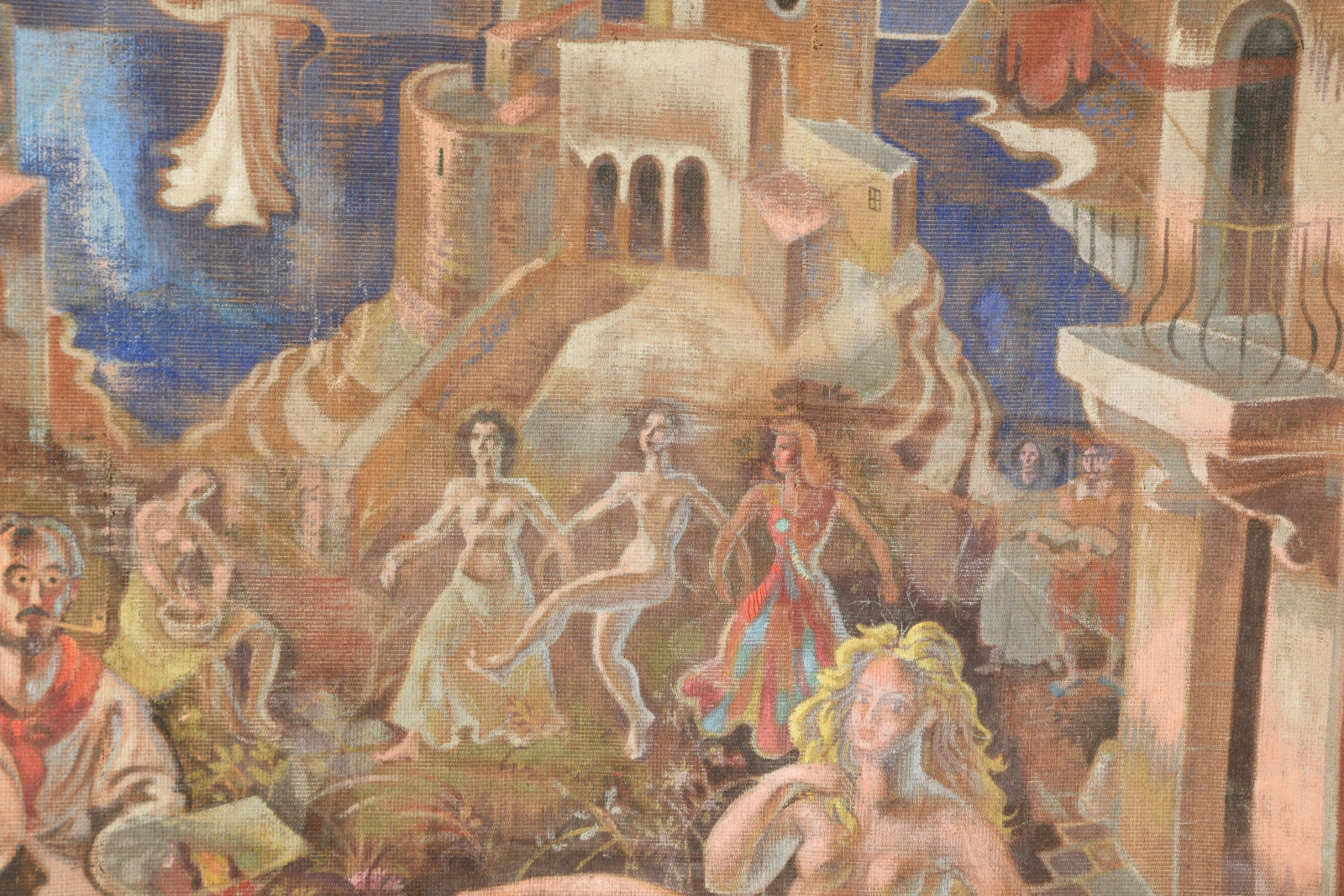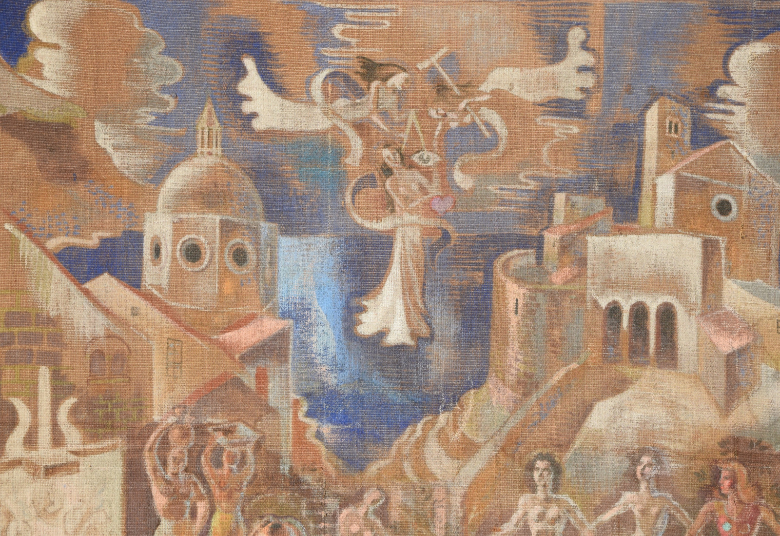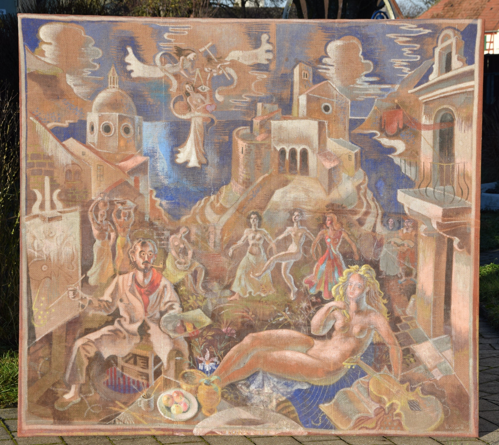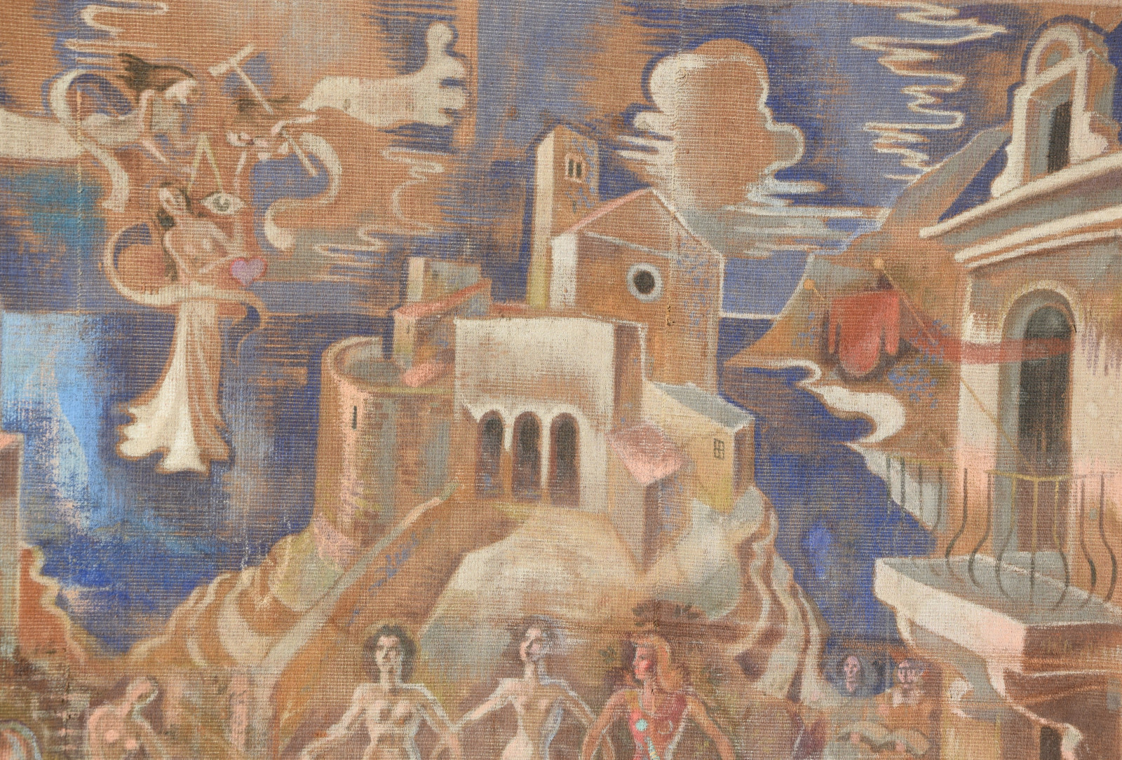 großformatige Tapisserie mit einem surreal träumerischen Motiv in mediterraner Szenerie