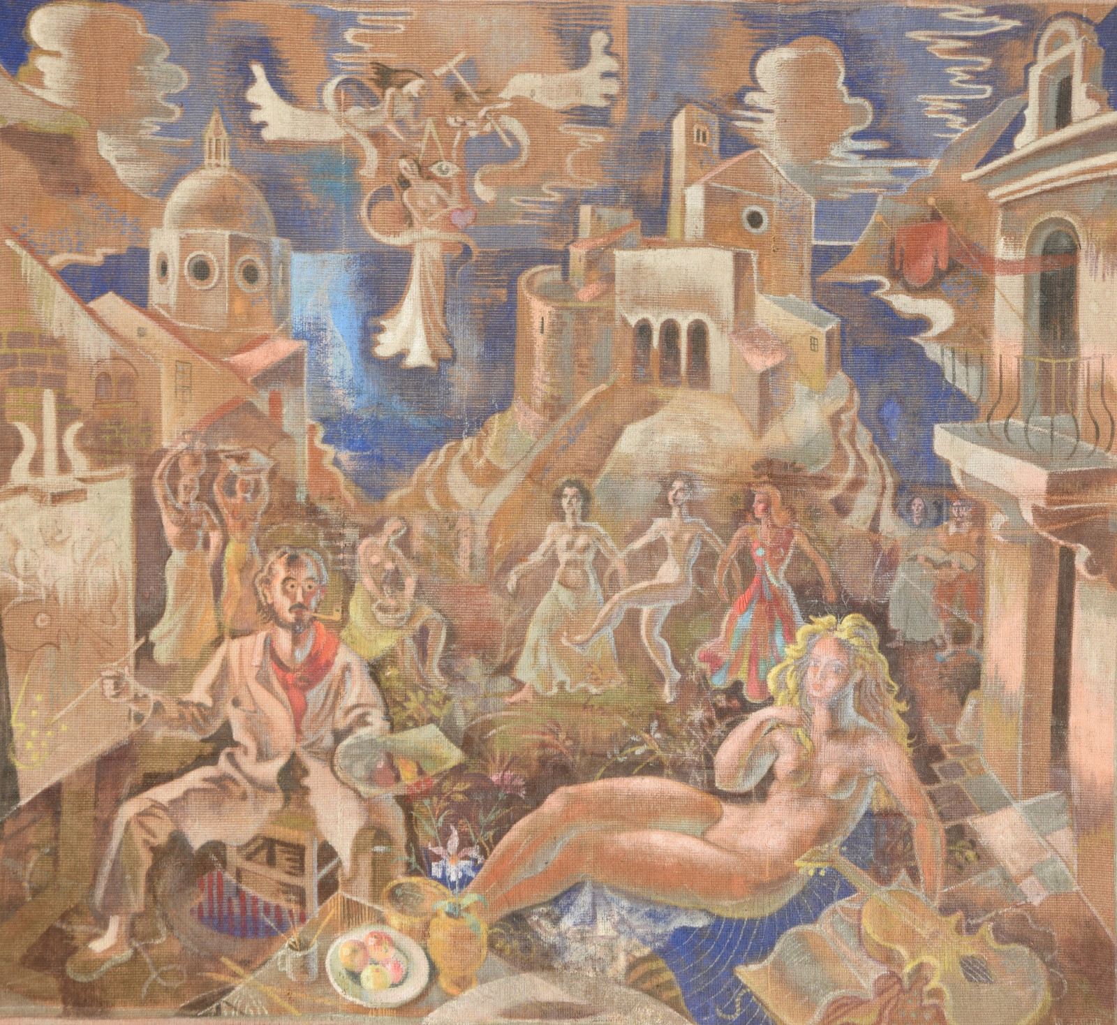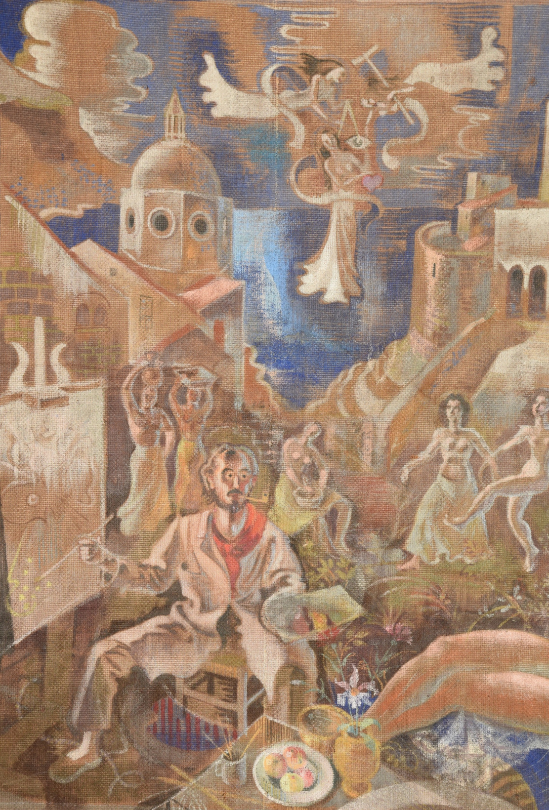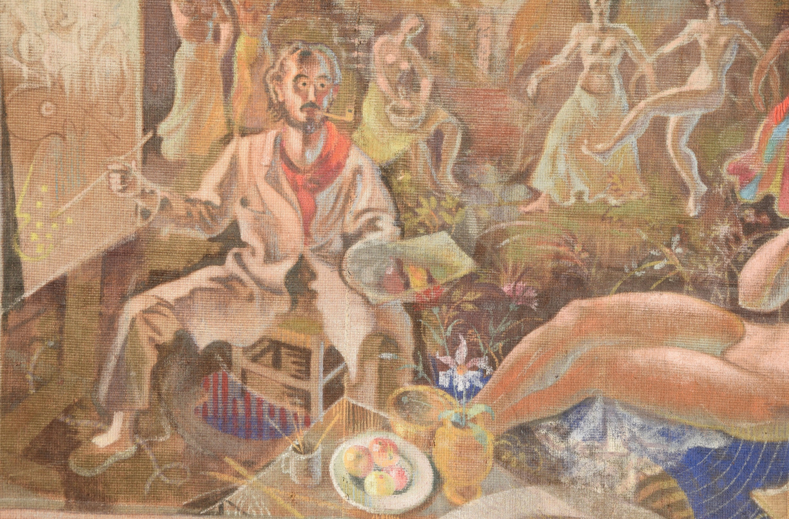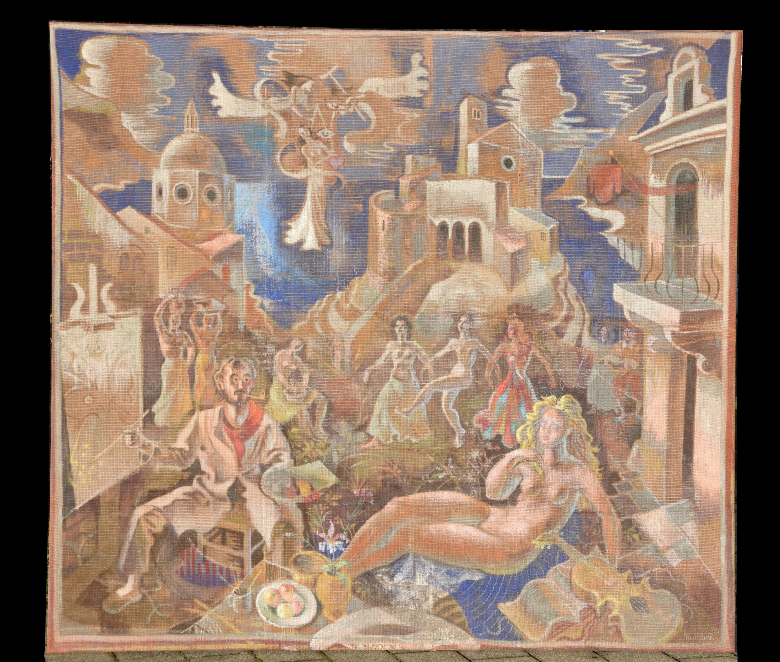 ohne Titel [großformatige Tapisserie mit einem surreal träumerischen Motiv in mediterraner Szenerie – der Künstler an der Staffelei sitzend links, rechts ein liegender Akt (das Modell) und im Hintergrund mehrere weibliche Figuren als Tänzerinnen und Korb-, Wasserträgerinnen]