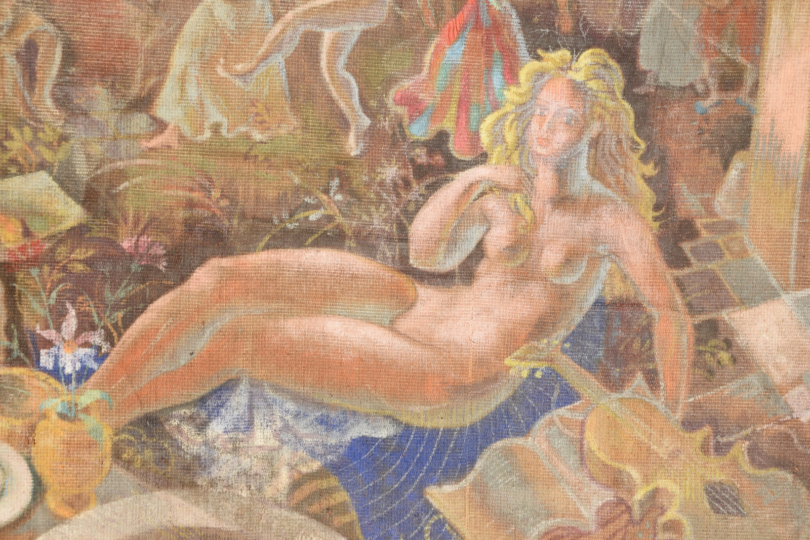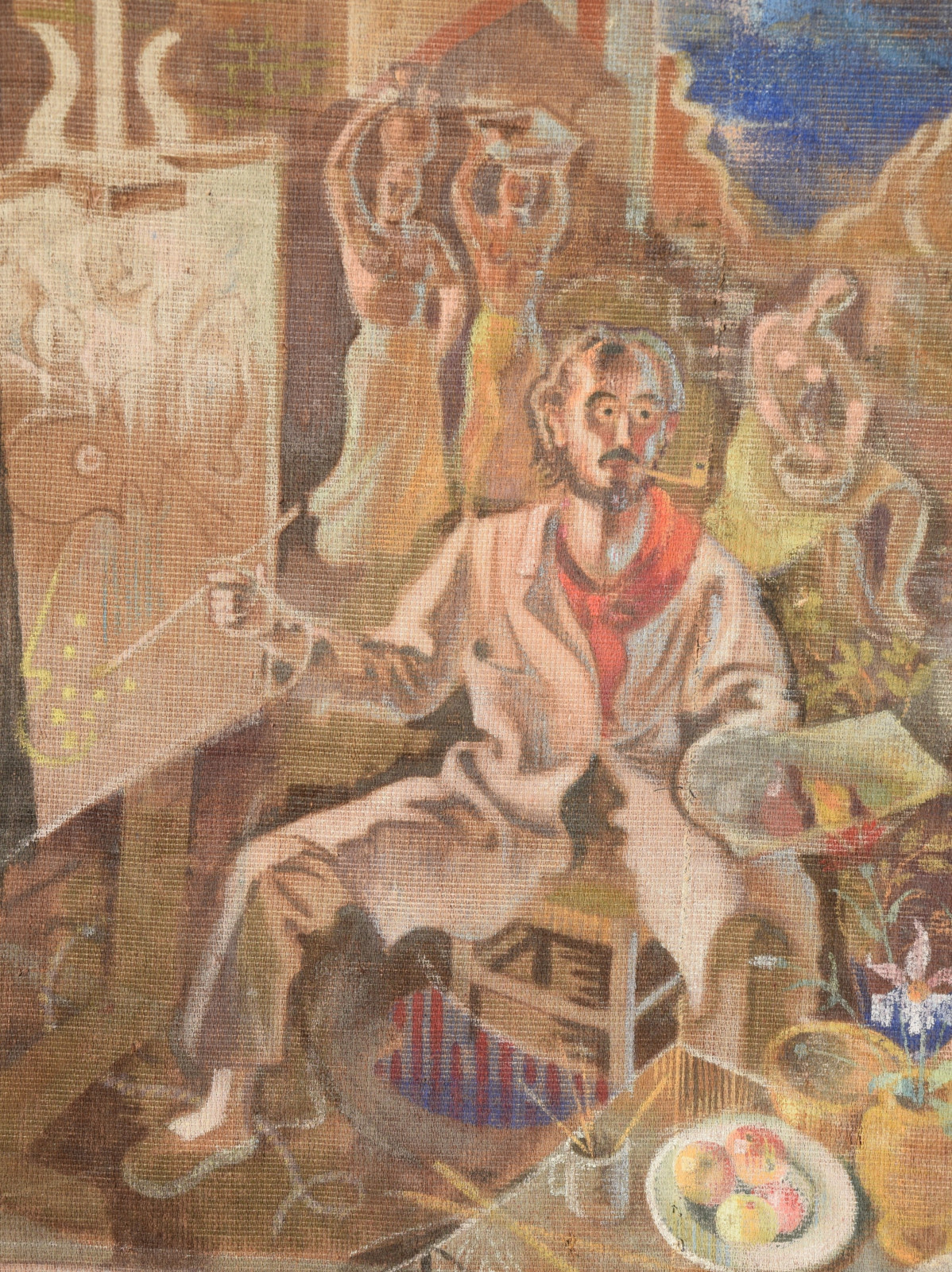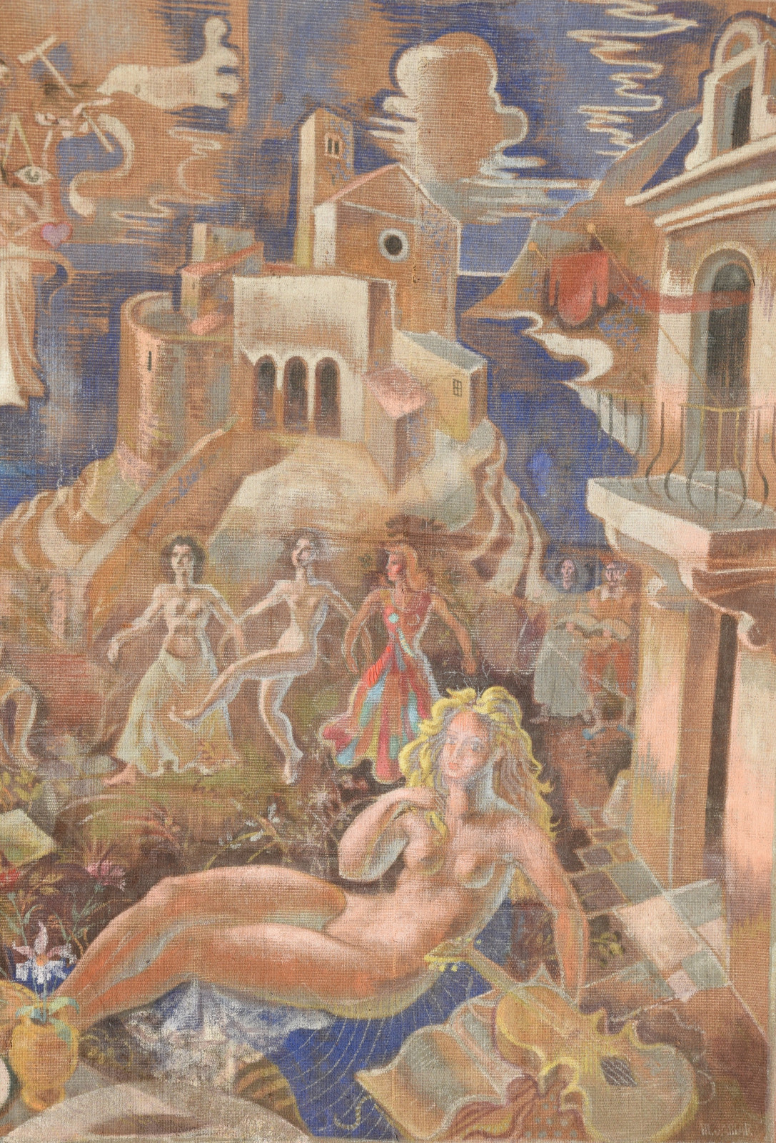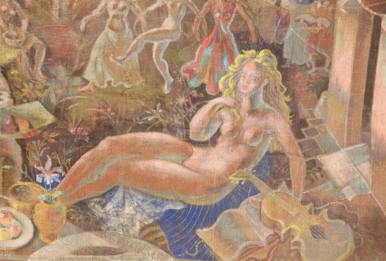 ohne Titel [großformatige Tapisserie mit einem surreal träumerischen Motiv in mediterraner Szenerie – der Künstler an der Staffelei sitzend links, rechts ein liegender Akt (das Modell) und im Hintergrund mehrere weibliche Figuren als Tänzerinnen und Korb-, Wasserträgerinnen]