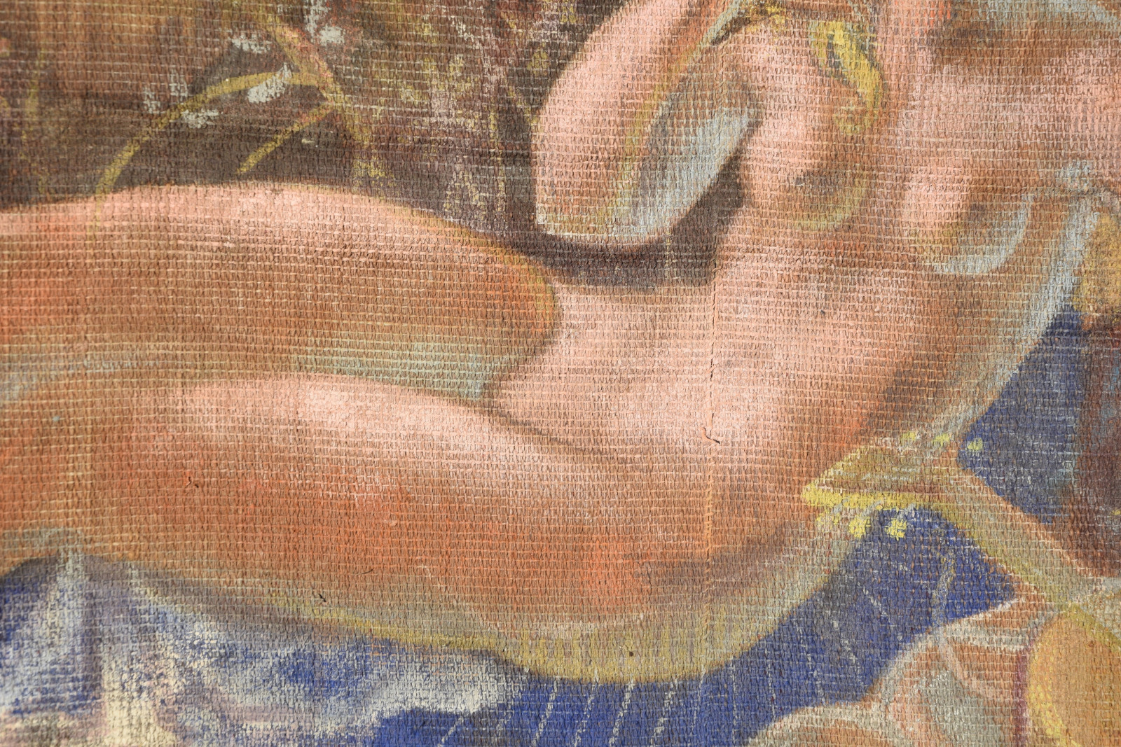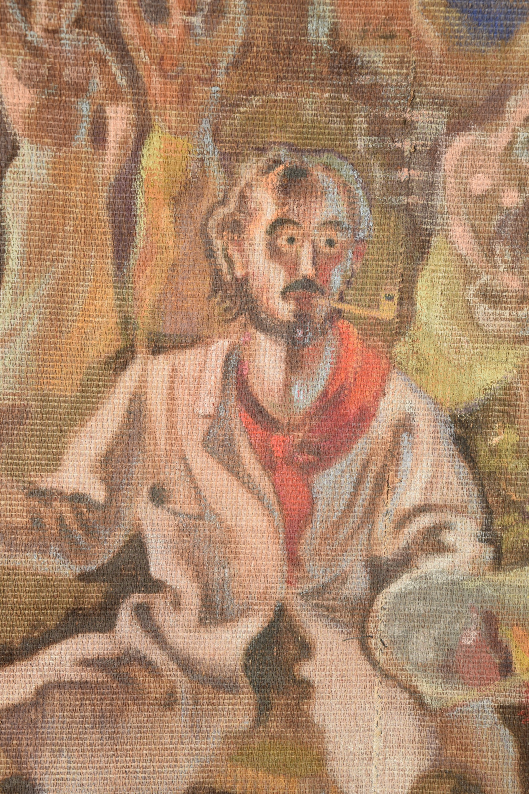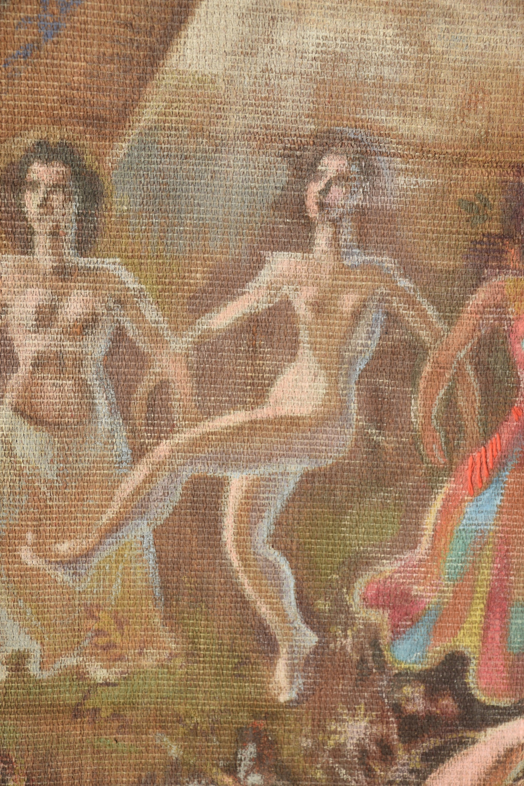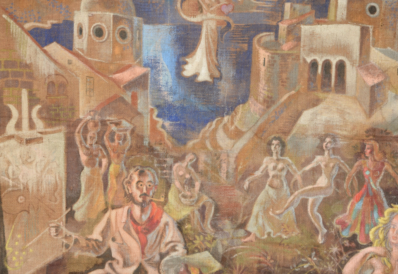 ohne Titel [großformatige Tapisserie mit einem surreal träumerischen Motiv in mediterraner Szenerie – der Künstler an der Staffelei sitzend links, rechts ein liegender Akt (das Modell) und im Hintergrund mehrere weibliche Figuren als Tänzerinnen und Korb-, Wasserträgerinnen]