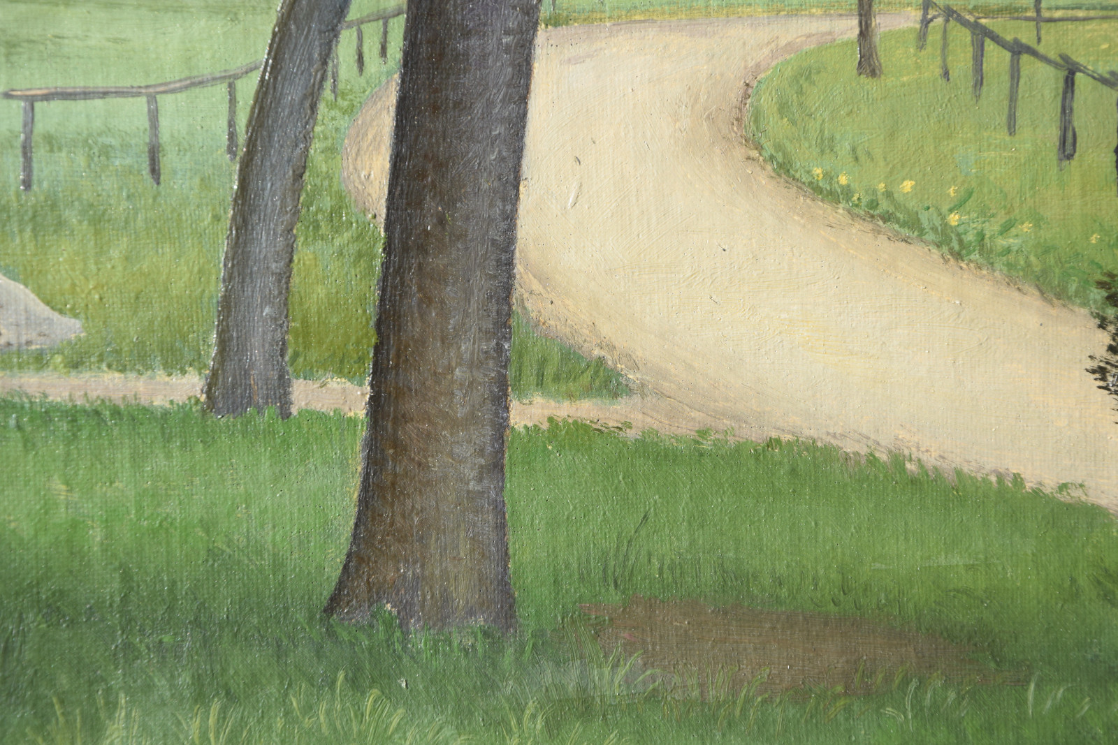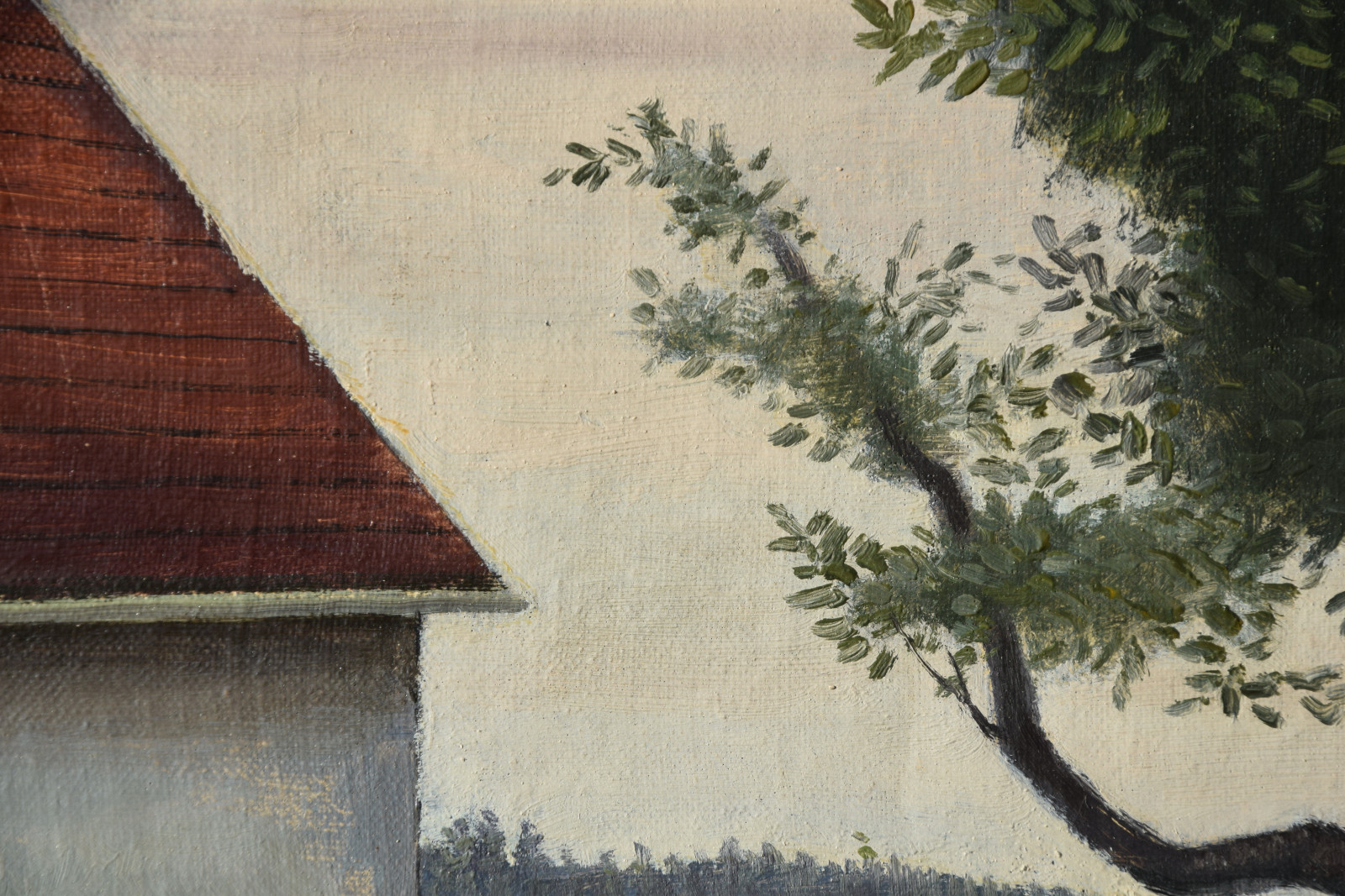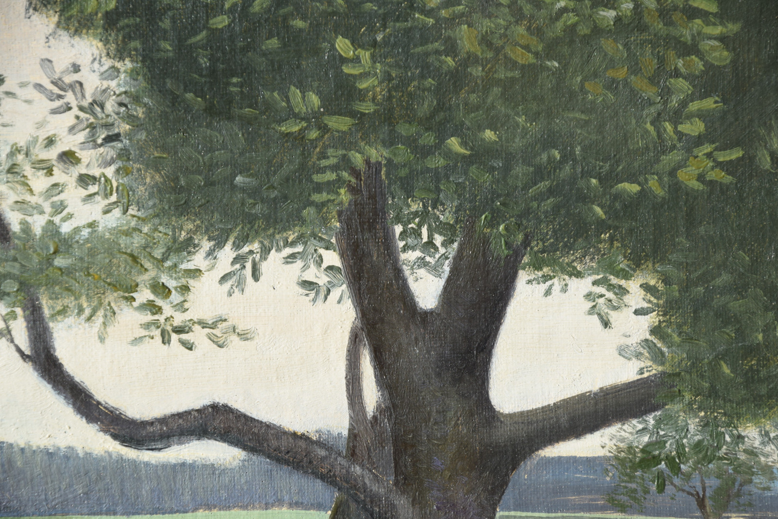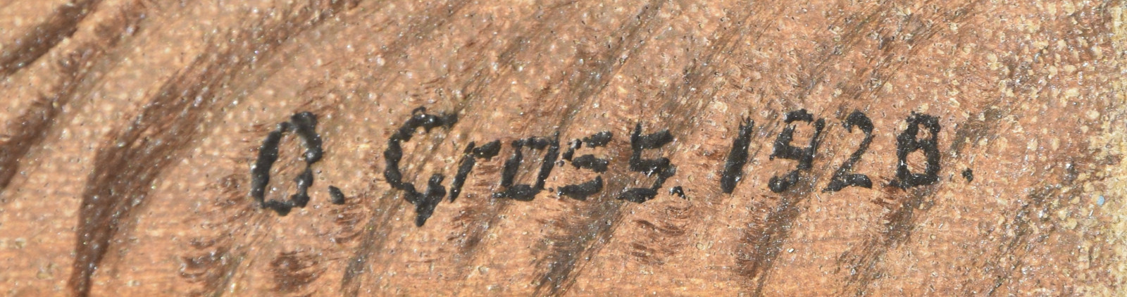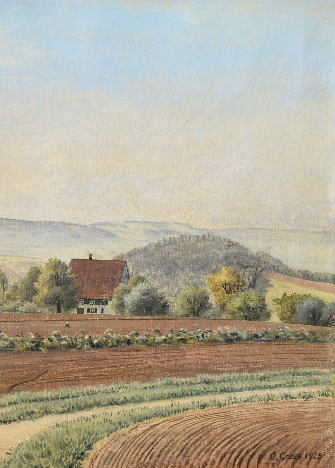 Dieses hier vorliegende Gemälde ist auf zweierlei Weise eine Besonderheit. Zum einen hat Groß, sicherlich schlicht aus Materialmangel, beide Seiten der Leinwand bemalt und zum anderen ist dieses Werk eines der seltenen frühen Zeugnisse des Künstlers, welches sich explizit in diese Phase der neusachlichen Landschaftsauffassung der späten 1920er Jahre einordnen lässt.