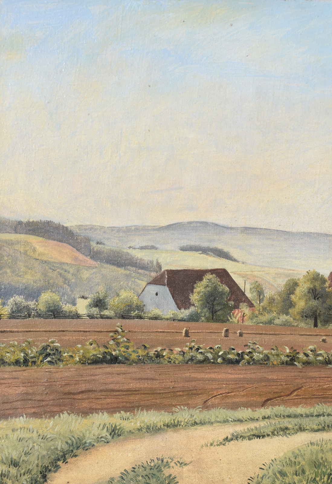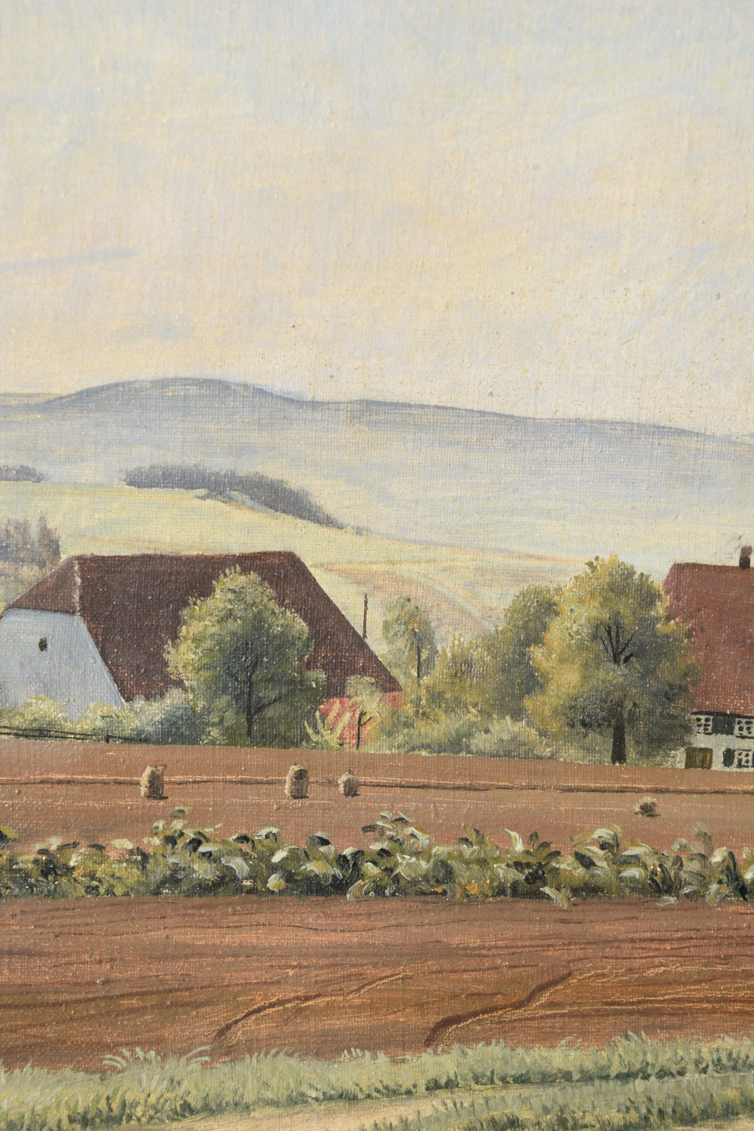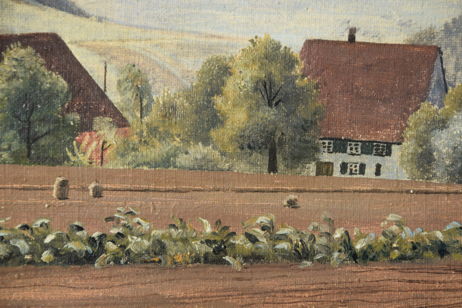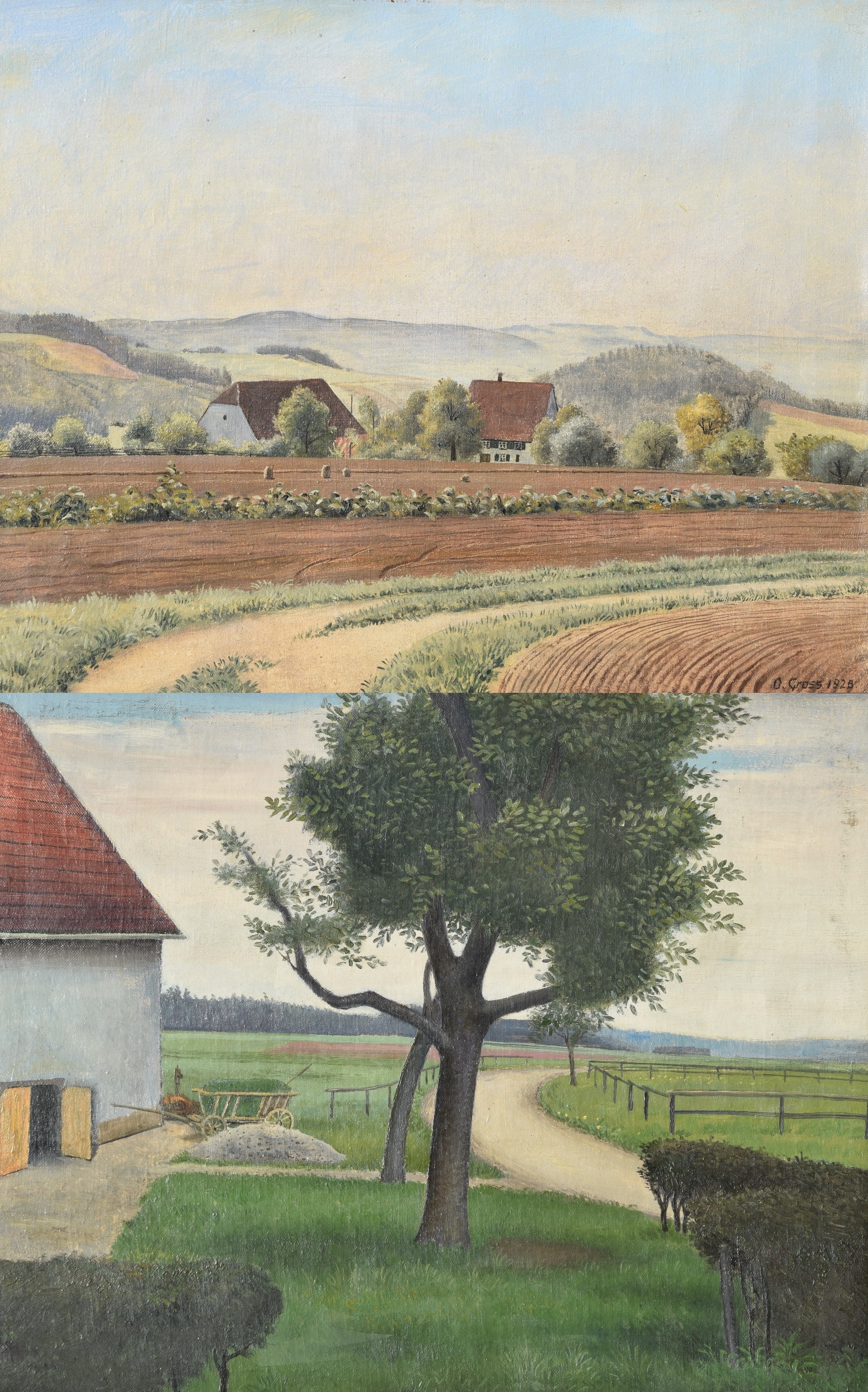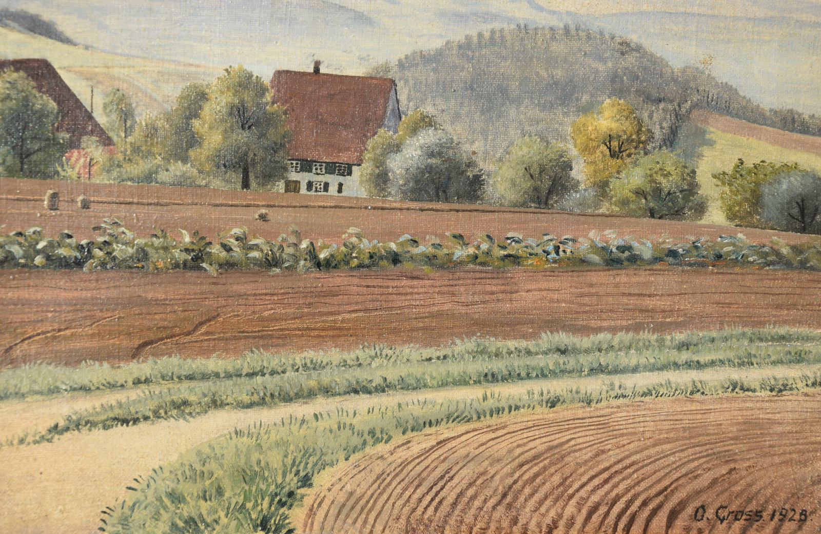 Vom Künstler wurde der weite Blick über die Felder, Ackerflächen hin zu den Gebäuden und dem Wald als Vorderseite gewählt, wodurch sich auch erklärt, dass nur diese Seite signiert und datiert (1928) ist. Demnach war die damalige Rückseite an den Rändern durch den früheren Keilrahmen verdeckt. Um nun beide Seiten sichtbar und hängbar zu machen, wurde der (noch vorhandene) Keilrahmen abgenommen und die Leinwand so gespannt, dass man bei der Hängung stets wählen kann.